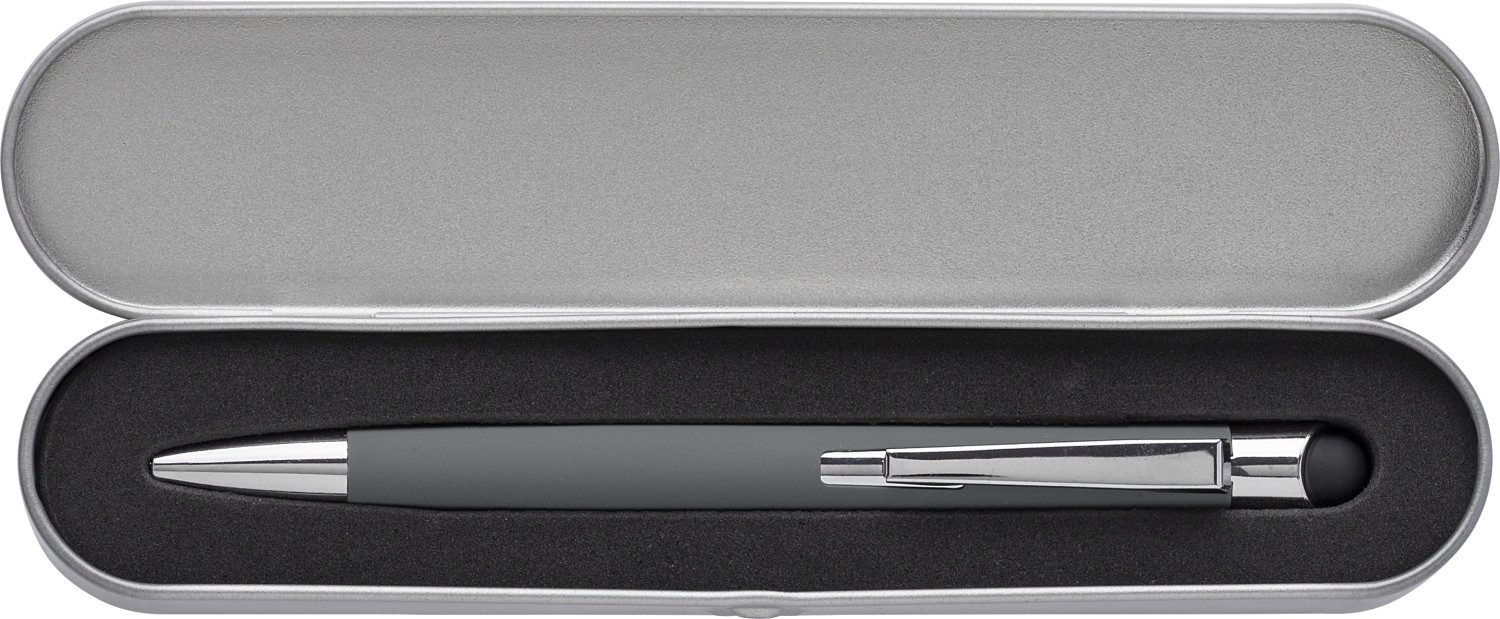 Rollerball aus Aluminium mit gummierter Griffzone, geeignet für Touchscreens. Wird in einem Stifte-Etui geliefert. Mit schwarzer Mine.