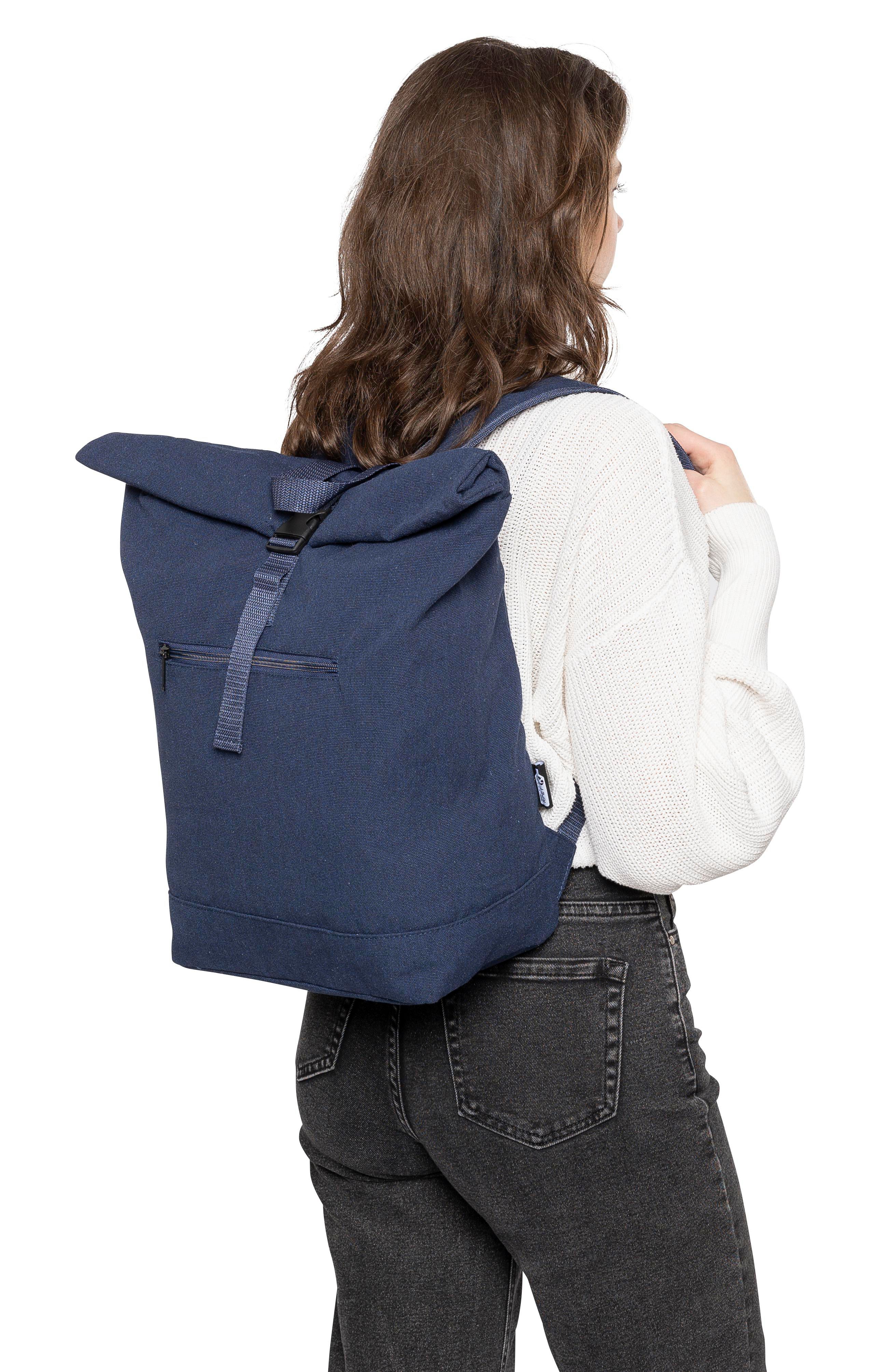 Rolltop-Rucksack aus recyceltem Poly-Baumwollgewebe (330 g / m2) mit 210D-Polyesterfutter und Kunststoffschnallenverschluss. Er hat ein Fassungsvermögen von 15 Litern, ein großes Reißverschlussfach mit einem 15”-Laptopfach, zwei Innenfächer und ein Außenfach. Zur Ausstattung gehören eine Trageschlaufe oben, gepolsterte, verstellbare Schultergurte und eine kleine Fronttasche mit Reißverschluss. Tragfähigkeit: 14 kg. Inklusive Etikett.