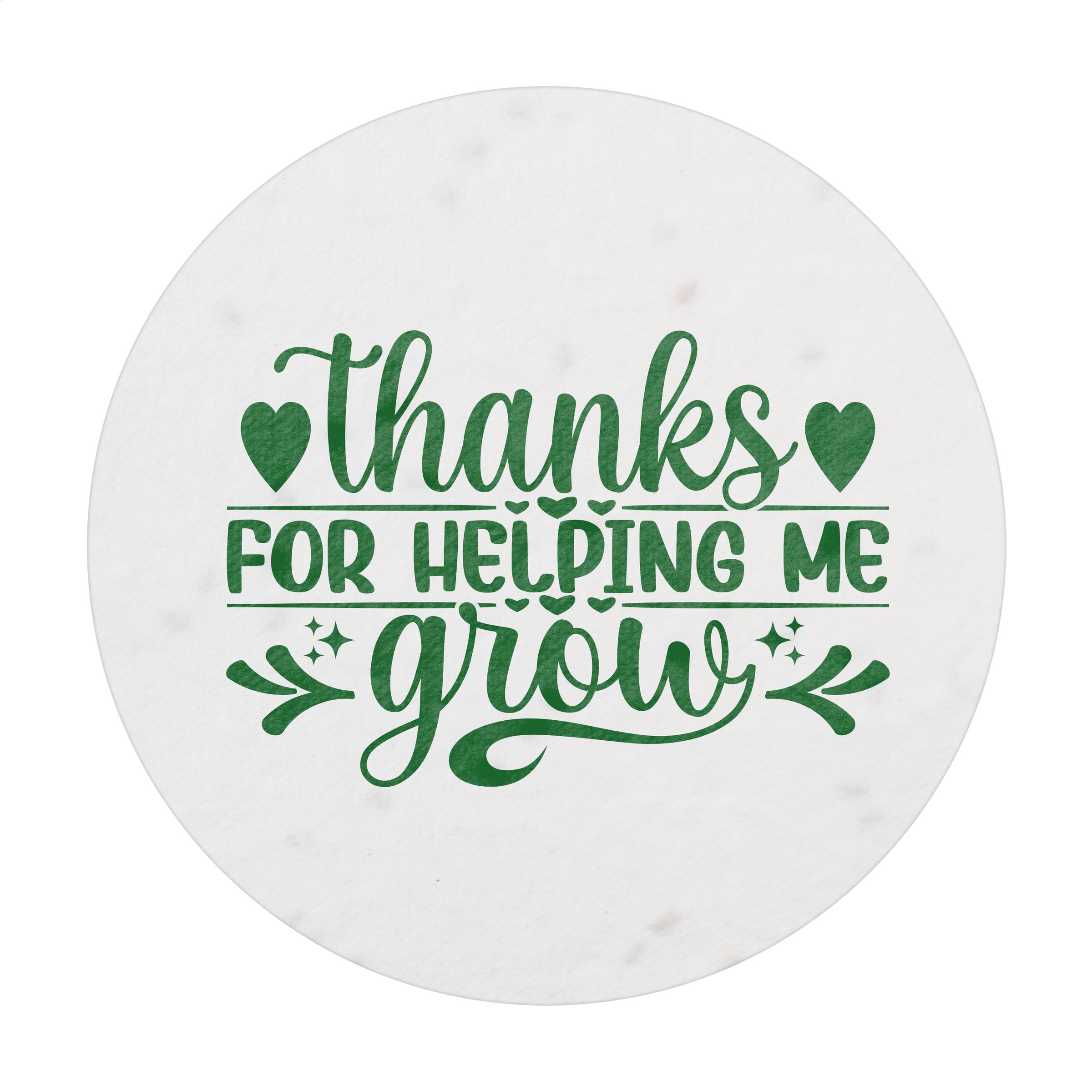 Runde Untersetzer aus biologisch abbaubarem Papier mit Blumensamen (200 g / m² Samenpapier). Inklusive vollfarbigem Druck auf einer Seite, den Sie vollständig an Ihre Marke oder Botschaft anpassen können. Ein (vollfarbiger) Druck auf der zweiten Seite ist gegen Mehrpreis möglich. Die Blumensamen-Mischung besteht aus: Godetia, Mesembrantium, Petunia, Gypsophila, Antirrhinum, Allysum Bentany. Nach Gebrauch können die Untersetzer in die Erde gepflanzt werden, wo sie zu Blumen heranwachsen. Verleihen Sie Ihrer Marke etwas Farbe! Durch die Verarbeitung von Samen und recycelten Materialien sind kleine Unregelmäßigkeiten im Material sichtbar. Made in Europe.