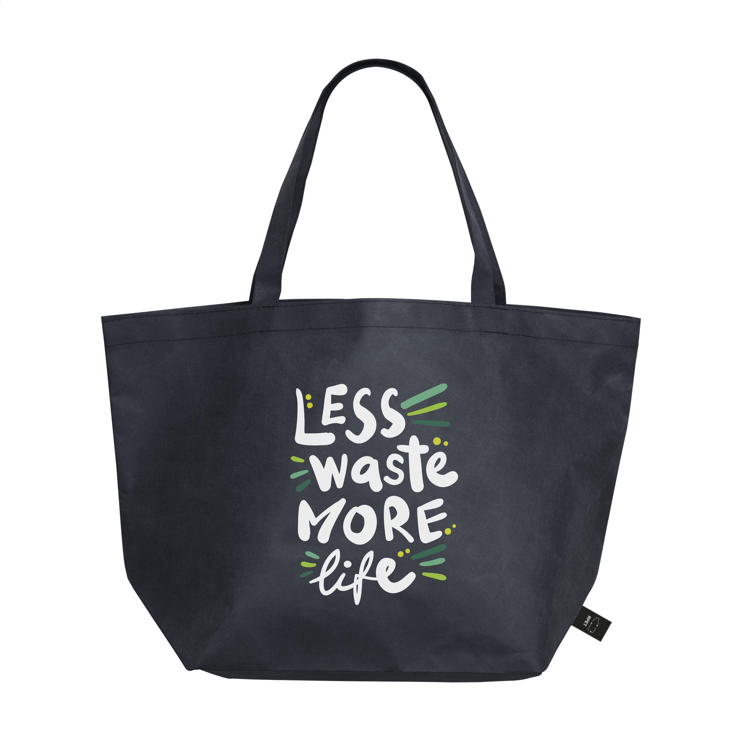 Großzügige RPET-Vlies-Einkaufs- und Strandtasche (80 g/m²), hergestellt aus recycelten PET-Flaschen. Eine breite Tasche, sowohl stark als auch leicht, mit langen Griffen. GRS-zertifiziert. Recyceltes Material insgesamt: 98%. Fassungsvermögen ca. 25 Liter.