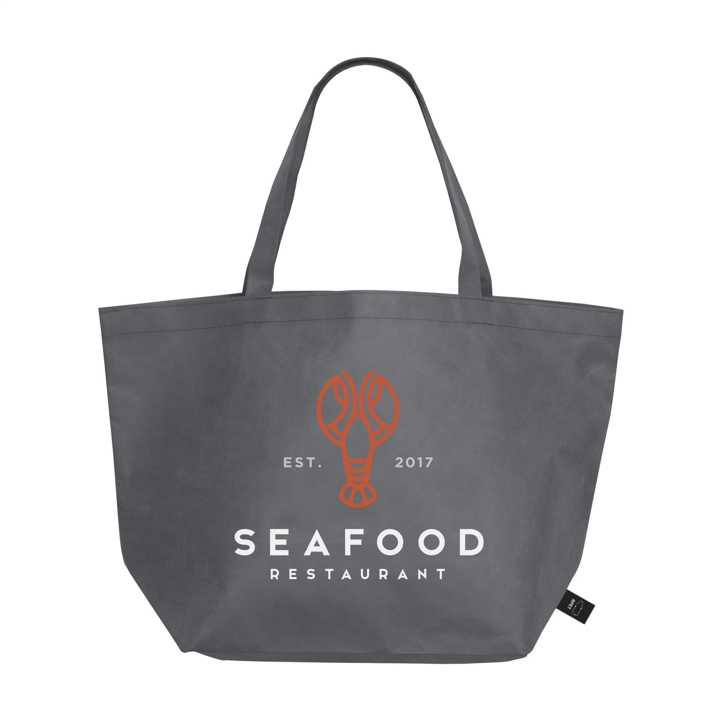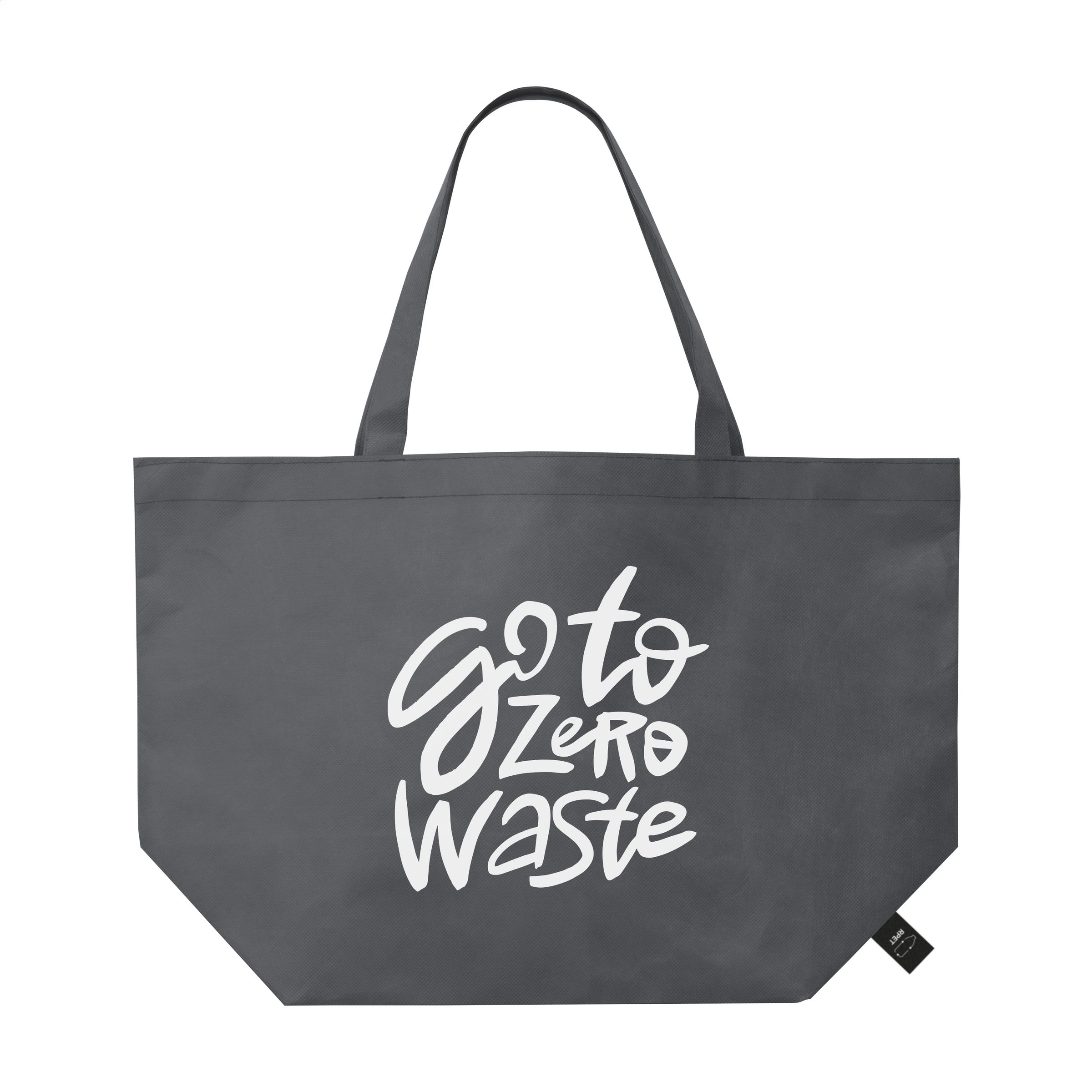 Großzügige RPET-Vlies-Einkaufs- und Strandtasche (80 g / m²), hergestellt aus recycelten PET-Flaschen. Eine breite Tasche, sowohl stark als auch leicht, mit langen Griffen. GRS-zertifiziert. Recyceltes Material insgesamt: 98%. Fassungsvermögen ca. 25 Liter.