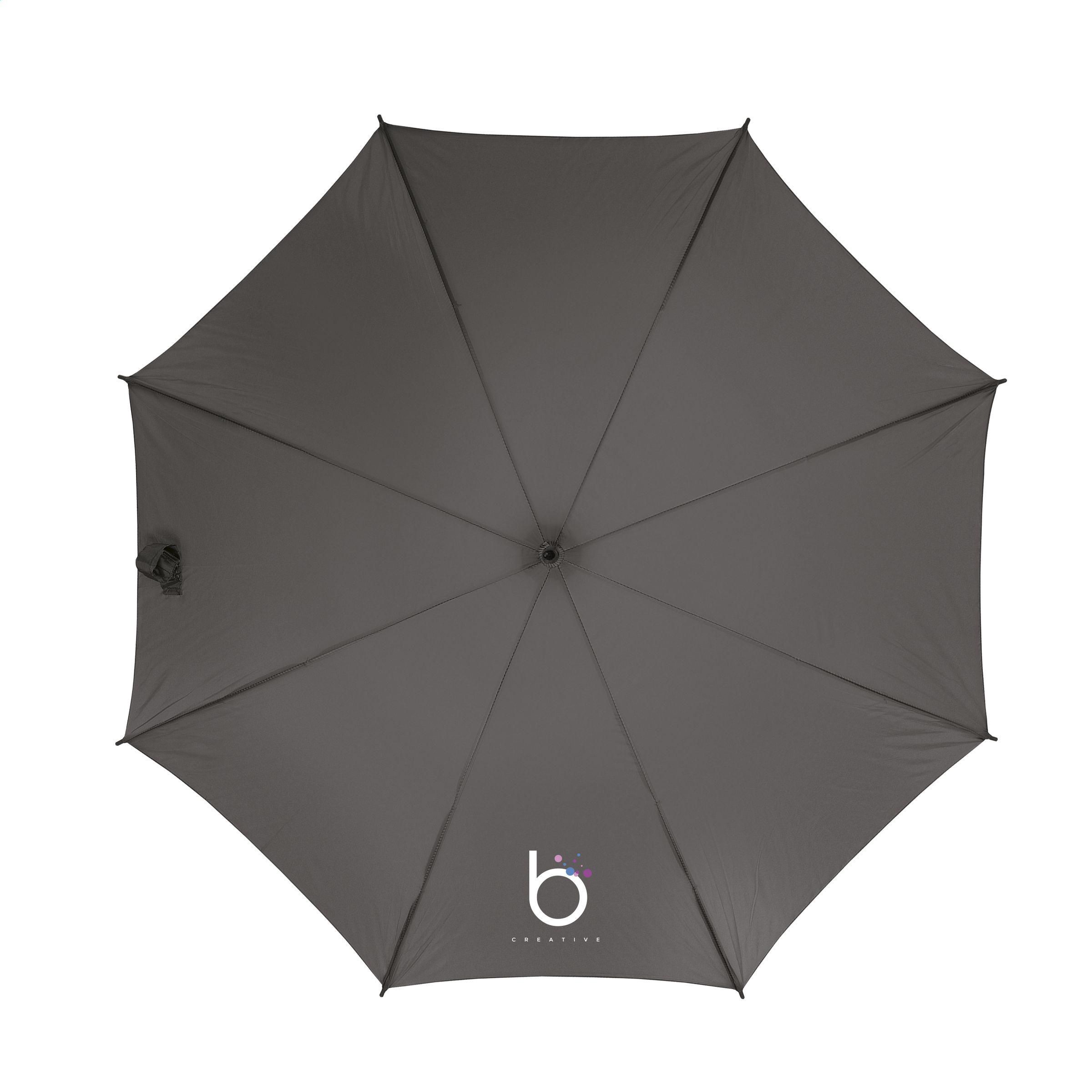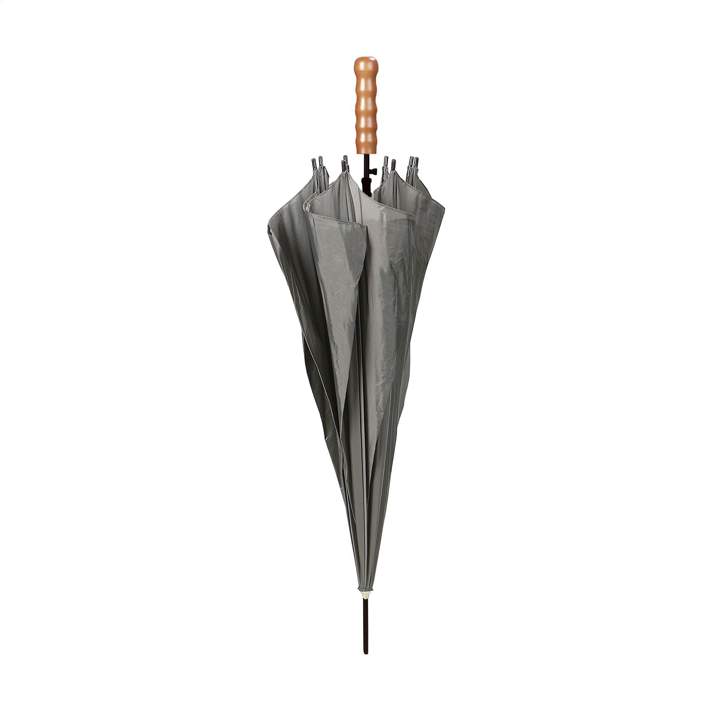 Regenschirm mit automatischer Teleskopöffnung, 190 T Polyesterbespannung, Metallgestell/-schaft, Holzgriff und Klettverschluss.