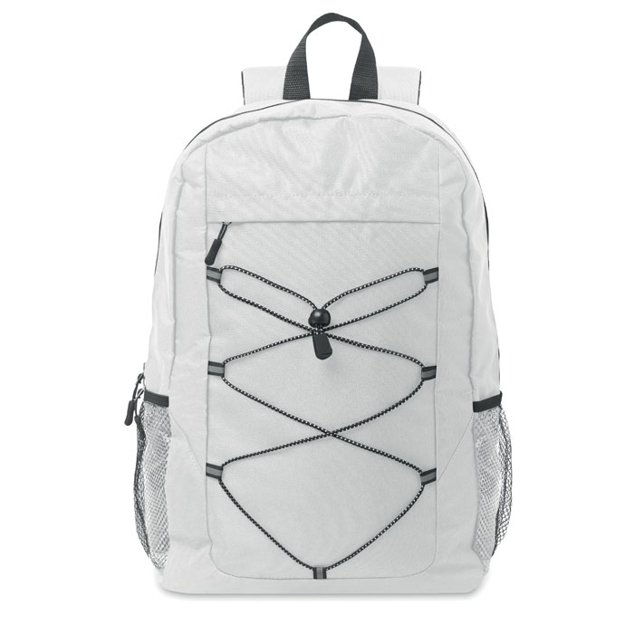 Rucksack mit Schnürung. Fronttasche mit Reißverschluss. Netztaschen auf beiden Seiten. 600D RPET-Polyester.