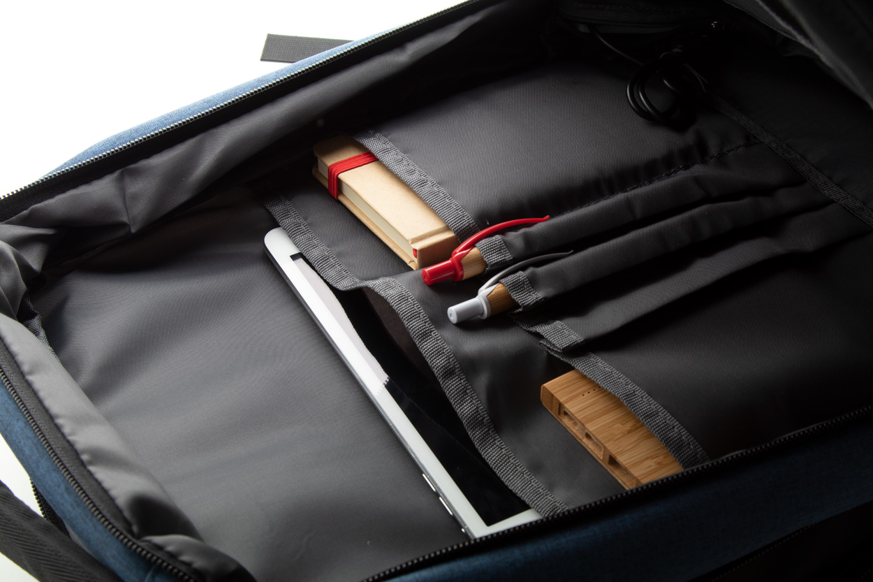 Zweifarbiger Rucksack mit mehreren Reißverschlussfächern, Organizer-Innenfächer, gepolstertem Laptopfach (17"), ergonomischen Rücken und Schultergurten, Anti-Diebstahl-Tasche, Trolleygurt und eingearbeiteter USB-Verbindung für Powerbanks. Material: 400D Polyester.