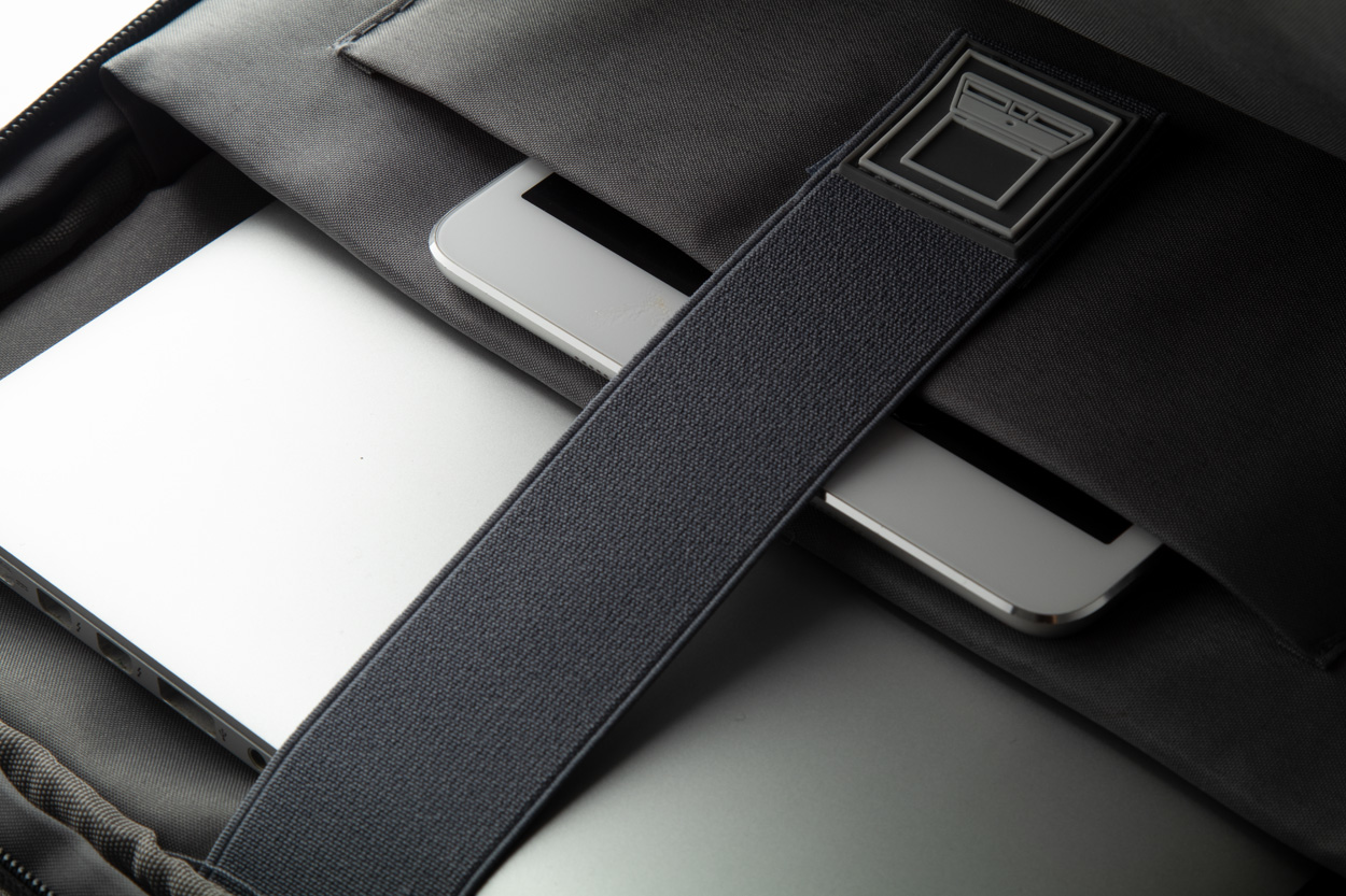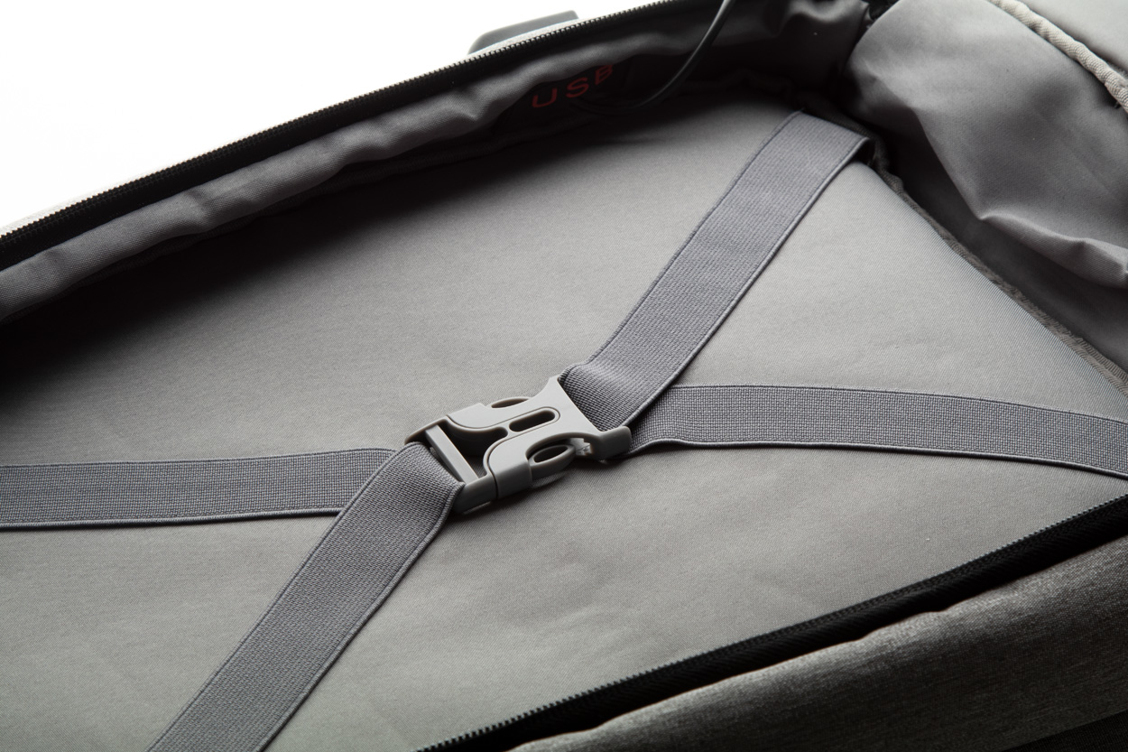 Wasserdichter Rucksack mit mehreren Reißverschlussfächern, gepolstertem Laptop- (15") und Tabletfach, ergonomischen Rücken und Schultergurten, Anti-Diebstahl-Tasche, Trolleygurt und eingearbeiteter USB-Verbindung für Powerbanks. Matieal: 300D Oxford-Polyester.