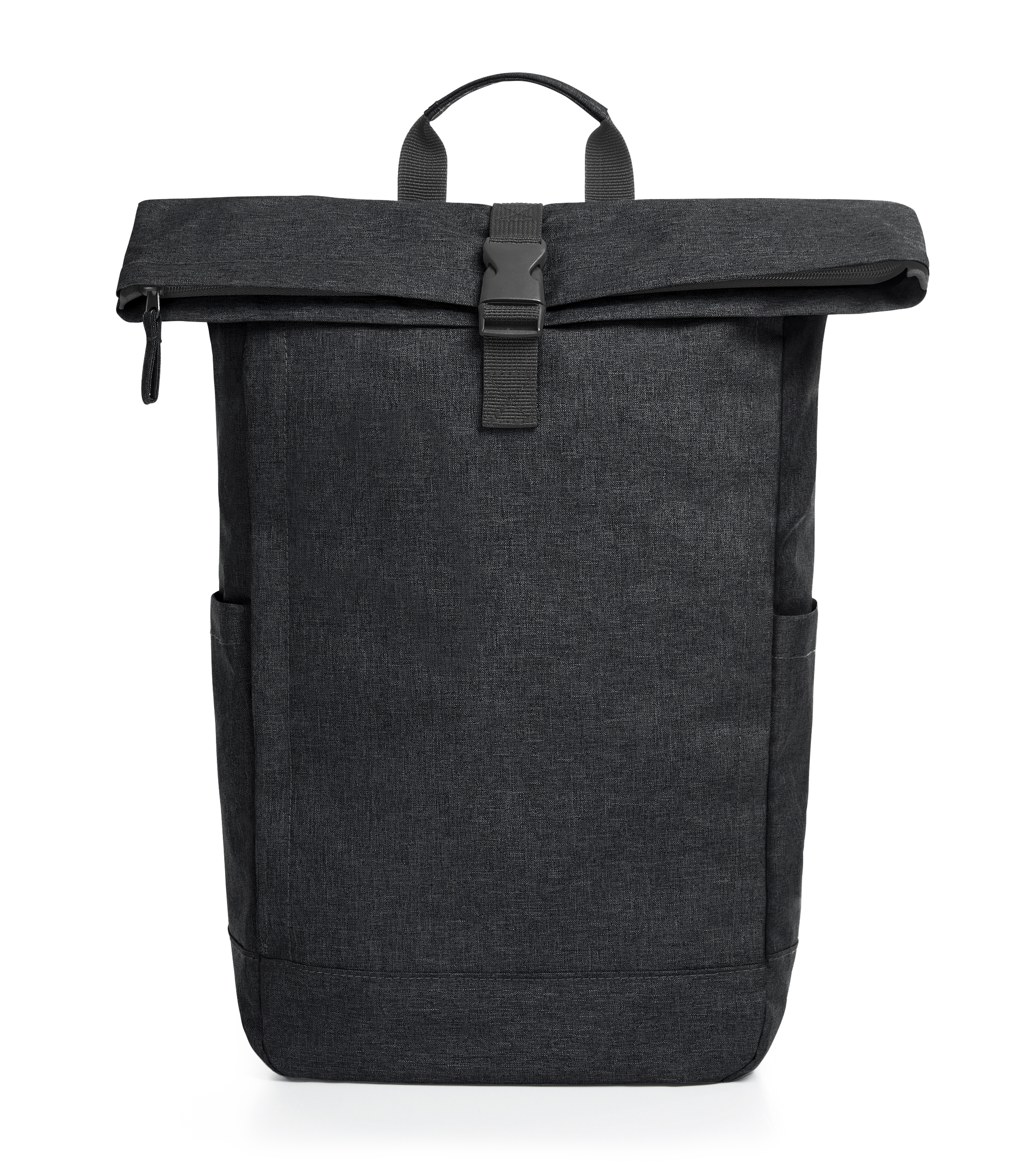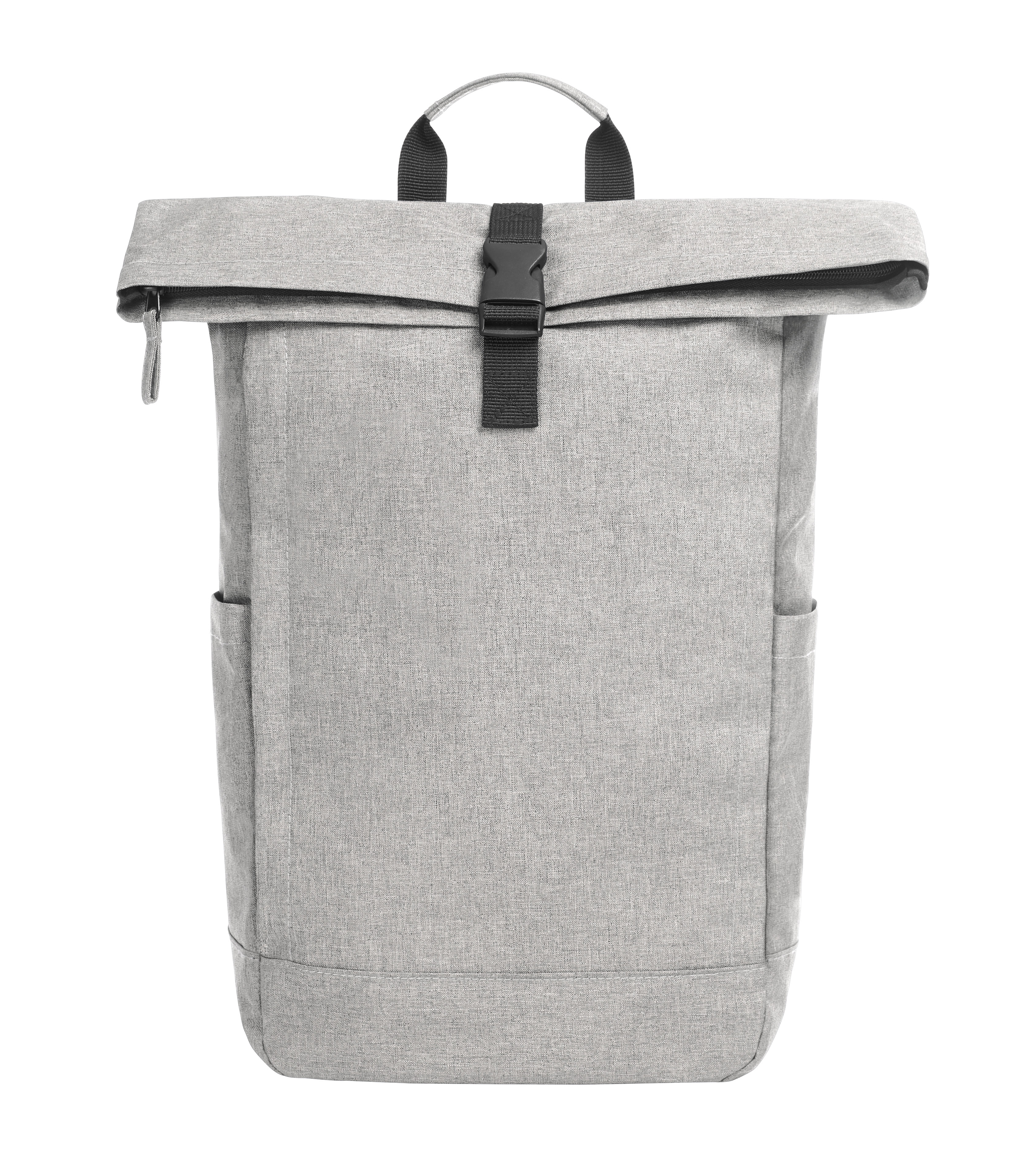 Urbaner Rucksack mit Reißverschluss-Hauptfach und Steckverschluss; rPET-Obermaterial; gepolstertes Einsteckfach und Organizer-Elemente innen; seitliche Reißverschluss-Vortasche; zwei seitliche Einsteckfächer für z. B. Trinkflaschen; rückseitige Reißverschluss-Tasche; gepolstertes Tragesystem; Handgriff