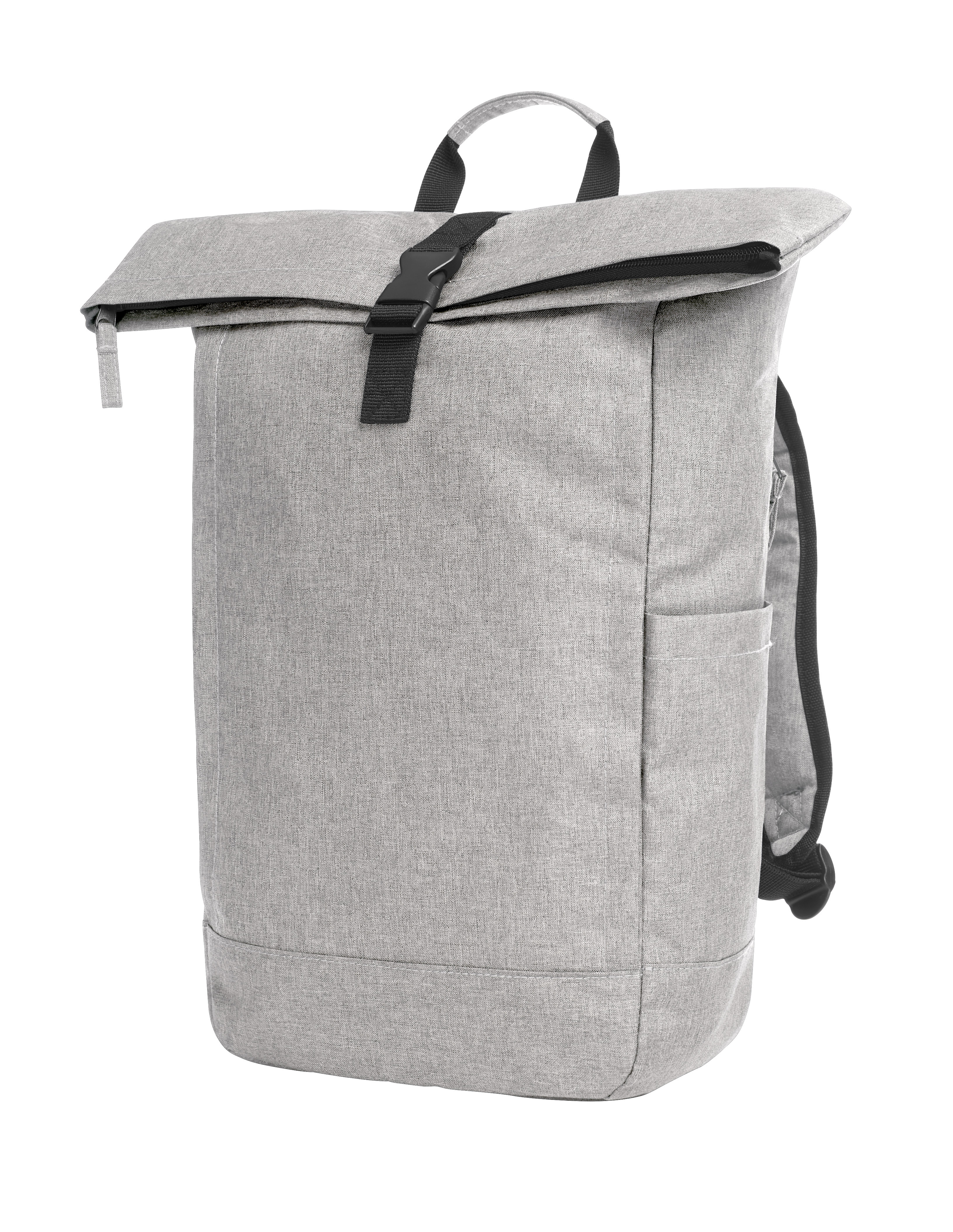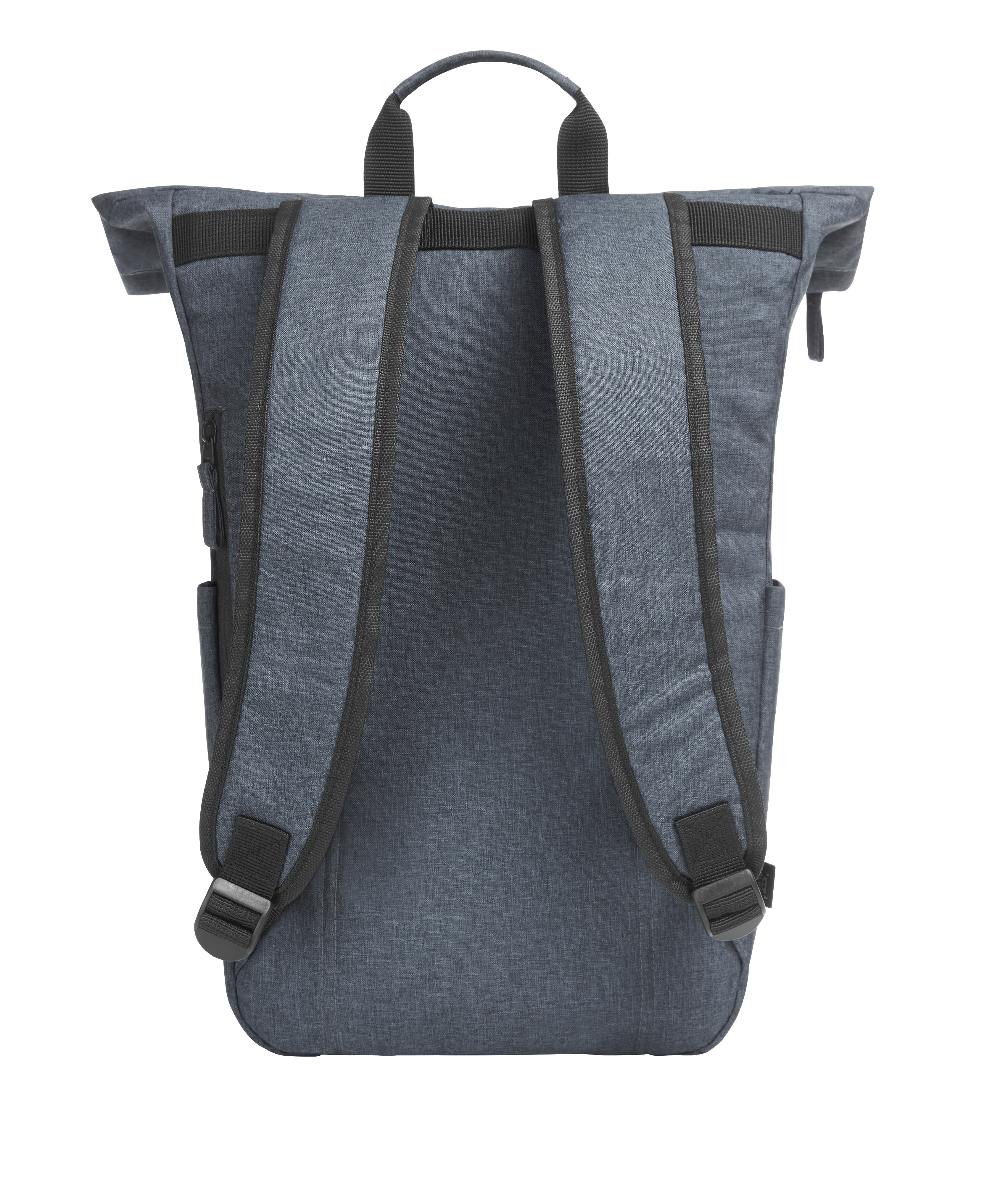 Urbaner Rucksack mit Reißverschluss-Hauptfach und Steckverschluss; rPET-Obermaterial; gepolstertes Einsteckfach und Organizer-Elemente innen; seitliche Reißverschluss-Vortasche; zwei seitliche Einsteckfächer für z. B. Trinkflaschen; rückseitige Reißverschluss-Tasche; gepolstertes Tragesystem; Handgriff