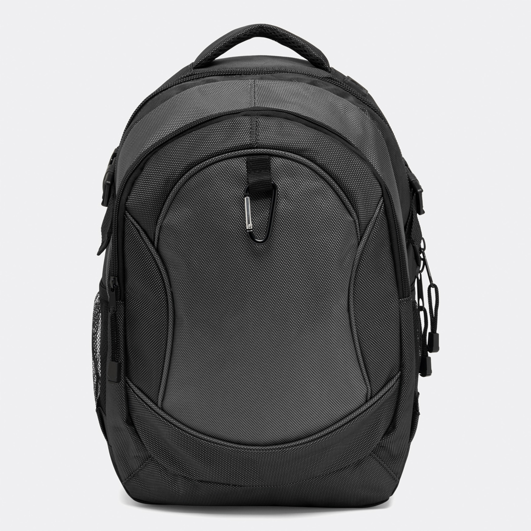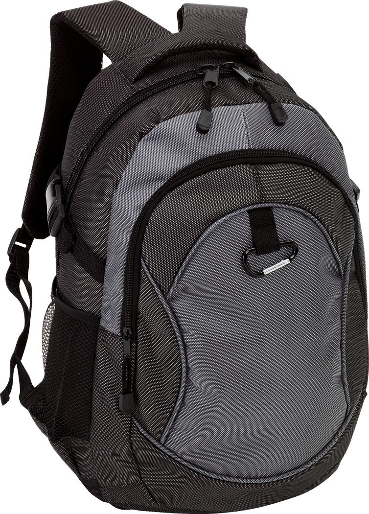 Rucksack HIGH-CLASS: Reißverschluss-Vorfach außen mit Karabinerhaken, Reißverschluss-Hauptfach mit Steckfach und kleiner Reißverschlusstasche innen sowie mit Kopfhörer-Kabelausgang, 2 seitliche Netzfächer und Kompressionsgurte, verstärkter Tragegriff, Schultergurte und Rückenbereich mit komfortabler Polsterung, der Karabiner ist NICHT als Sicherung beim Klettern geeignet