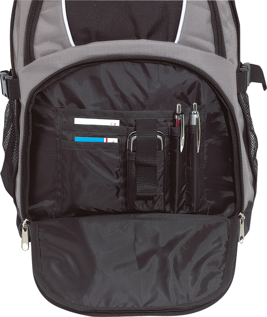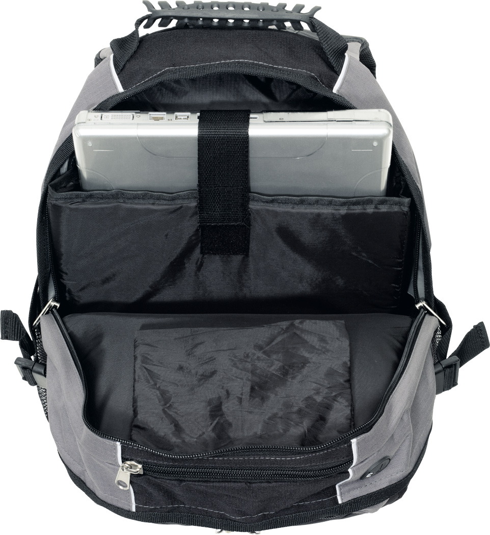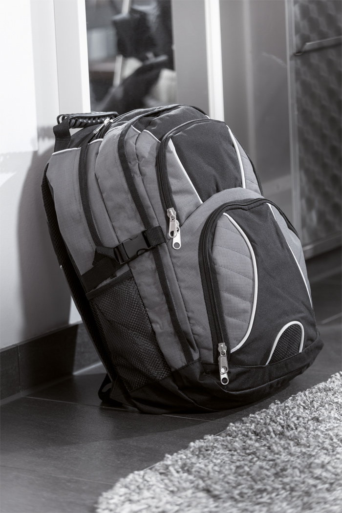 Rucksack HYPE: 2 Reißverschluss-Vorfächer – eins davon mit kleinem Organizerfach, 2 Reißverschluss-Hauptfächer; eines mit gepolstertem Notebookfach, das andere Reißverschluss-Hauptfach mit Kabelausgang und extra gepolstertem Fach für z. B. Smartphone oder andere Geräte, 1 Reißverschluss-Schlüsselfach, 2 seitliche Netzeinsteckfächer und Kompressionsgurte, verstärkter Tragegriff, gepolsterte Schultergurte und Rückenbereich