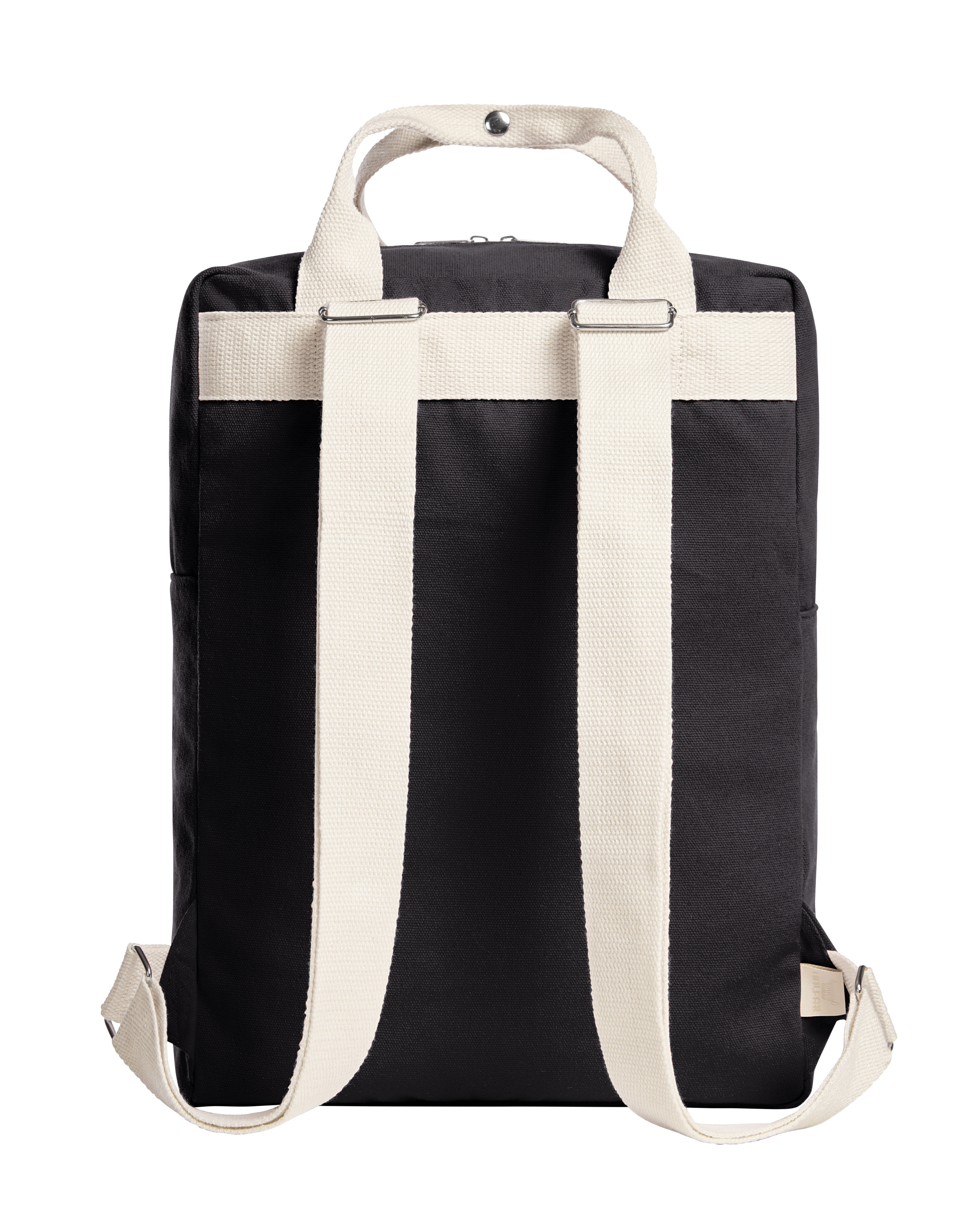 Urbaner Rucksack mit wertigen Metall-Accessoires; Hauptfach mit 2-Wege-Reißverschluss; flaches Einsteckfach innen; Vortasche mit Klettverschluss; Handgriffe mit Druckknopf; längenverstellbarer Baumwoll-Träger