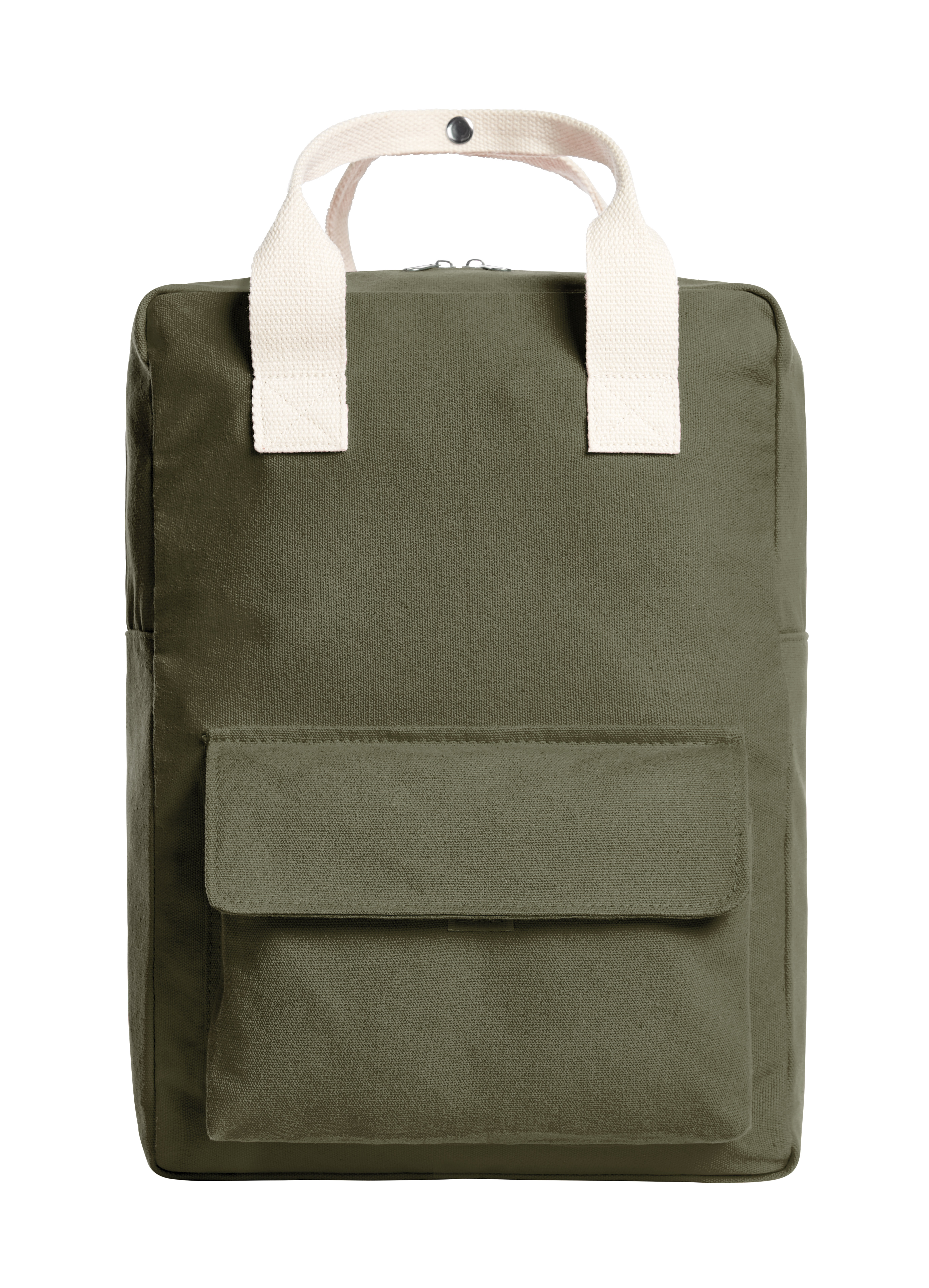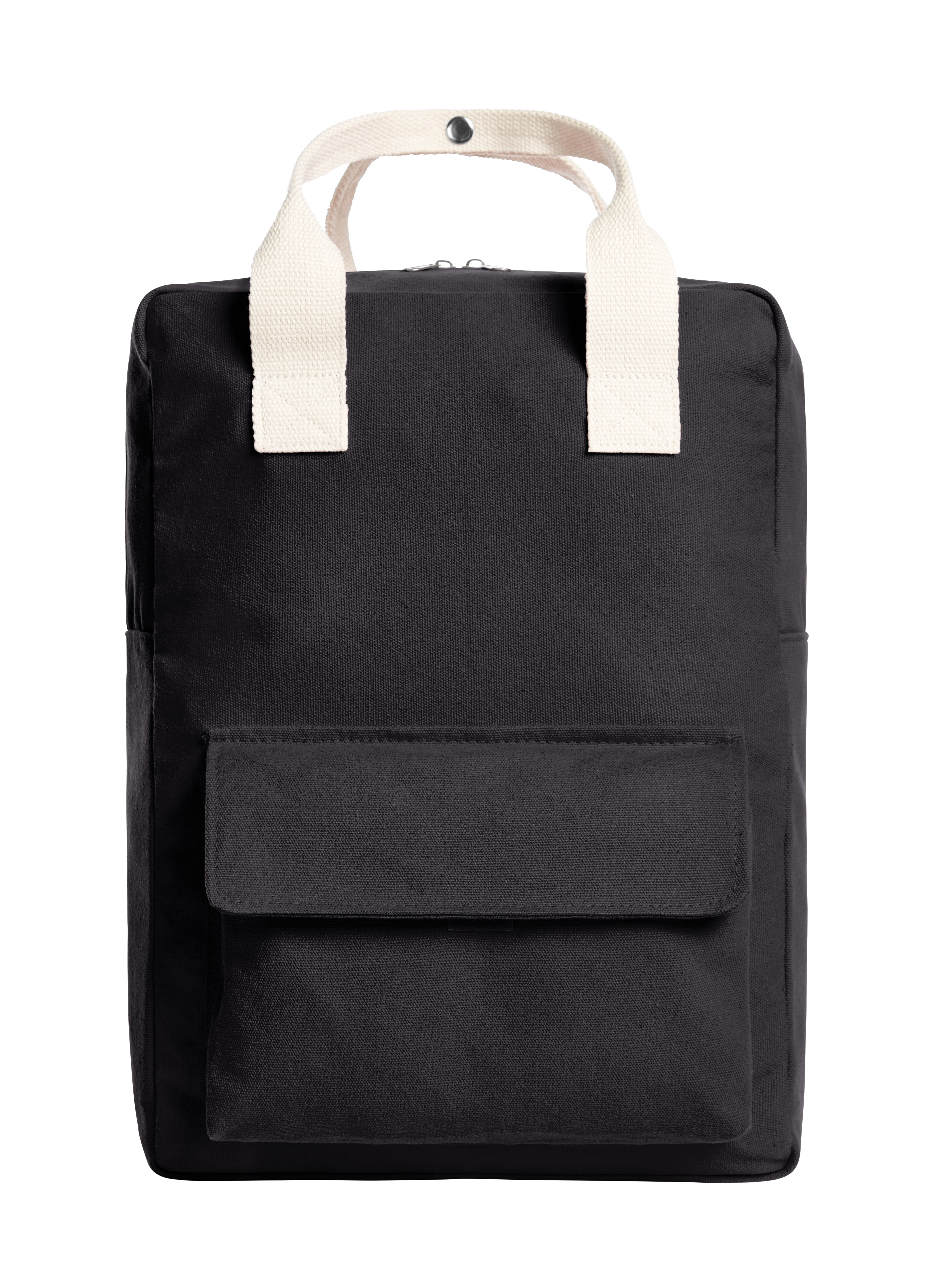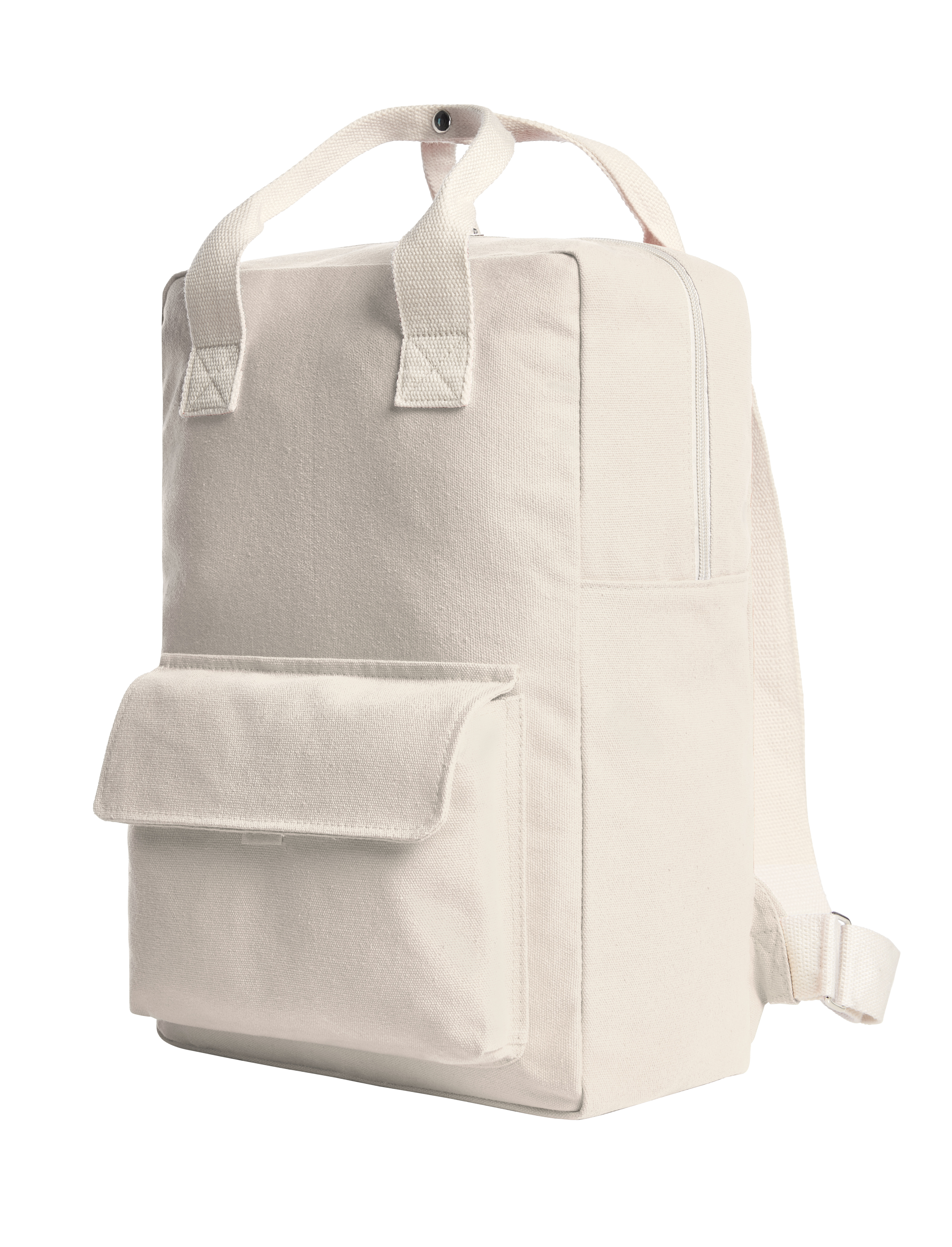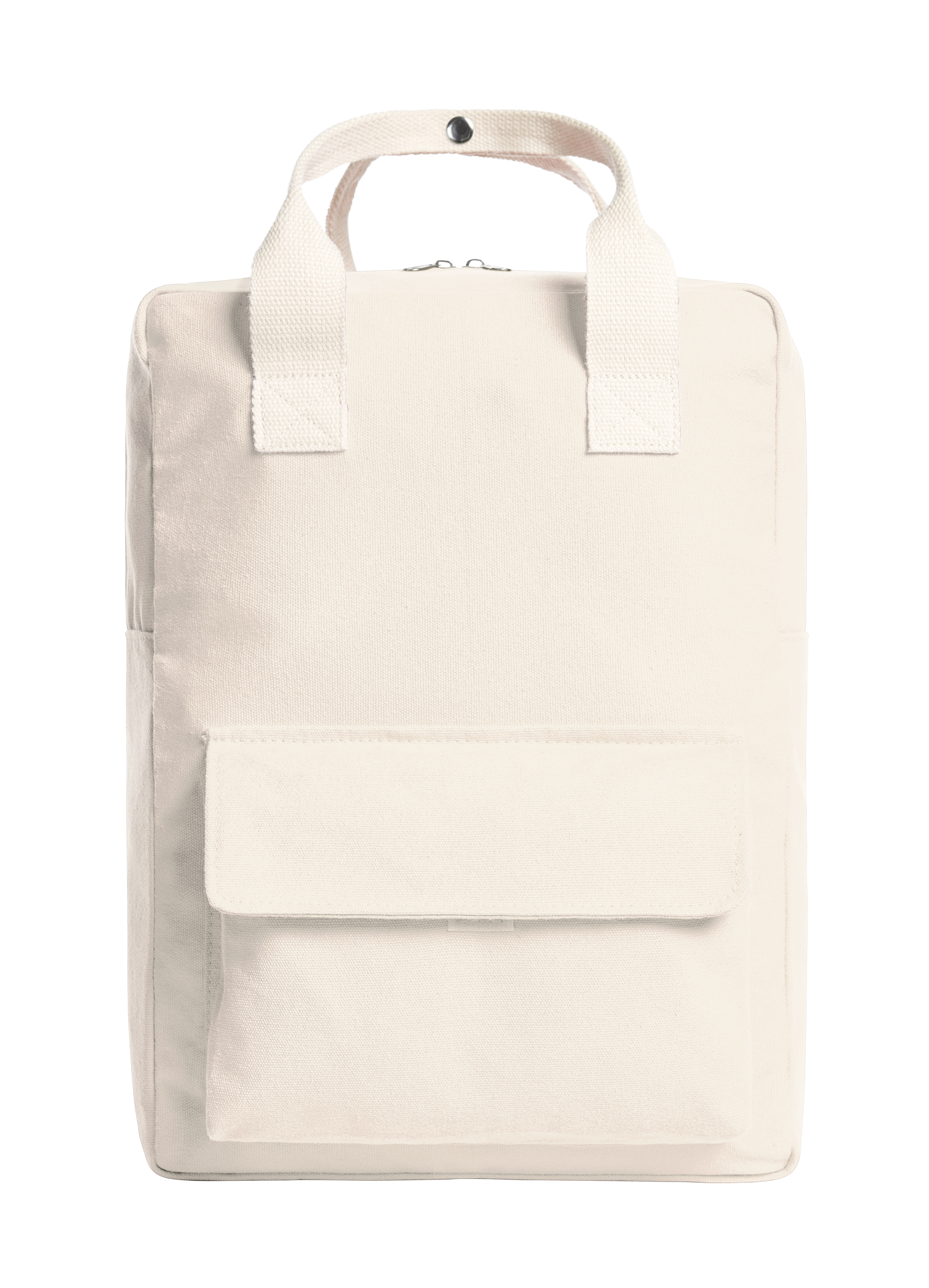 Urbaner Rucksack mit wertigen Metall-Accessoires; Hauptfach mit 2-Wege-Reißverschluss; flaches Einsteckfach innen; Vortasche mit Klettverschluss; Handgriffe mit Druckknopf; längenverstellbarer Baumwoll-Träger