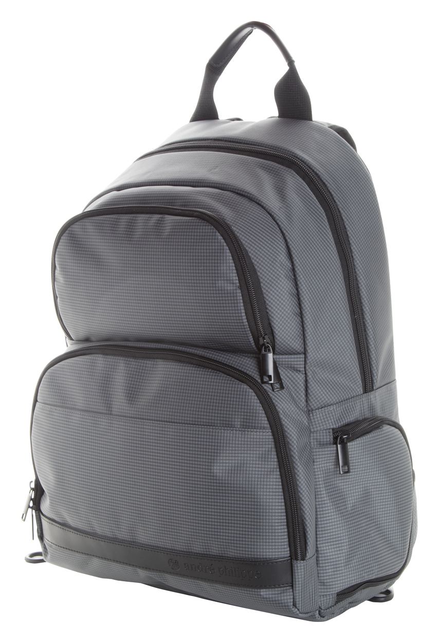 Rucksack mit mehreren Reißverschlussfächern, verstellbarem Schultergurt, gepolstertem Fach für Laptop und Rückenpartie. Material: Zweilagiges Polyester 420D. André Phillipe Markenprodukt.