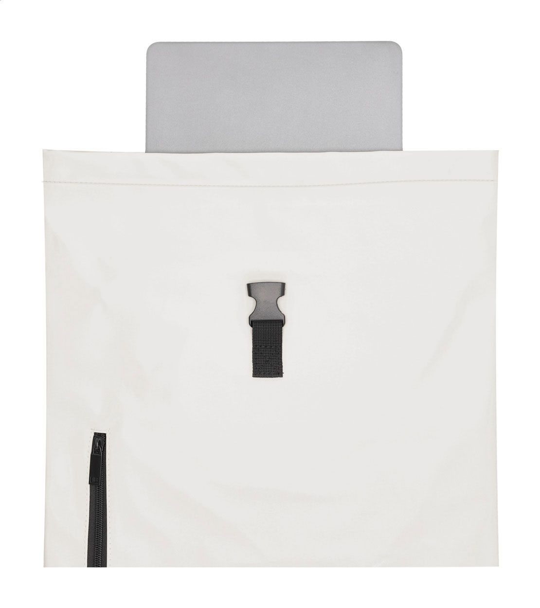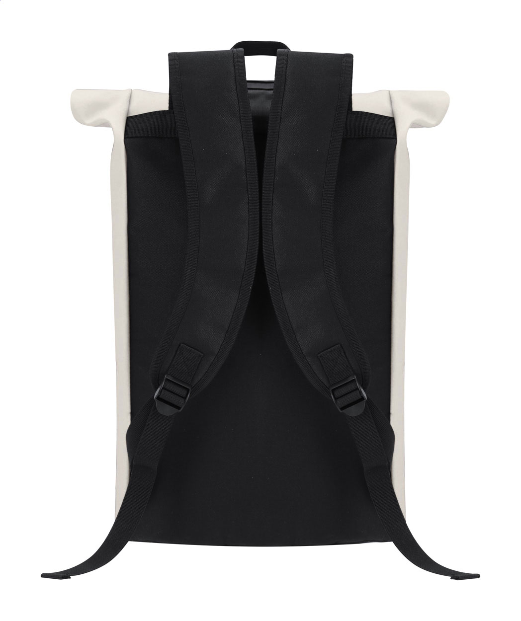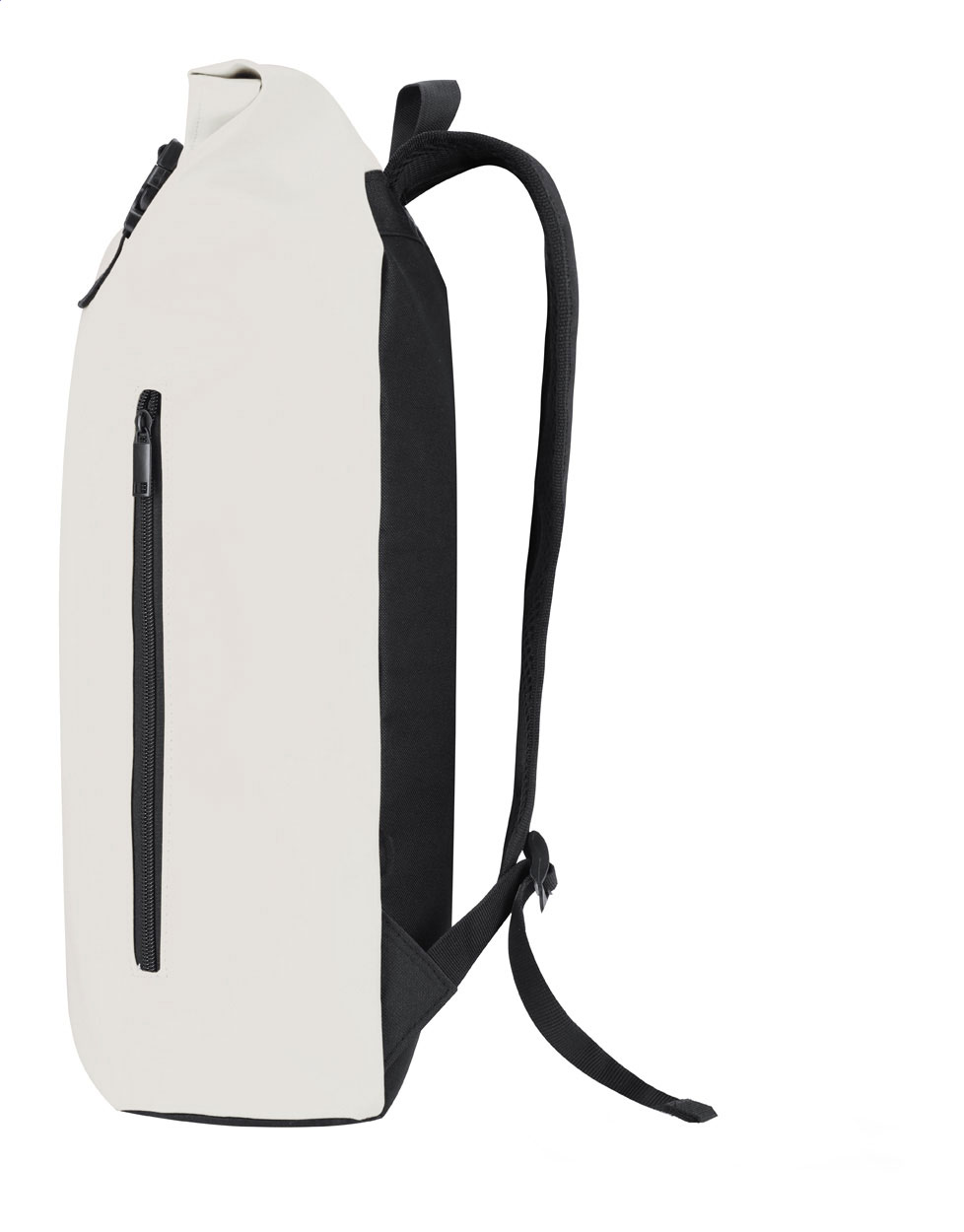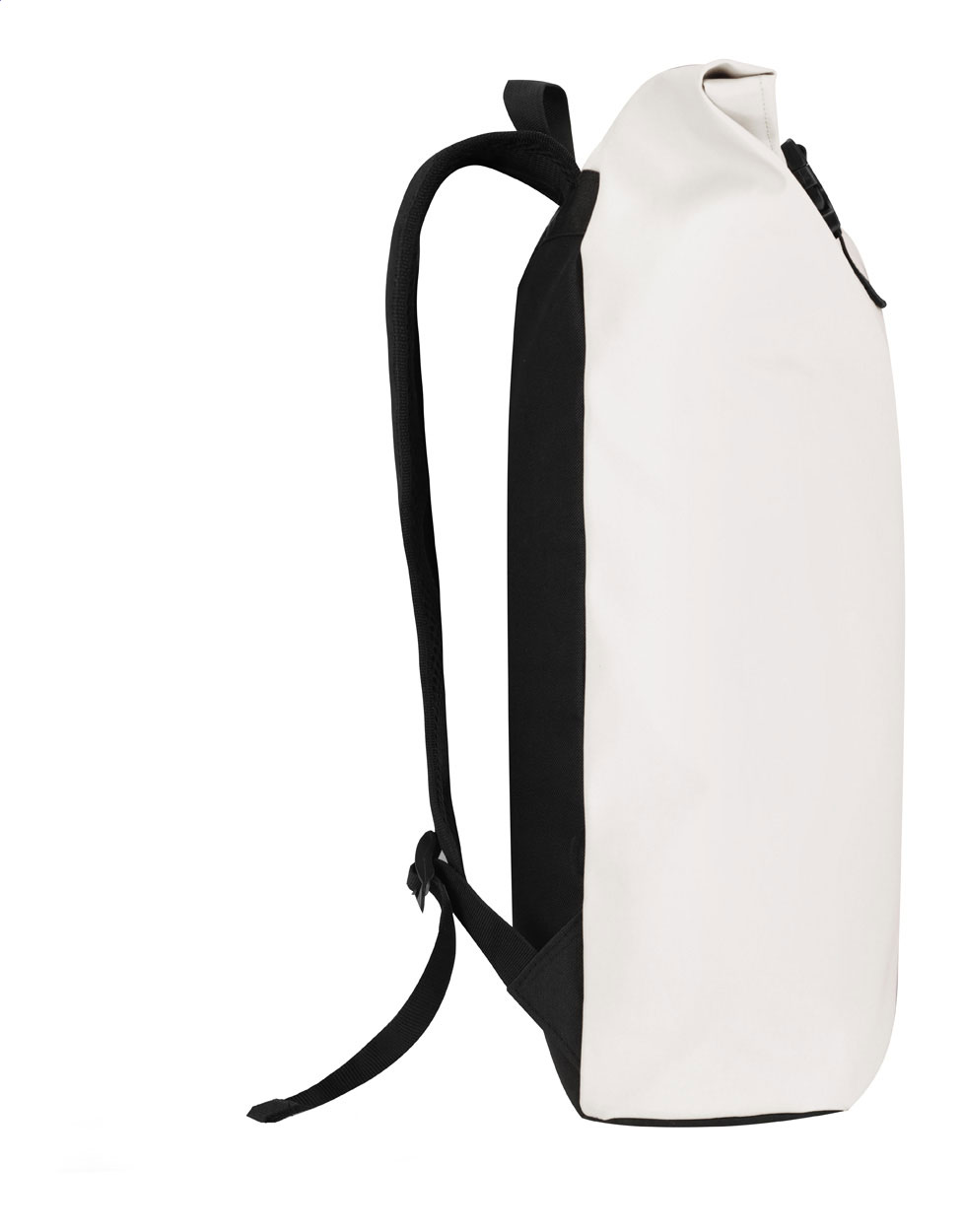Rolltop-Rucksack aus weichem PU-Leder mit Schnallenverschluss, gepolstertem Laptopfach (15"), gepolstertem Rücken und Schultergurten.
