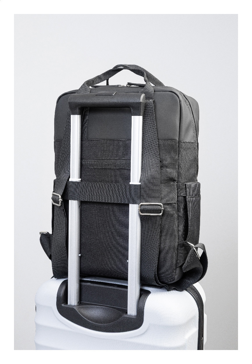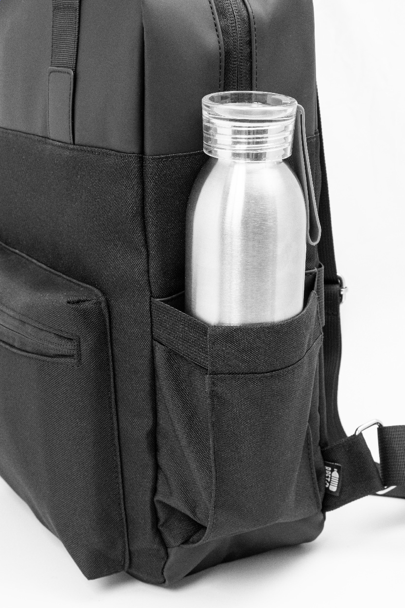 RPET-Rucksack mit weichem PU-Lederbesatz oben, Reißverschluss-Hauptfach, vorderer Reißverschlusstasche, Seitentaschen und verstecktem Anti-Diebstahlfach. Mit Trolley-Gurt, gepolstertem Rücken und Laptopfach (15"). Material: 900D RPET-Polyester. Verpackt im RPET-Vlies-Staubbeutel. Mit RPET-Label.