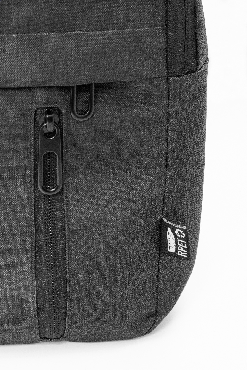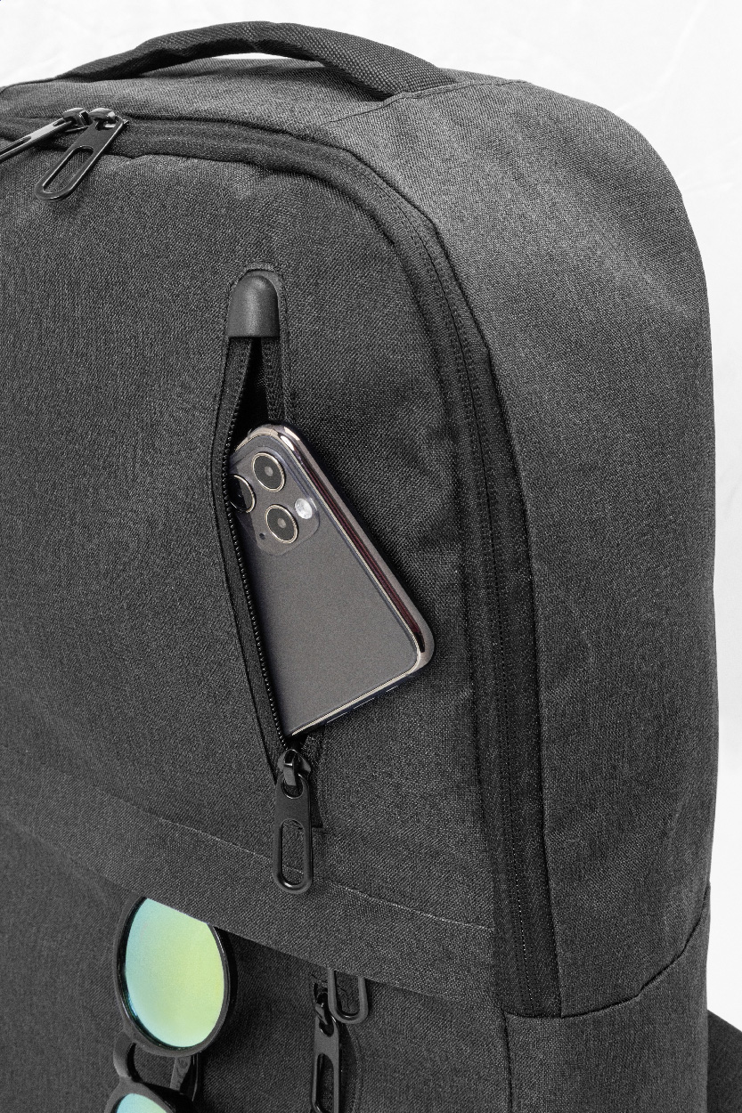 RPET-Rucksack mit Reißverschluss-Hauptfach und 3 Reißverschluss-Fronttaschen. Mit gepolstertem Tablet- (10") und Laptop-Fach (15"), gepolstertem Rücken und gepolsterten Schultergurten. Material: 600D RPET-Polyester. Mit RPET-Label.