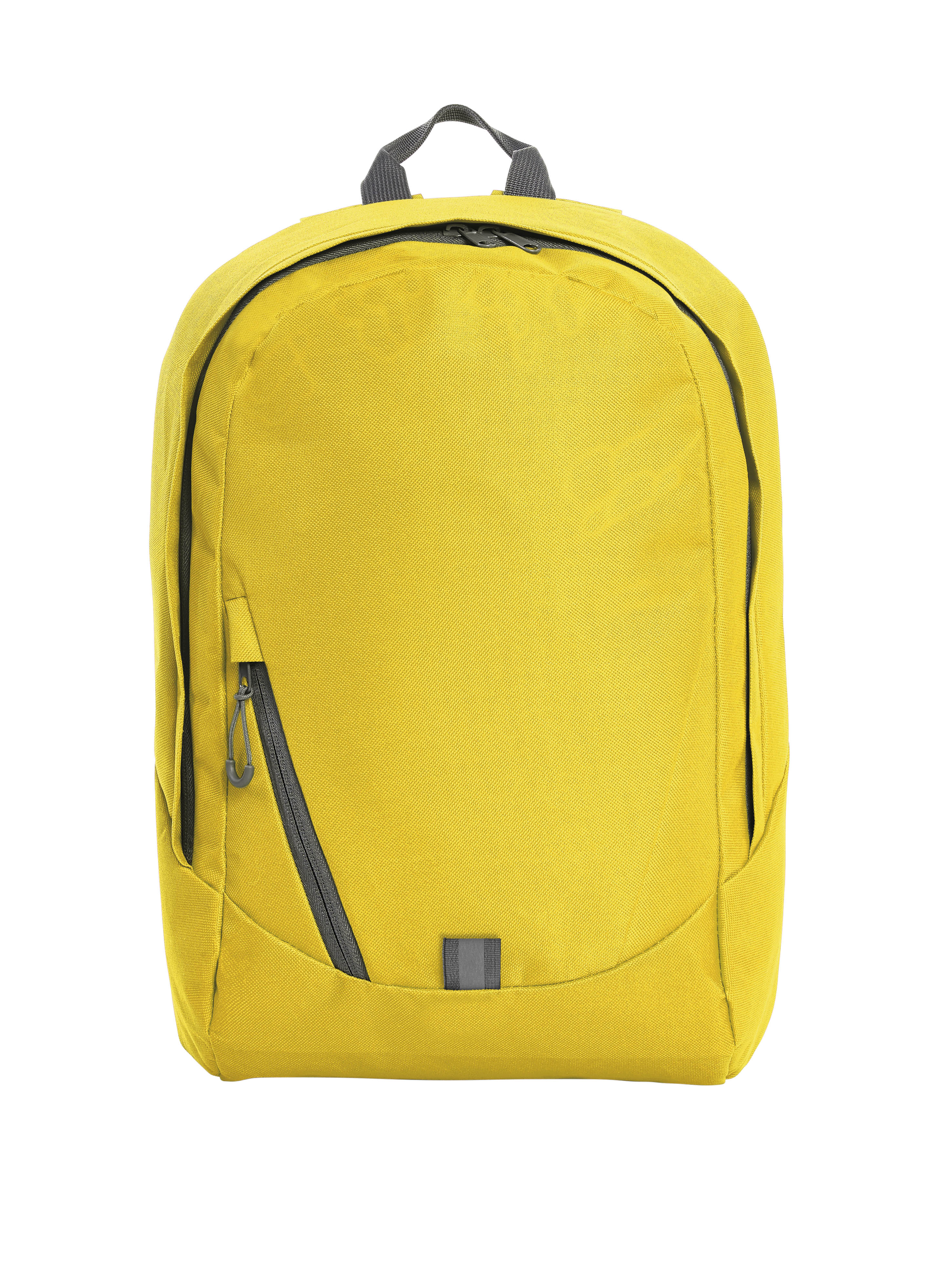 Moderner Rucksack mit Reißverschluss-Vortasche; Hauptfach mit 2-Wege-Reißverschluss und flachem Einsteckfach innen; Regenklappe; Reflektor-Streifen vorne, Rücken und Schultergurte gepolstert; Handgriff
