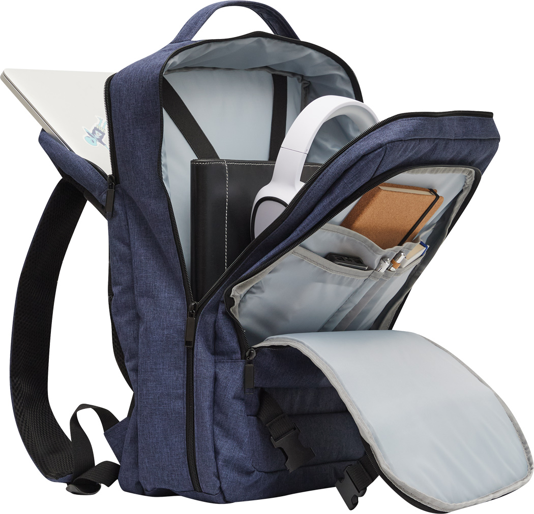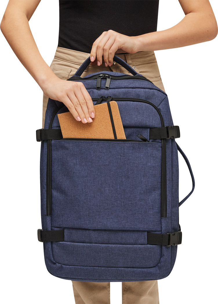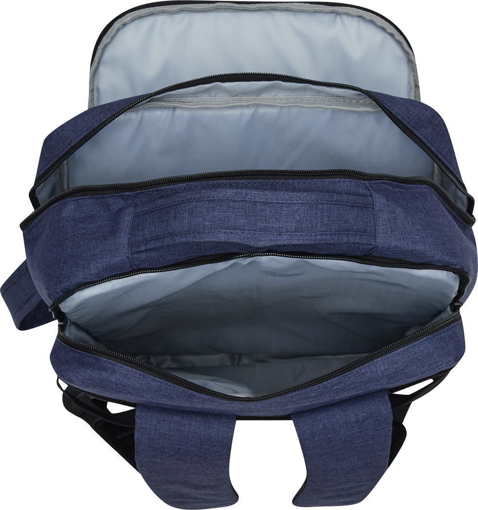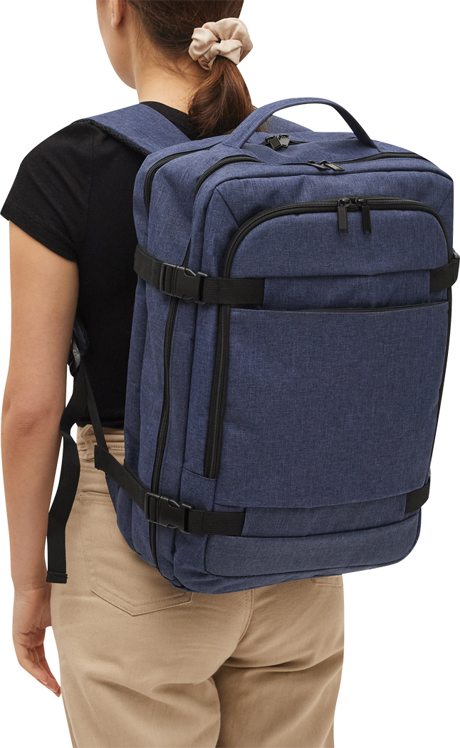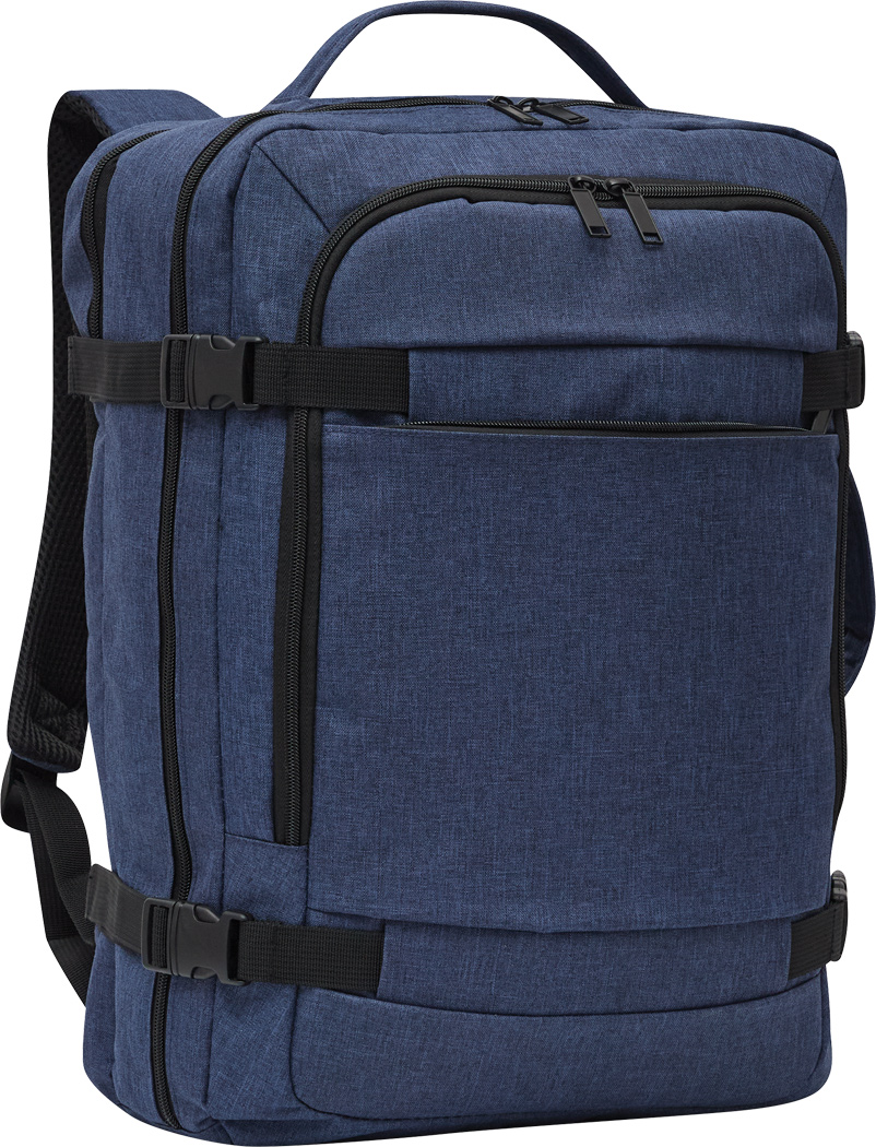 Rucksack STEWARD: 2 Reißverschluss-Vorfächer, eins davon mit Organizer (3 Steckfächer, 2 Stifteschlaufen), 1 großes gepolstertes Reißverschluss-Hauptfach mit Packgurt, 1 gepolstertes Reißverschluss-Laptopfach, jeweils 1 verstärkter Top- und Seitengriff, gepolsterte Schultergurte in ergonomischer Form und gepolsterter Rückenbereich, Gurt als Reporterfunktion auf der Rückseite, seitlich je 2 Kompressionsgurte mit Schnappverschluss