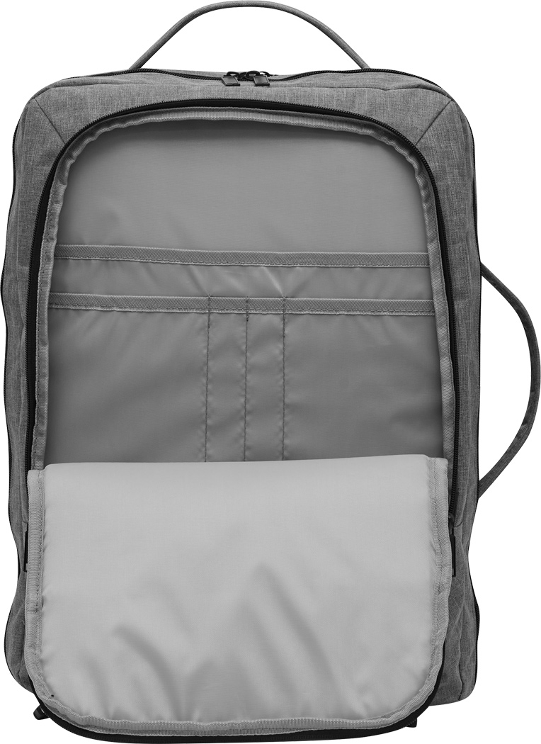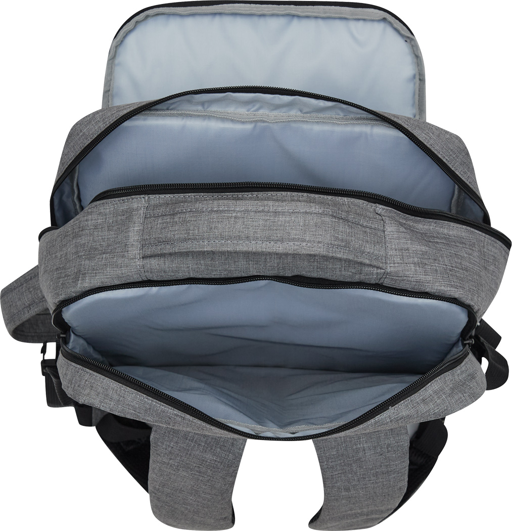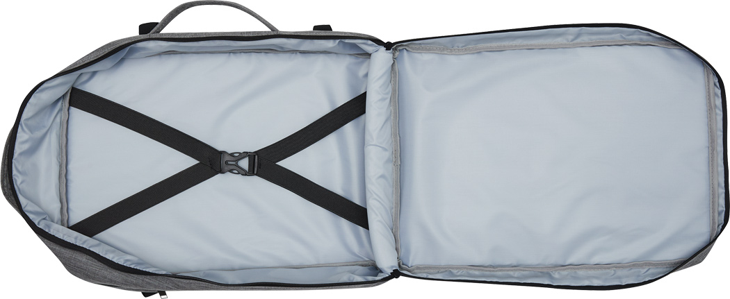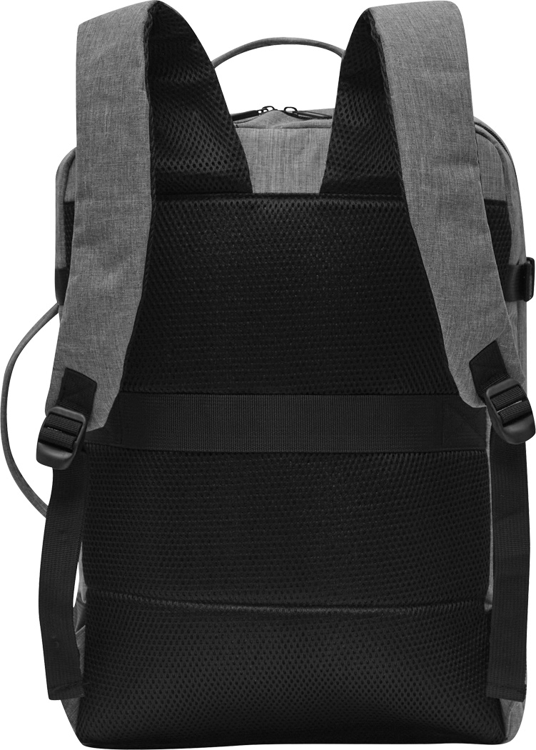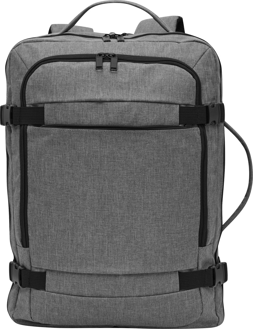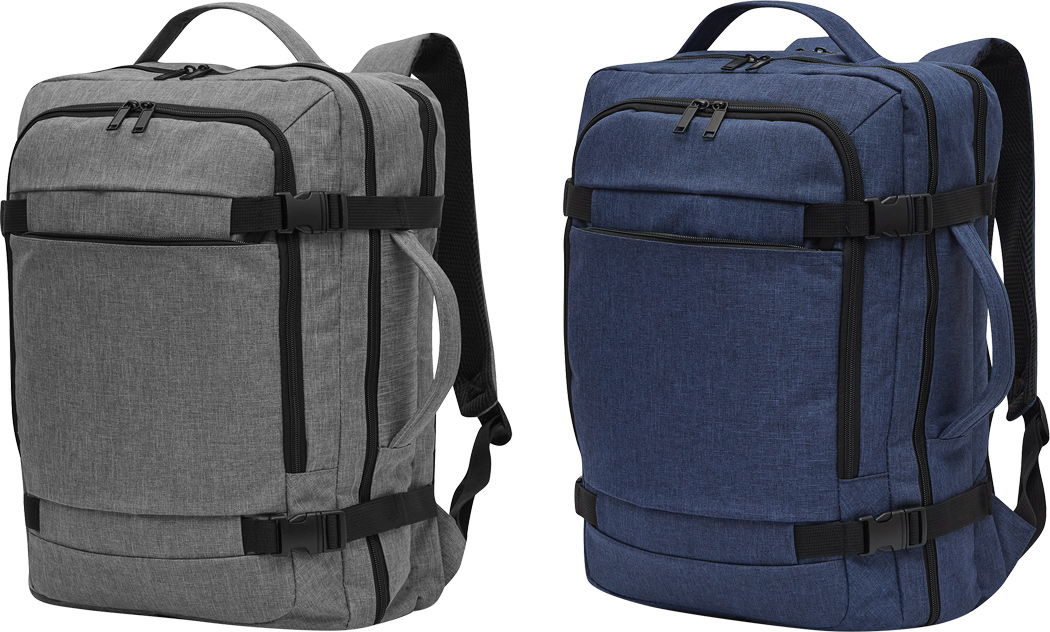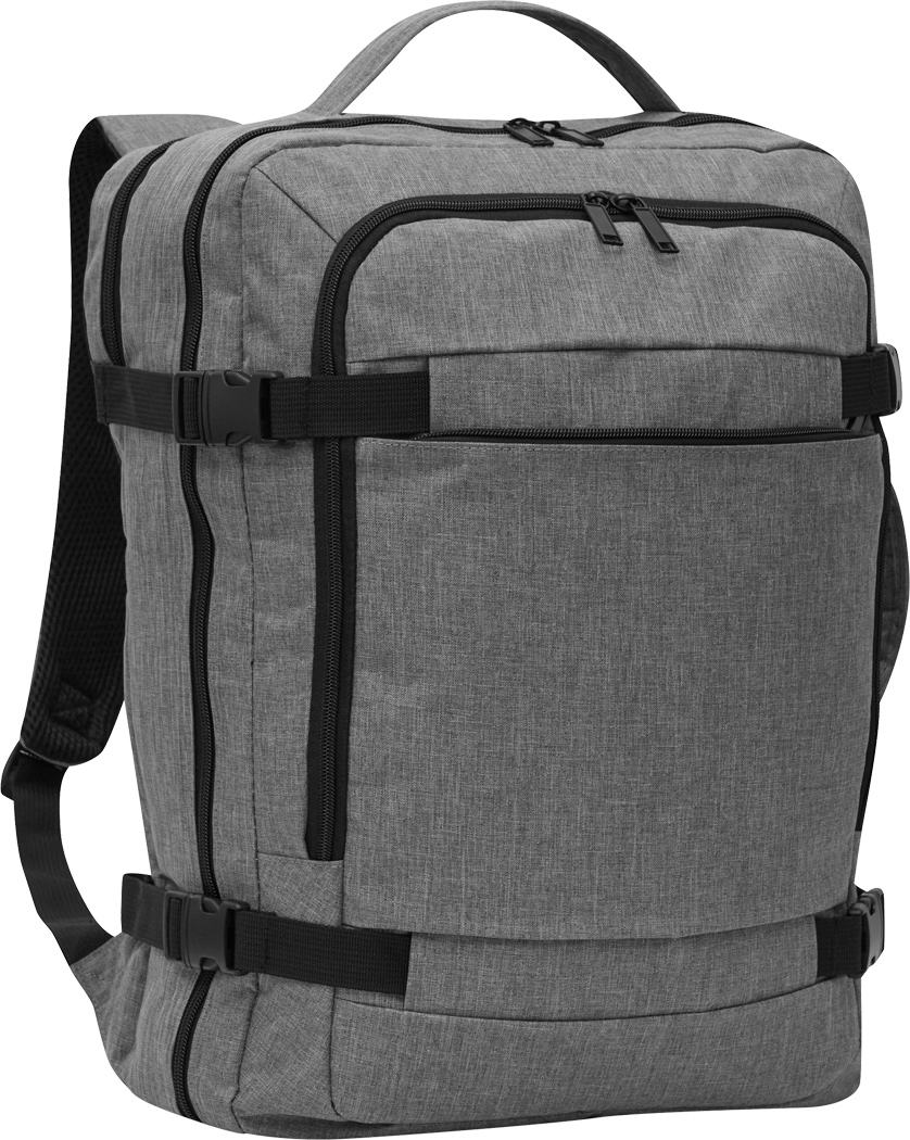 Rucksack STEWARD: 2 Reißverschluss-Vorfächer, eins davon mit Organizer (3 Steckfächer, 2 Stifteschlaufen), 1 großes gepolstertes Reißverschluss-Hauptfach mit Packgurt, 1 gepolstertes Reißverschluss-Laptopfach, jeweils 1 verstärkter Top- und Seitengriff, gepolsterte Schultergurte in ergonomischer Form und gepolsterter Rückenbereich, Gurt als Reporterfunktion auf der Rückseite, seitlich je 2 Kompressionsgurte mit Schnappverschluss