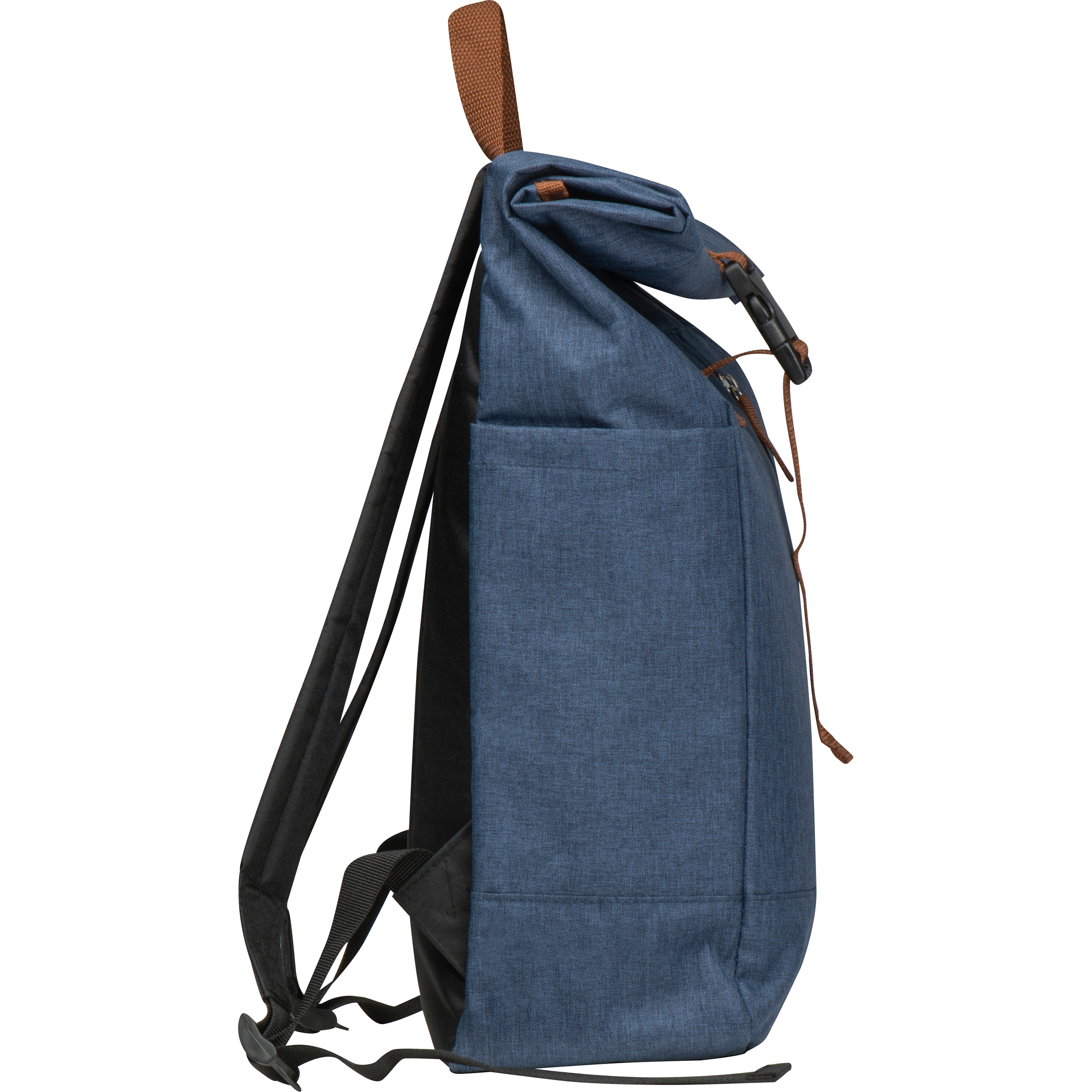Rucksack aus 500D Polyester mit falt- bzw. rollbarem Verschluß, gepolsterten Tragegurten und Rückteil, Sicherheitsfach mit Karabiner am Rücken, zwei seitlichen Einsteckfächern außen, einem Einsteckfach innen, Tragehenkel und verschließbarem Vorfach. Ihre Werbung wird auf das Vorfach gedruckt.