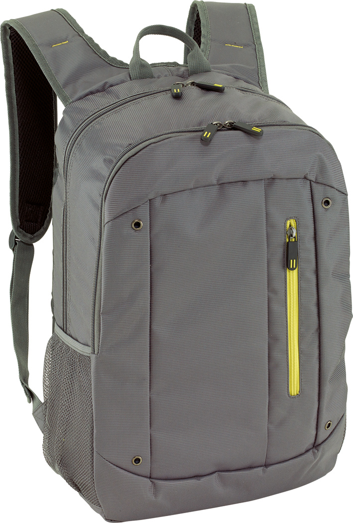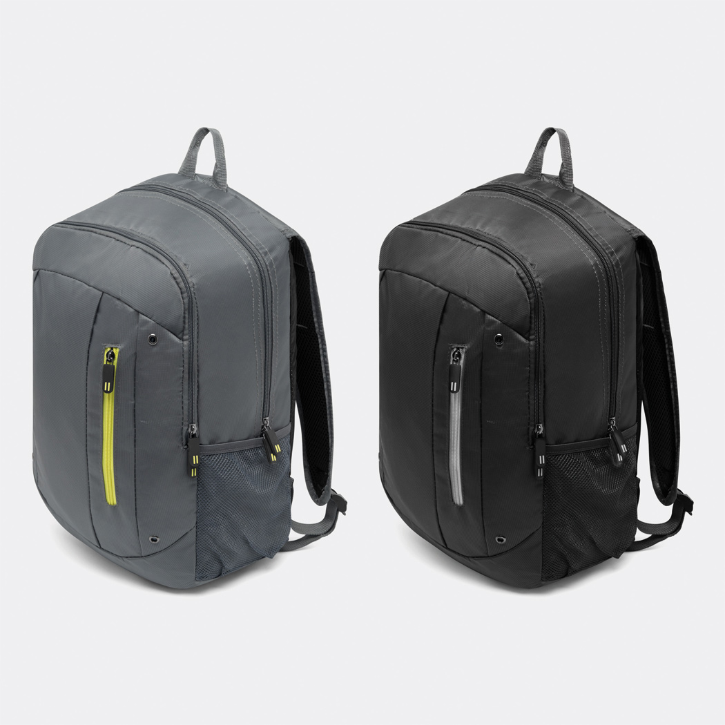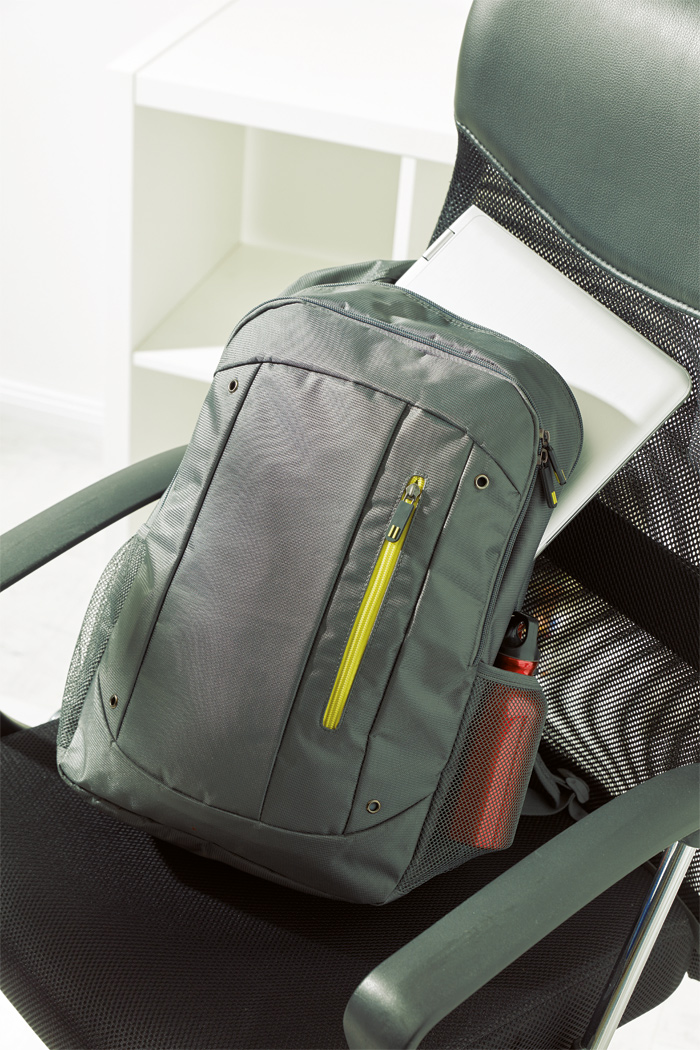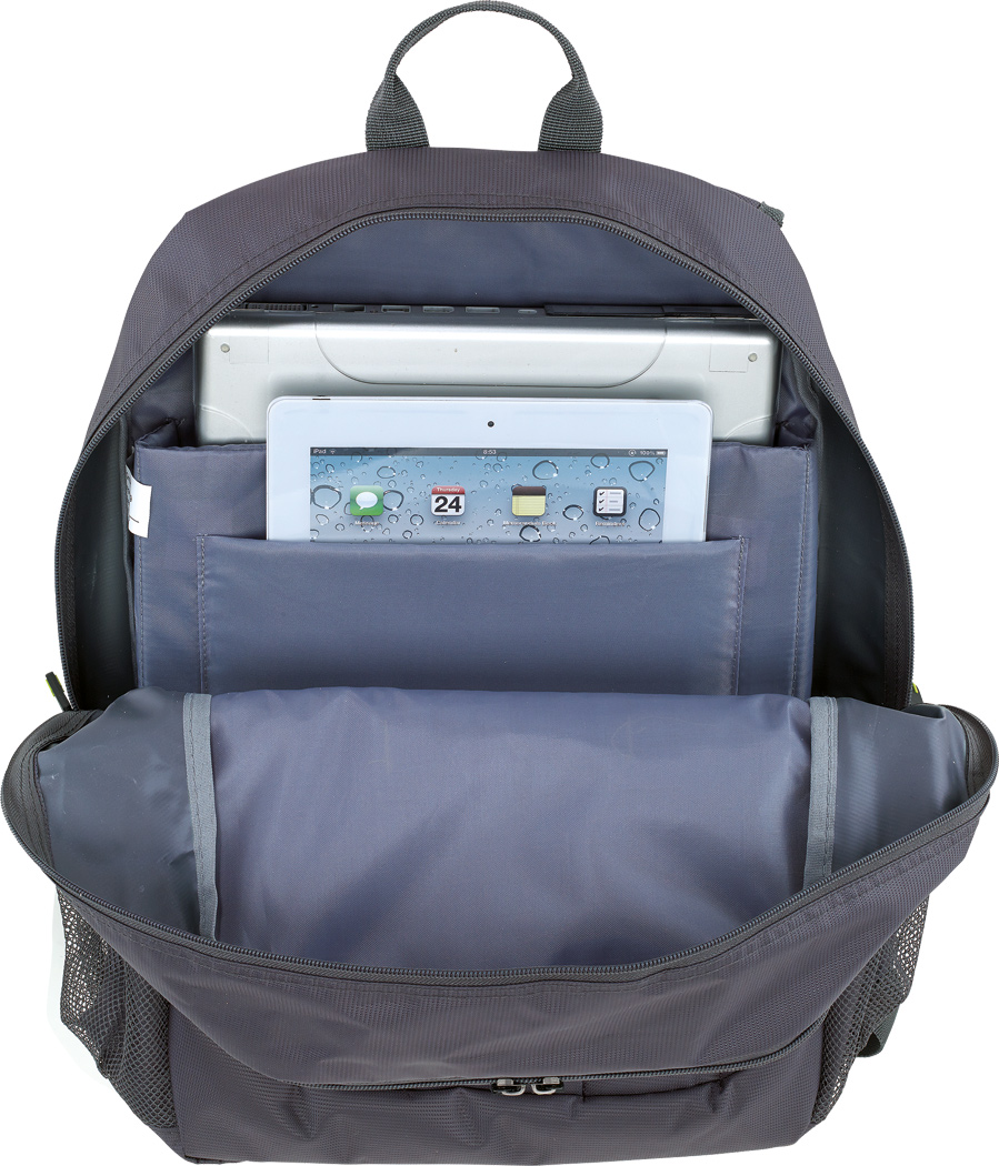 Rucksack TALLINN: 1 Reißverschluss-Vorfach mit Organizer, kleine vertikale Vortasche mit farbigem Reißverschluss, 1 Reißverschluss-Hauptfach mit gepolstertem Innenfach für Laptop oder Tablet plus extra gepolstertes Einsteckfach, 2 seitliche Netzfächer, Trageschlaufe, gepolsterte Schultergurte und Rückenbereich