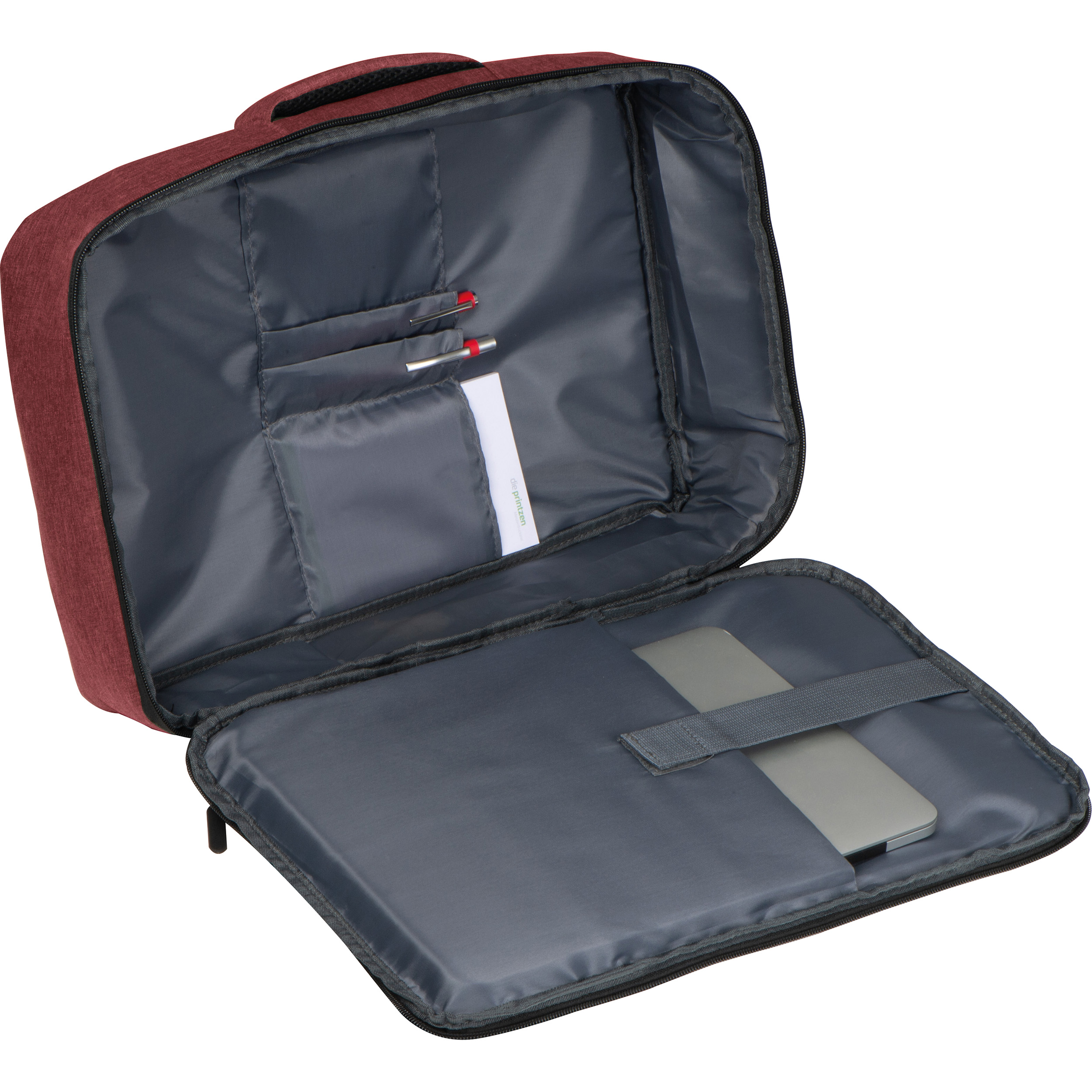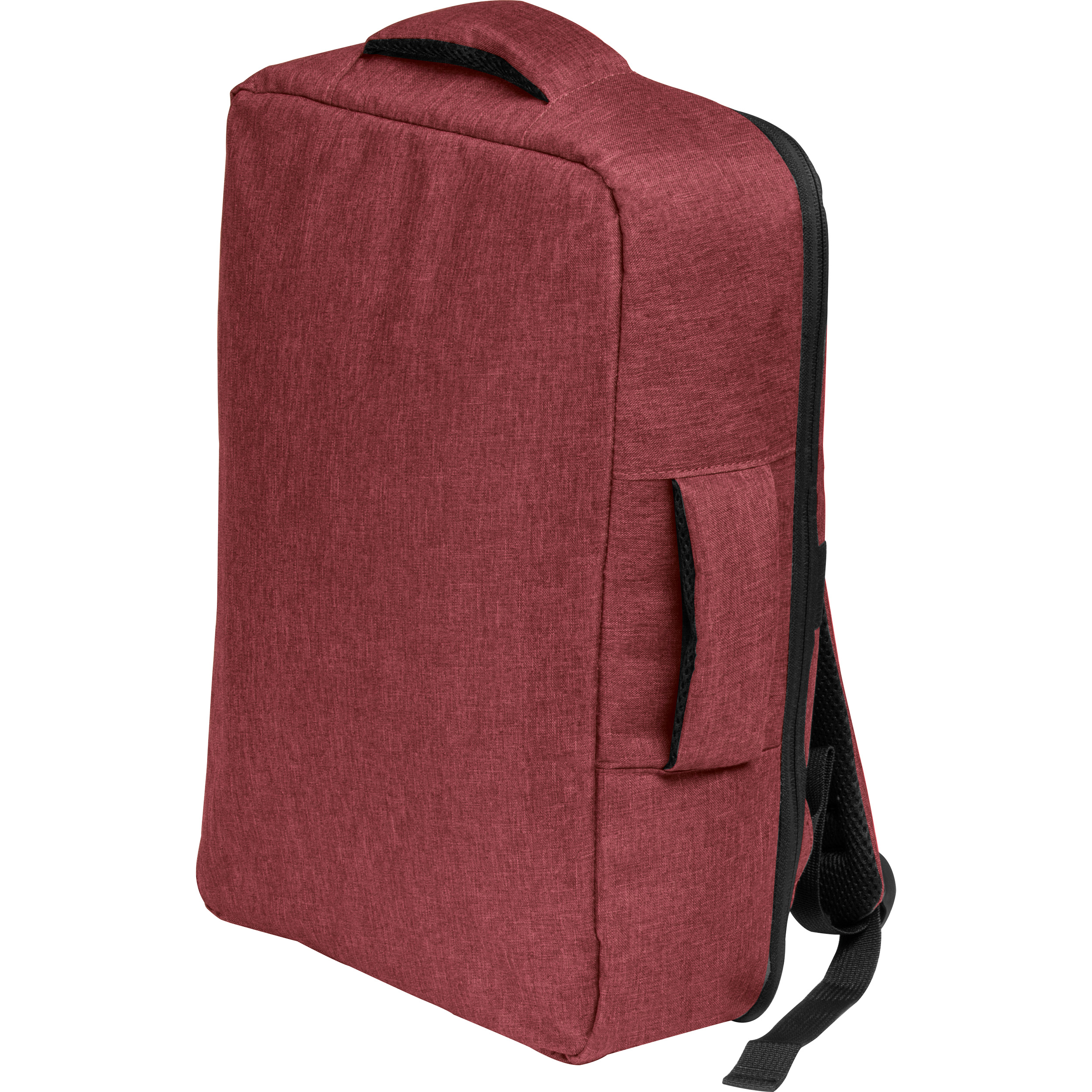 Laptop-Rucksack aus 300D Polyester mit Trolley-Funktion. Neben dem große Hauptfach und dem Laptopfach verfügt er noch über eine fast ganz umlaufenden Reißverschluss, vier Einsteckfächer innen, zwei gepolsterte Tragegriffe sowie gepolsterte und verstellbare Schulterriemen. Ihre Werbung drucken wir mittig vorne auf den Rucksack.