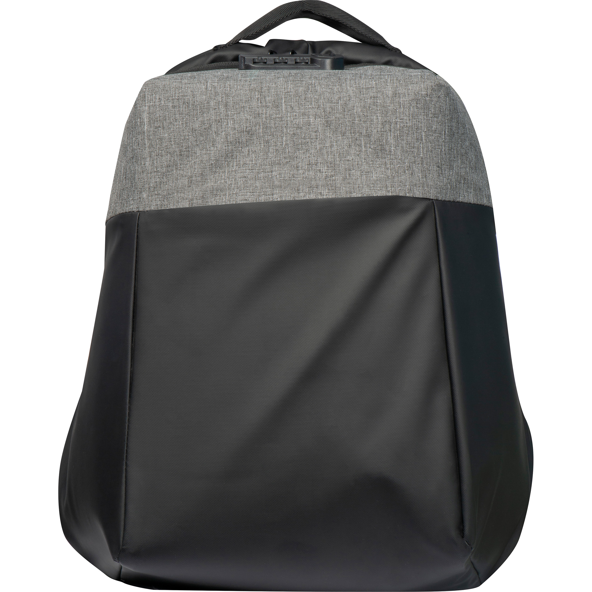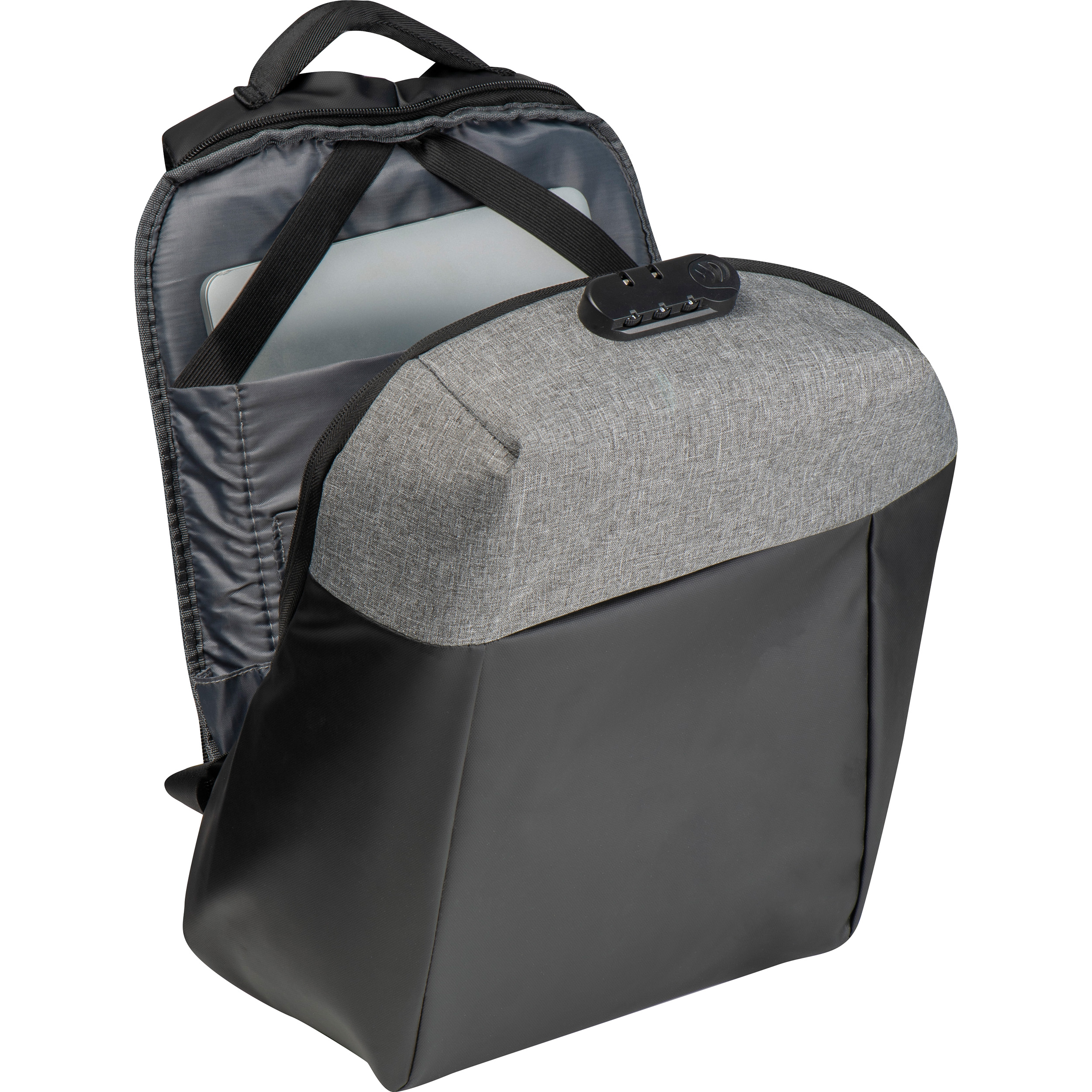 Trolleyfähiger Antidiebstahl-Hartschalen-Rucksack aus 600D Polyester mit extra vielen Funktionen: Zahlenschloss für das Hauptfach, Antidiebstahlfach am Rücken, kleines Reißverschlussfach am gepolsterten Schultergurt, gepolstertem Rückenteil, gepolstertem Tragegriff, Laptopfach mit Vorfach und Gummibändern, einem USB Port zum Anschluss einer Powerbank (im Lieferumfang nicht enthalten), vier Stifteschlaufen, Öffnung für Kopfhörer, drei Einsteckfächern und einem abnehmbaren Schlüsselring. Durch zwei Klettverschlüsse innen, lässt sich der Rucksack entweder teilweise oder ganz öffnen. Ihre Werbung wird auf der Vorderseite angebracht.