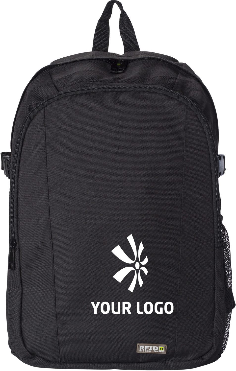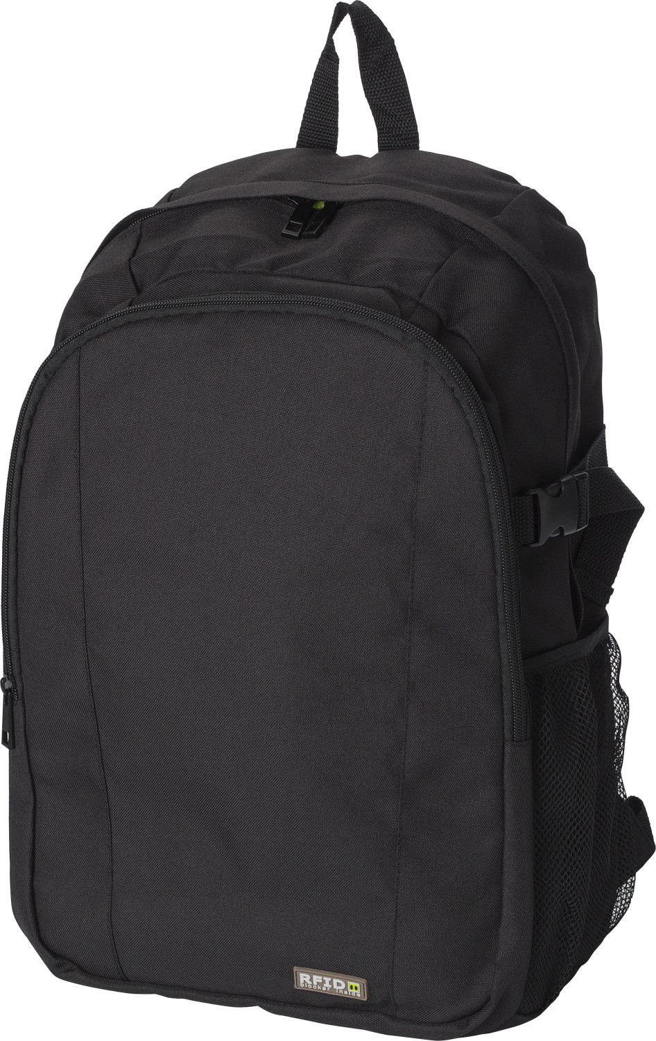 Rucksack 'Protect' aus 600D Polyester mit RFID Schutz. Das Front- und Hauptfach verfügt über einen Reißverschluss, sowie ein Laptopfach (passend bis 14'') und weiteren kleinen Fächern. Die Schultergurte sind beschichtet und verstellbar.