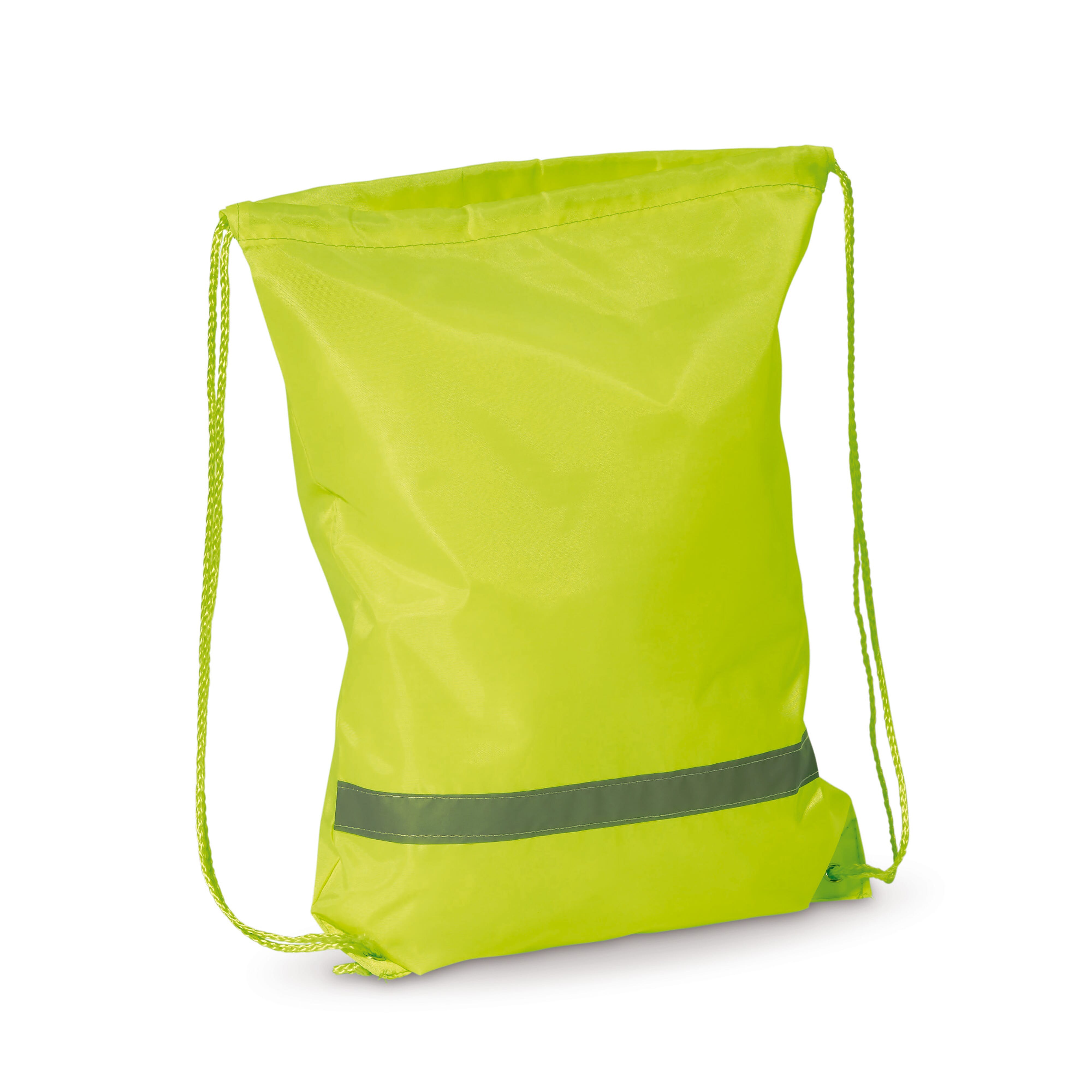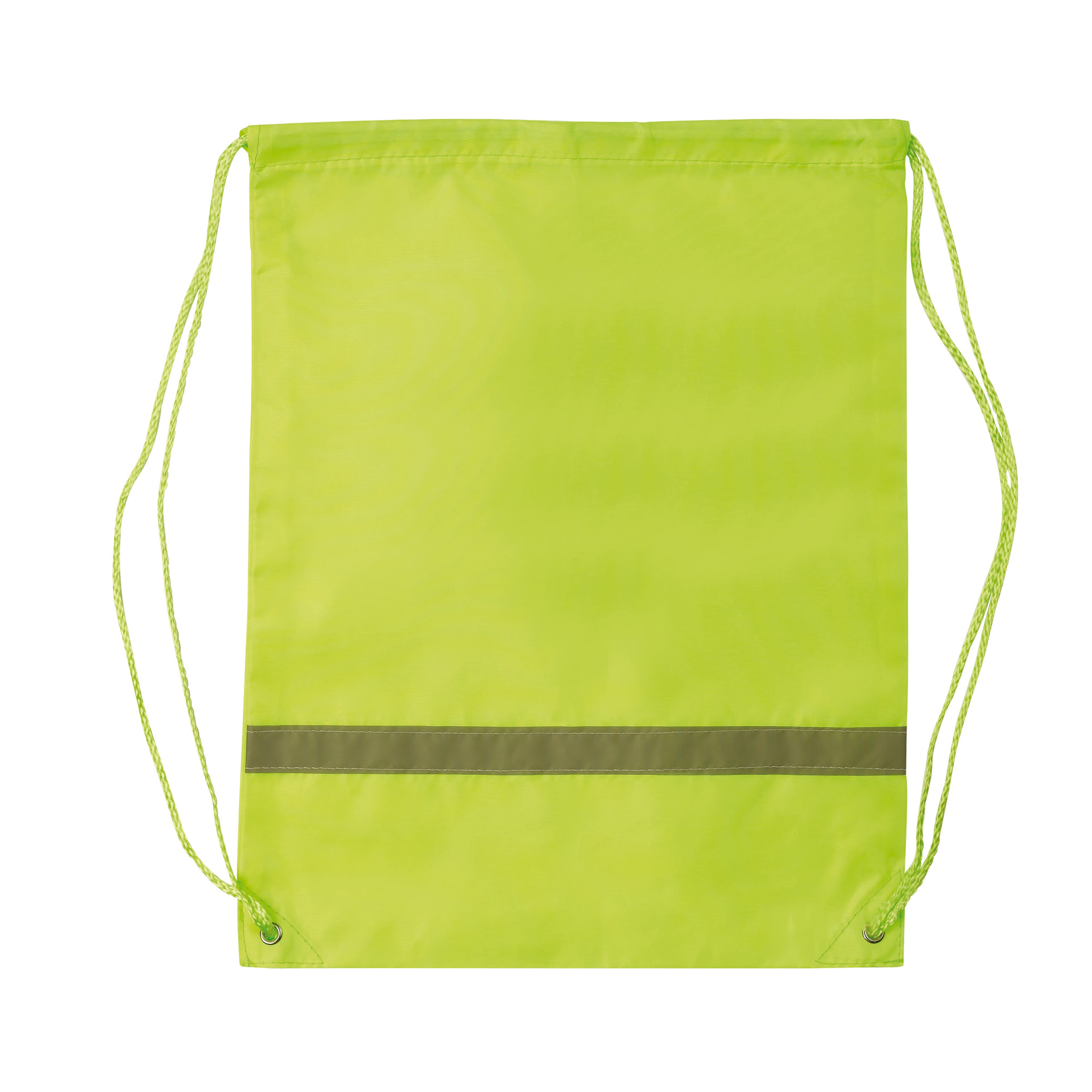 Polyester-Rucksack mit Reflektorstreifen und Kordelverschluss. Einfarbig bedruckt im Siebdruck oder mehrfarbig bedruckt mit Transferdruck.
