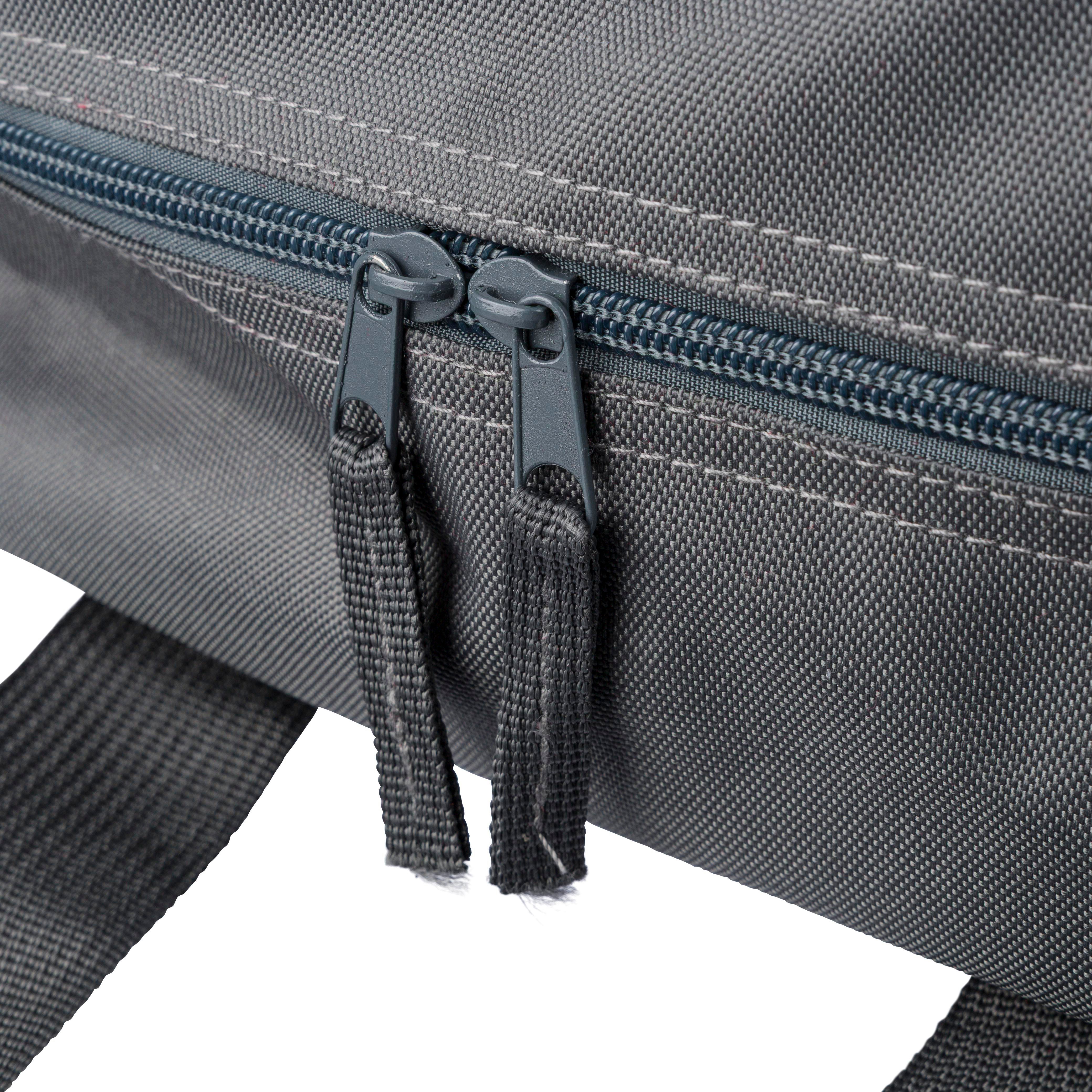 Rucksack aus recyceltem 900D-Polyester mit 210D-Futter und rPET-Etikett an der Seite. Mit großem Hauptfach mit Reißverschluss und 16-Zoll-Laptopfach, kleinerem Frontfach mit Reißverschluss, zwei Seitentaschen und Trolley-Gurt. Mit Tragegriffen mit Knopfverschluss und verstellbaren, belüfteten Schultergurten.