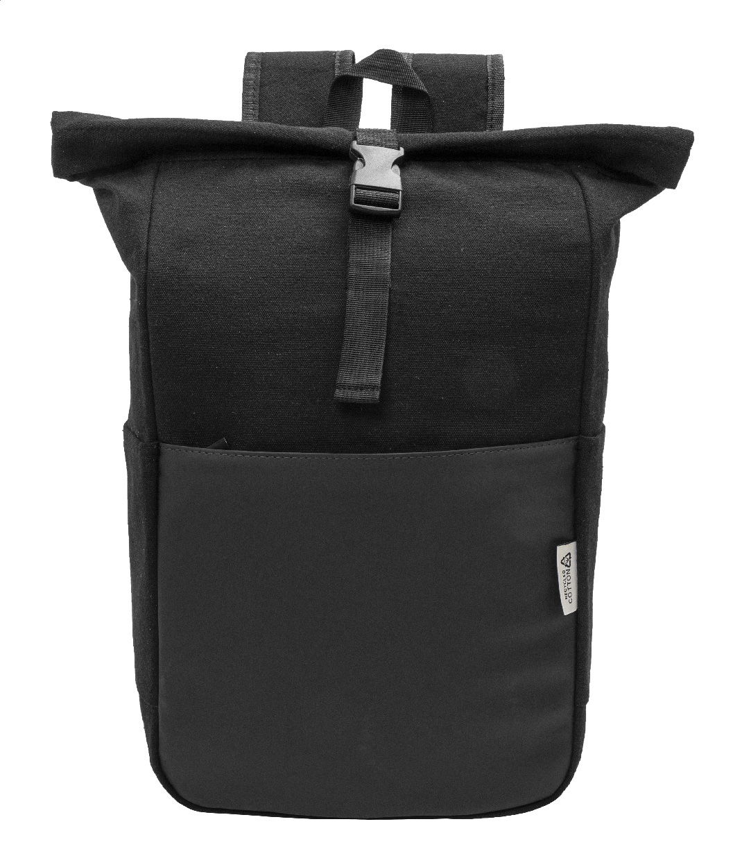 Rolltop-Rucksack aus recyceltem Canvas mit Schnallenverschluss und Reißverschluss-Fronttasche aus weichem recyceltem PU-Leder. Mit gepolstertem Laptopfach (15 Zoll), Seitentaschen, gepolstertem Rücken und Schultergurten. Material: 70 % recycelte Baumwolle und 30 % RPET-Polyester. Mit Labele recycelte Baumwolle.