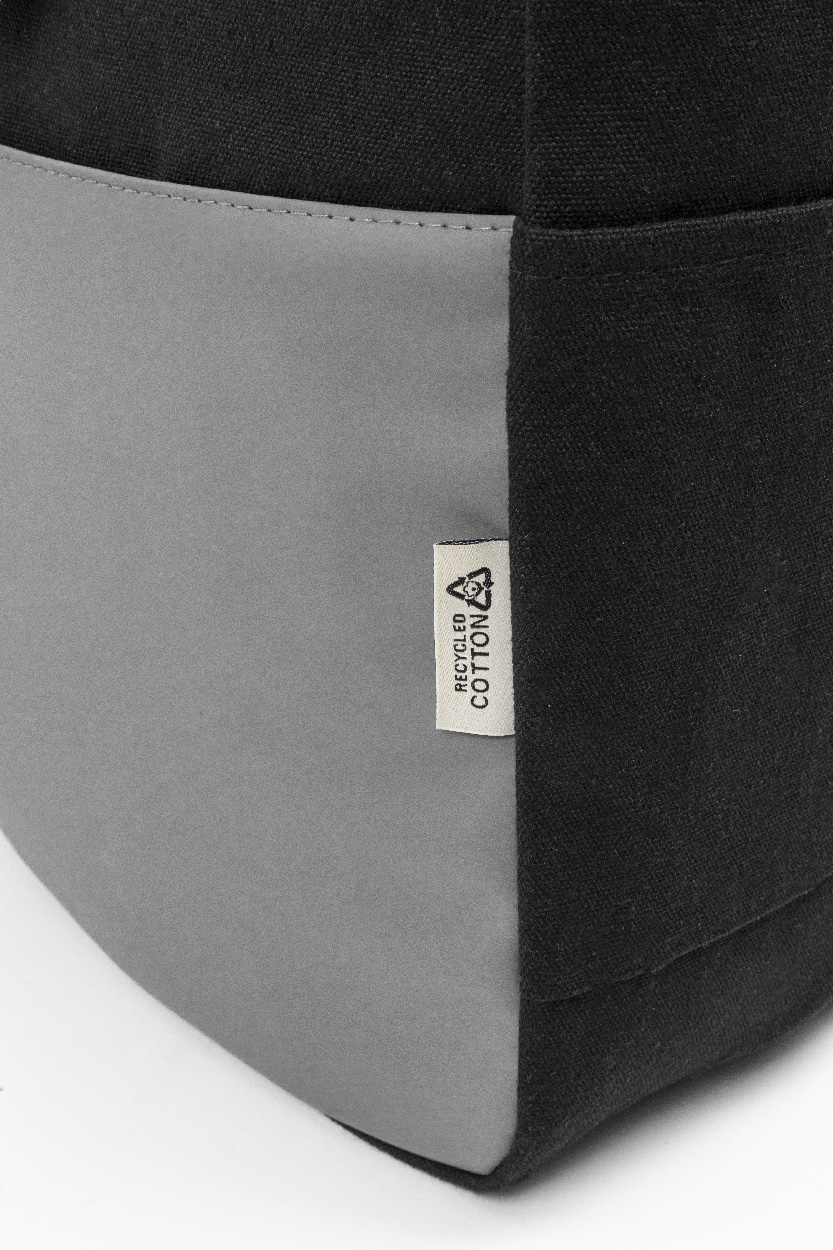 Rolltop-Rucksack aus recyceltem Canvas mit Schnallenverschluss und Reißverschluss-Fronttasche aus weichem recyceltem PU-Leder. Mit gepolstertem Laptopfach (15 Zoll), Seitentaschen, gepolstertem Rücken und Schultergurten. Material: 70 % recycelte Baumwolle und 30 % RPET-Polyester. Mit Labele recycelte Baumwolle.