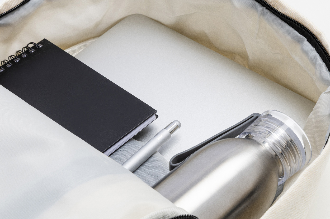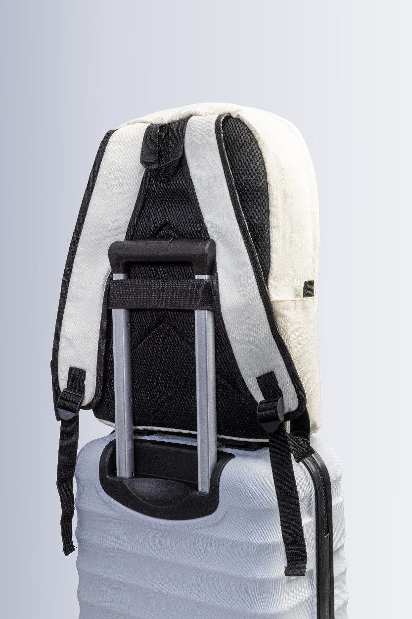 Rucksack aus recyceltem Canvas mit Reißverschluss-Hauptfach, gepolstertem Laptopfach (15"), 2 vorderen Reißverschlusstaschen, Seitentaschen, Trolley-Gurt sowie gepolsterten Rücken- und Schultergurten. Hergestellt aus 70 % recycelter Baumwolle und 30 % RPET-Polyester. Mit Label recycelte Baumwolle.