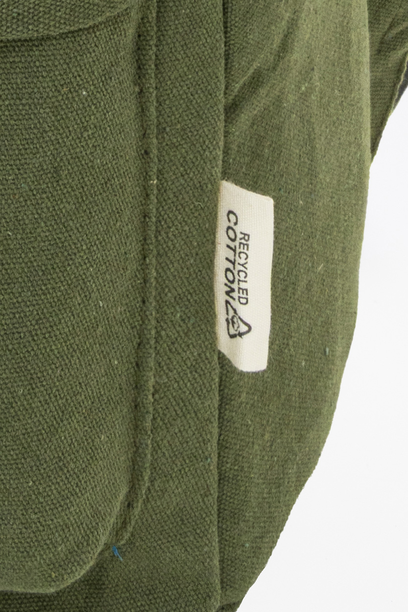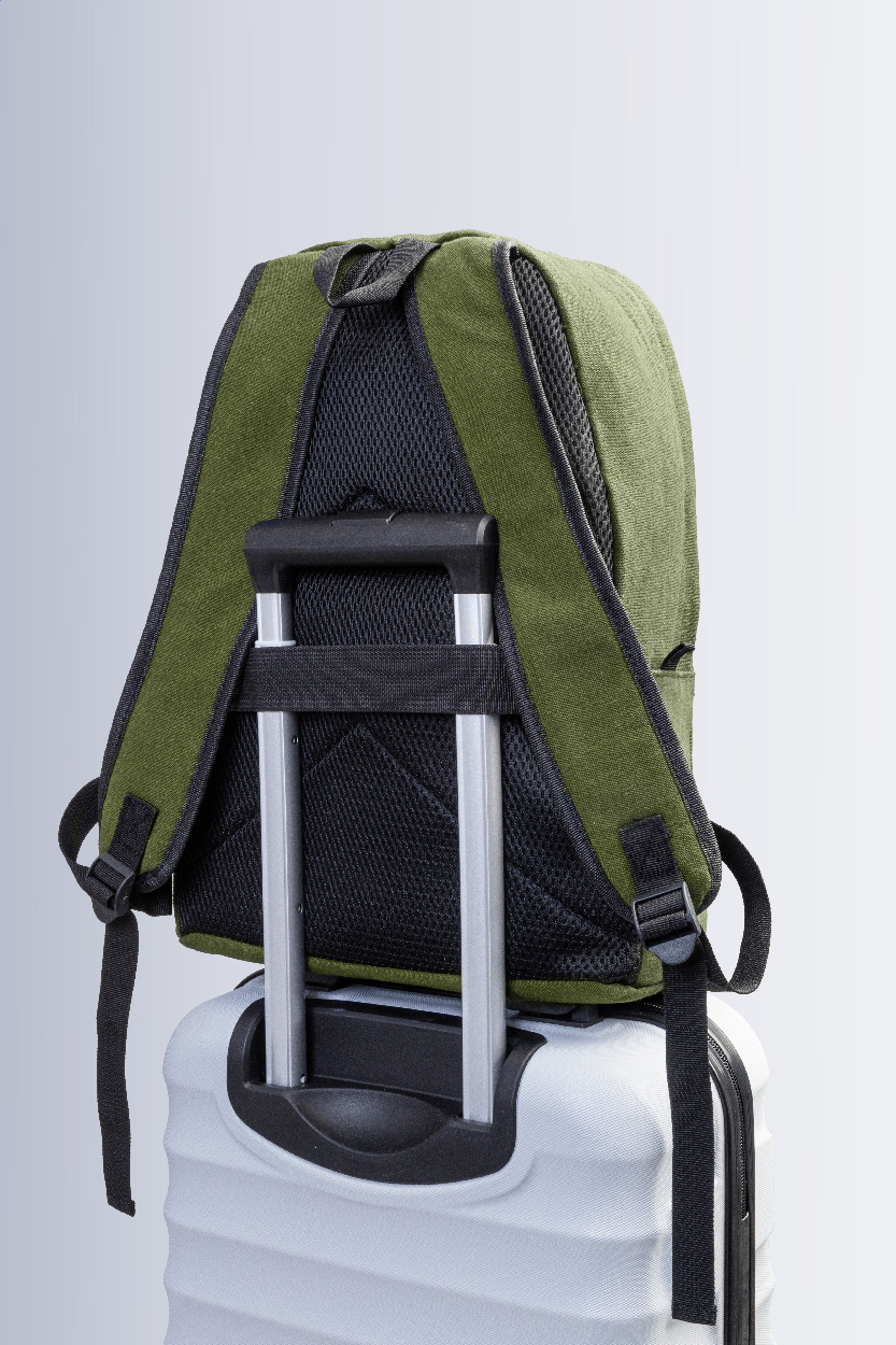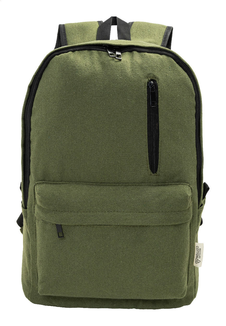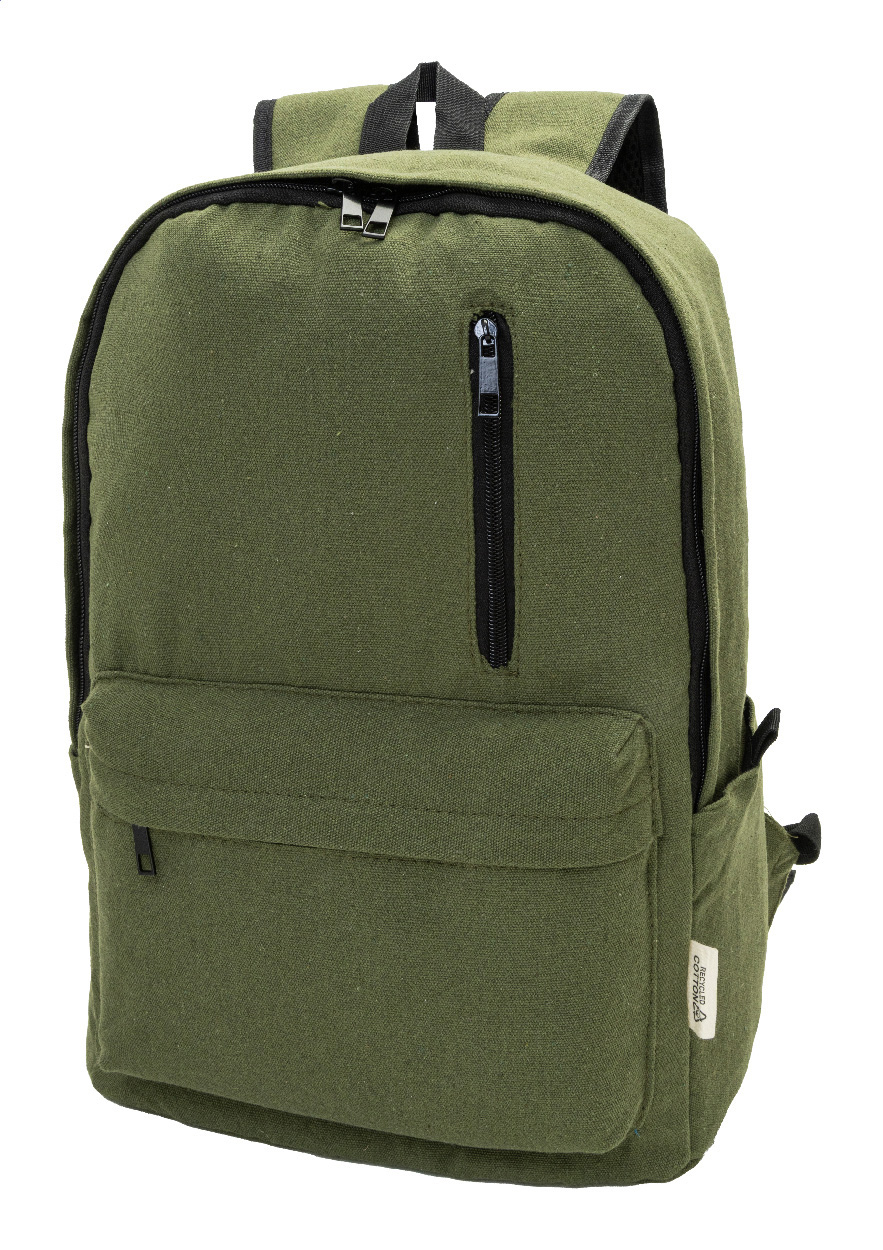 Rucksack aus recyceltem Canvas mit Reißverschluss-Hauptfach, gepolstertem Laptopfach (15"), 2 vorderen Reißverschlusstaschen, Seitentaschen, Trolley-Gurt sowie gepolsterten Rücken- und Schultergurten. Hergestellt aus 70 % recycelter Baumwolle und 30 % RPET-Polyester. Mit Label recycelte Baumwolle.
