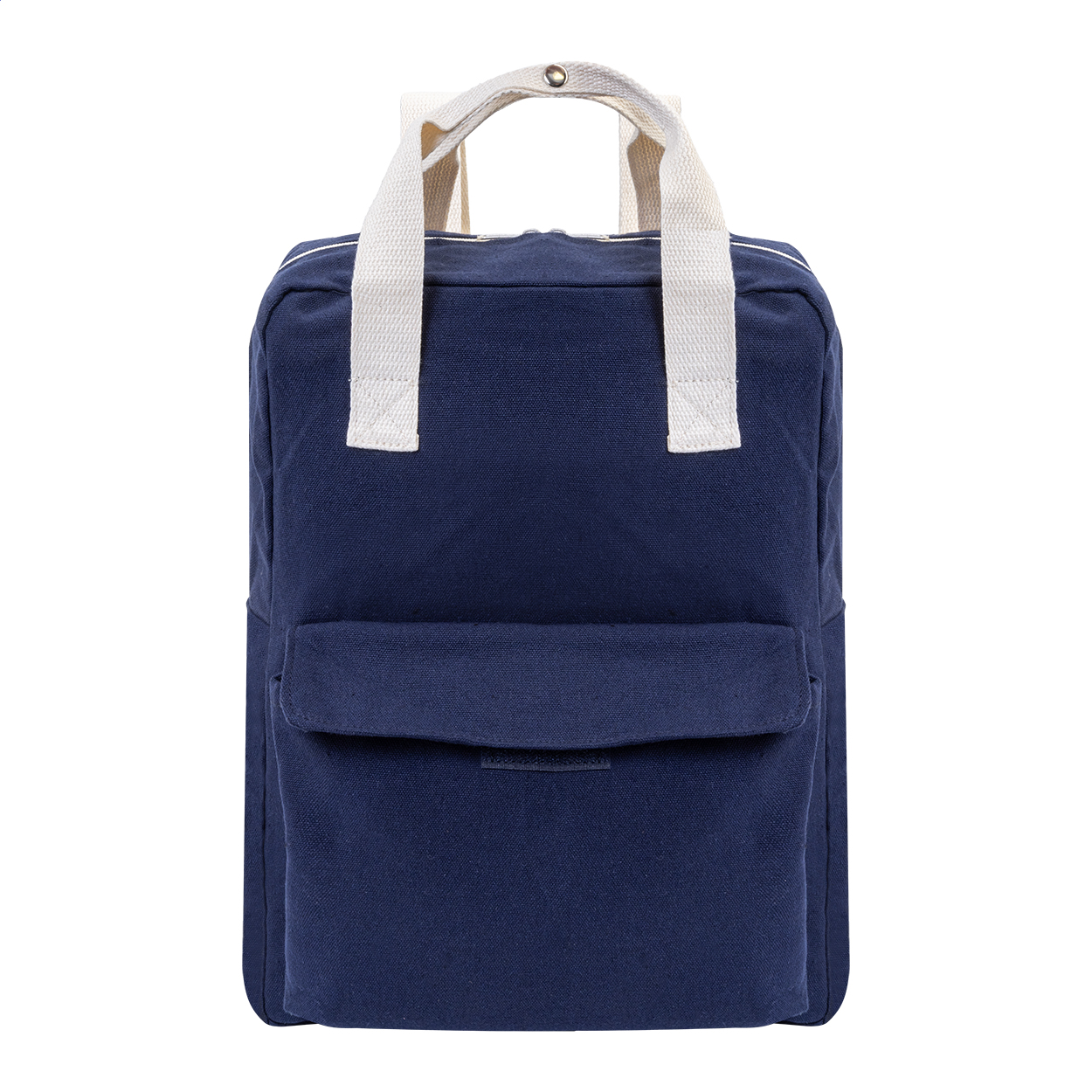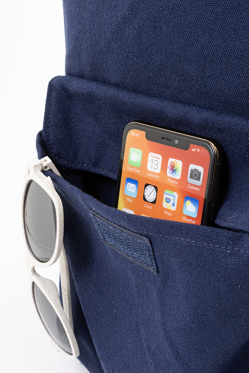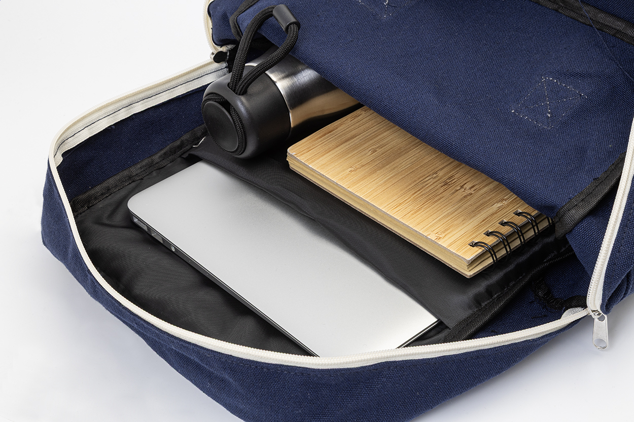 Rucksack aus recyceltem Canvas mit Reißverschluss-Haptfach, gepolstertem Laptopfach (13") und Fronttasche mit Klettverschluss. Material: 70% recycelte Baumwolle und 30% RPET Polyester. Mit Label RPET.