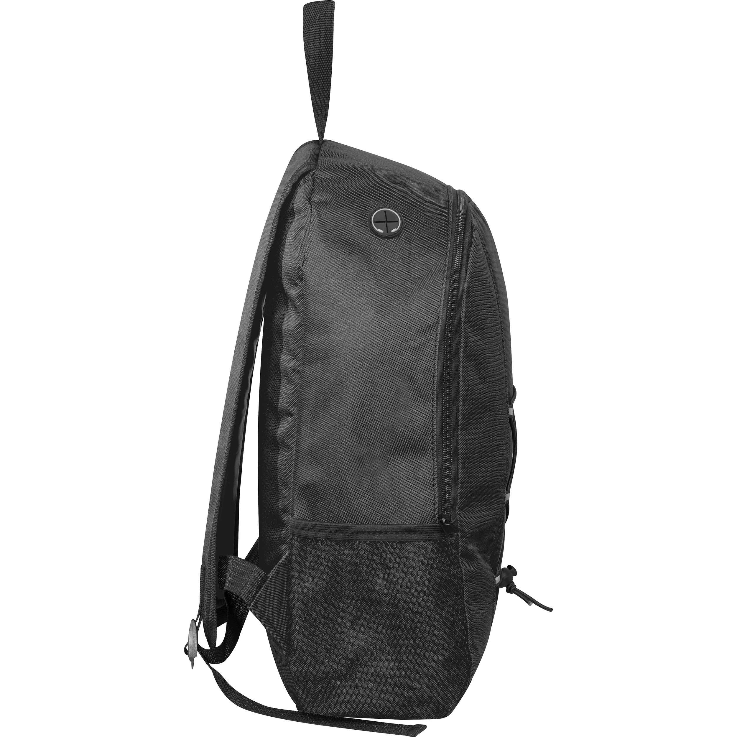 Rucksack aus 600D recyceltem Polyester mit Hängeschlaufe, zwei seitlichen Netztaschen sowie zwei gepolsterten Schultergurten. Ihre Werbung wird vorne auf den Rucksack gedruckt.