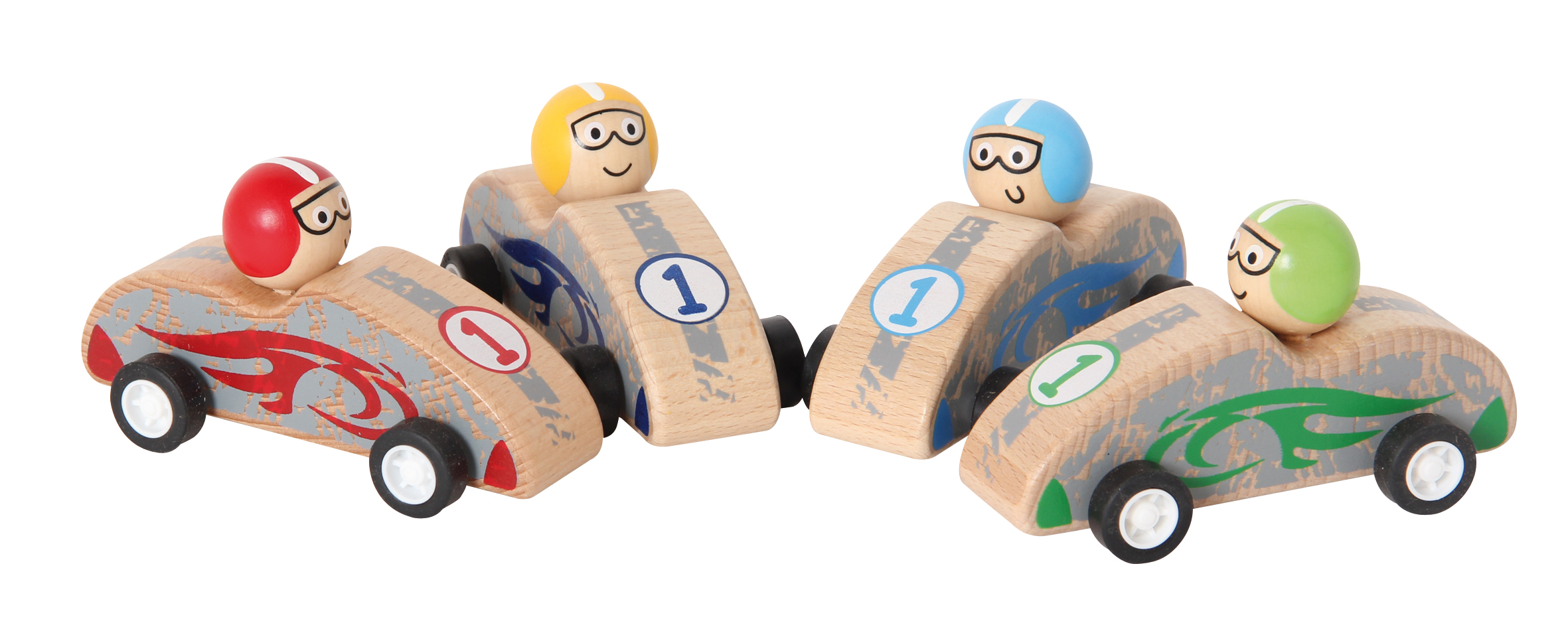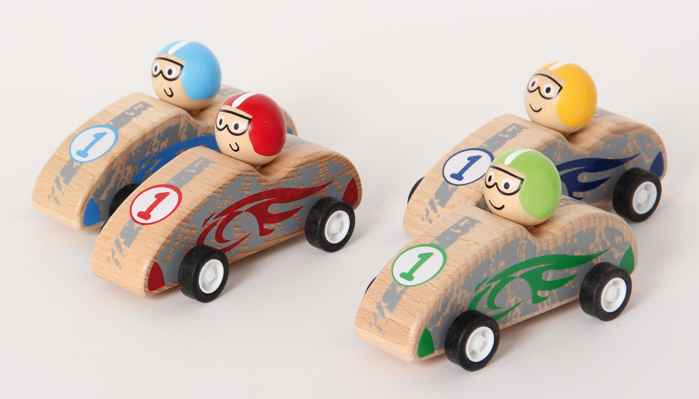 Massive Rückzug-Flitzer aus Holz in 4 Farben sortiert: blau, gelb, rot und grün.