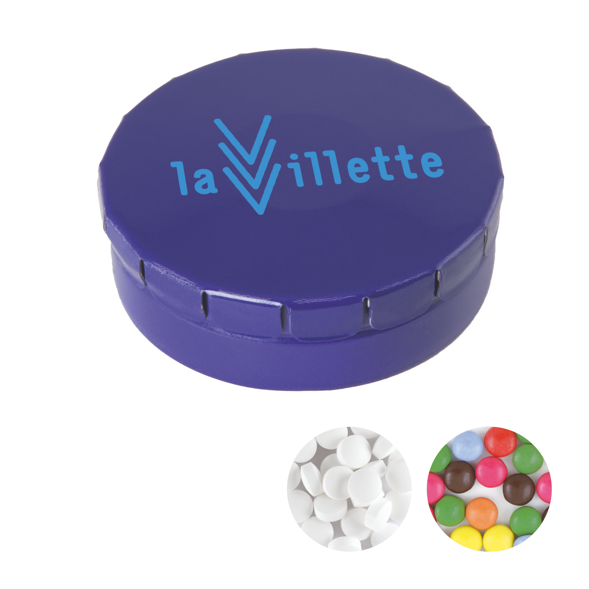 Runde Click-Blechdose Ø 45 mm x 15 mm mit ca. 12 gr. Minties, TAMPONDRUCK. Blechdose aus Metall, erhältlich in einer großen Farbenvielfalt mit verschiedenen Füllungen: Minties, extra strong Minties `Triangle`, Schokocarletties, Jelly Beans, Fruchtherzchen, Schokoperlen gold, knuspriger Schokoladen festival, knusprige schokoladen Juwelen, goldglitzer Milchschokolade, kleine Herzen gold, kleine Herzen rot / weiß, marmorgold Schoko dunkel, mikro Milchschokoladeneier, mini Schokoperlen gold, mini Schokoperlen kupfer, roseglitzer Milchschokolade, silberglitzer Milchschokolade oder sommerkonfetti Schoko dunkel.