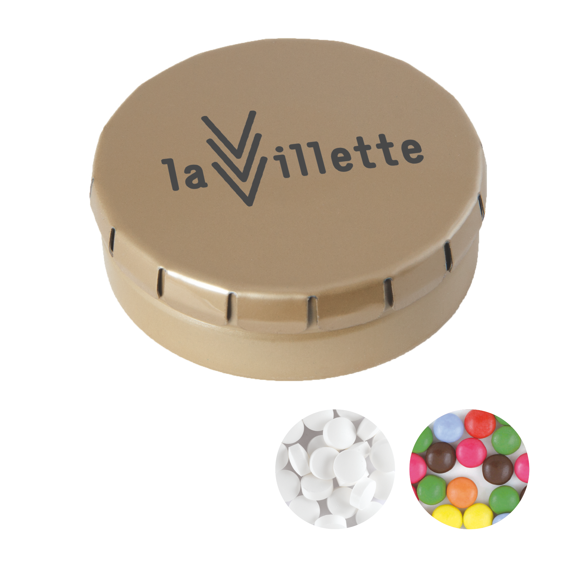 Runde Click-Blechdose Ø 45 mm x 15 mm mit ca. 12 gr. Minties, TAMPONDRUCK. Blechdose aus Metall, erhältlich in einer großen Farbenvielfalt mit verschiedenen Füllungen: Minties, extra strong Minties `Triangle`, Schokocarletties, Jelly Beans, Fruchtherzchen, Schokoperlen gold, knuspriger Schokoladen festival, knusprige schokoladen Juwelen, goldglitzer Milchschokolade, kleine Herzen gold, kleine Herzen rot / weiß, marmorgold Schoko dunkel, mikro Milchschokoladeneier, mini Schokoperlen gold, mini Schokoperlen kupfer, roseglitzer Milchschokolade, silberglitzer Milchschokolade oder sommerkonfetti Schoko dunkel.