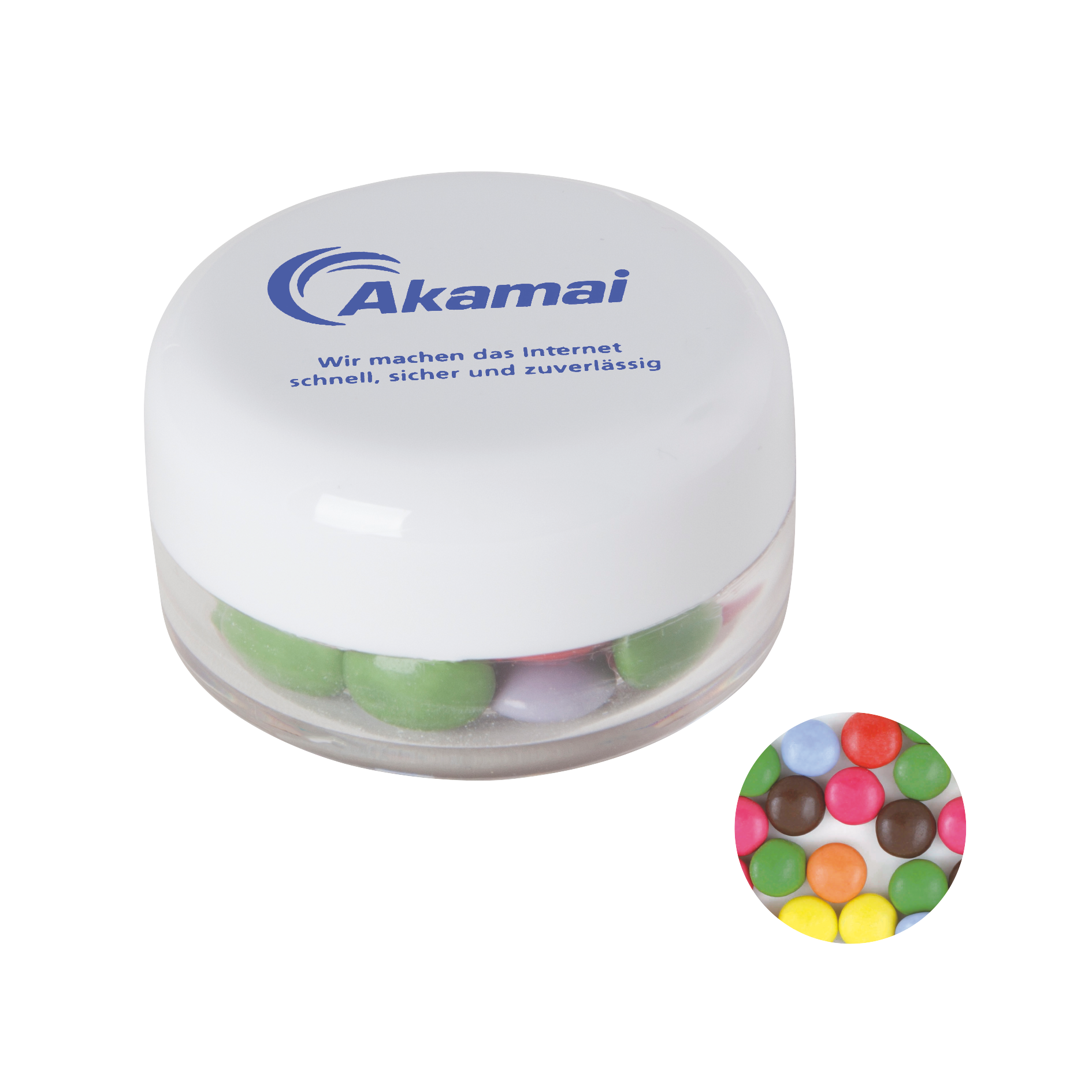 Runde Plastikdose ø 45 x 25 mm mit farbigem Deckel gefüllt mit ca. 12 gr. Schokocarletties, TAMPONDRUCK
