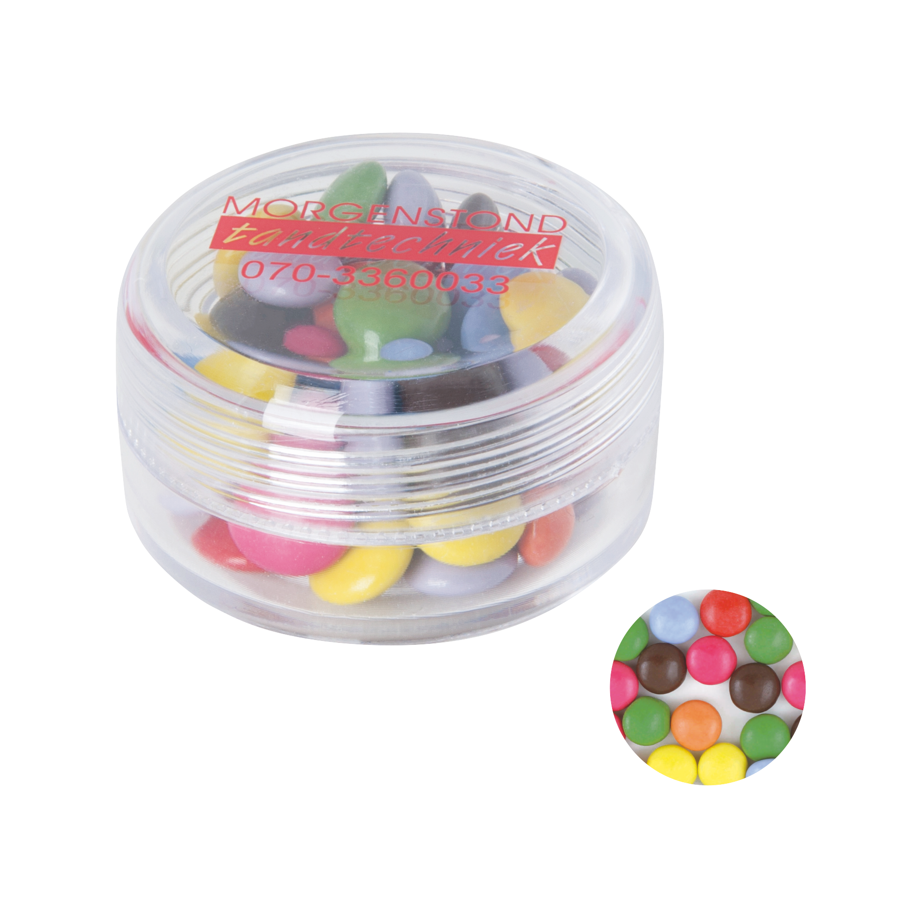 Runde Plastikdose ø 45 x 25 mm mit farbigem Deckel gefüllt mit ca. 12 gr. Schokocarletties, TAMPONDRUCK