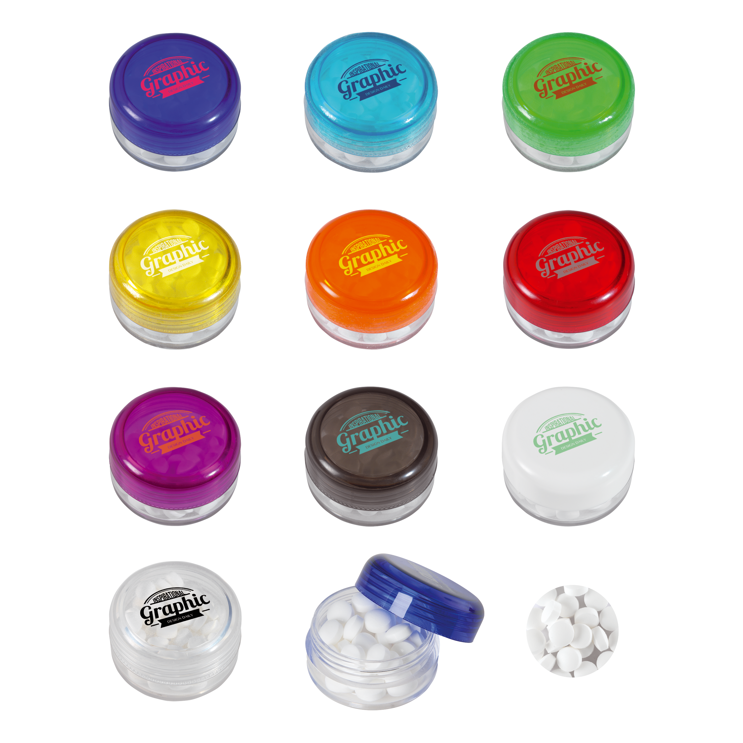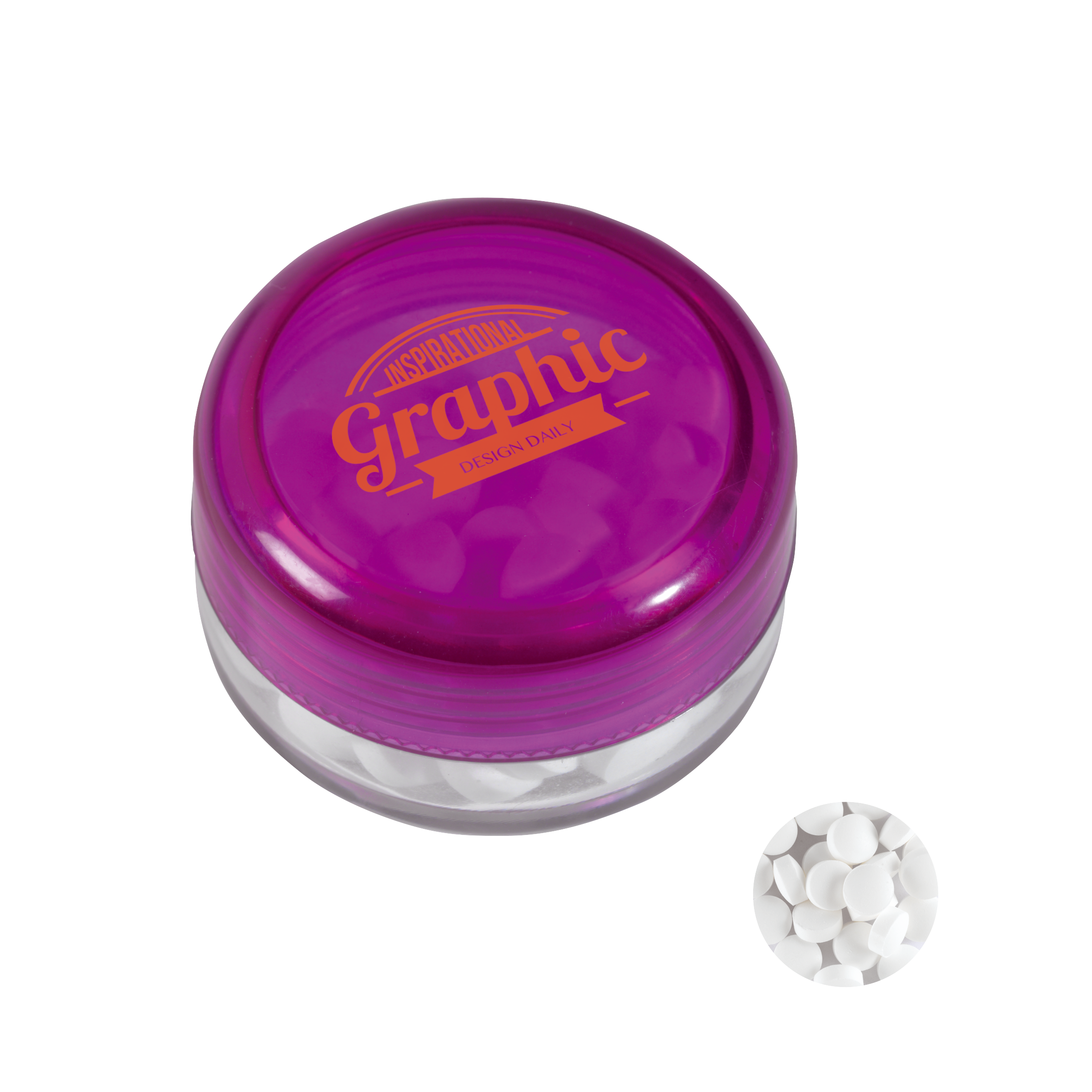 Runde Plastikdose ø 45 x 25 mm mit farbigem Deckel gefüllt mit ca.12 gr. extra strong Minties `Triangle` TAMPONDRUCK