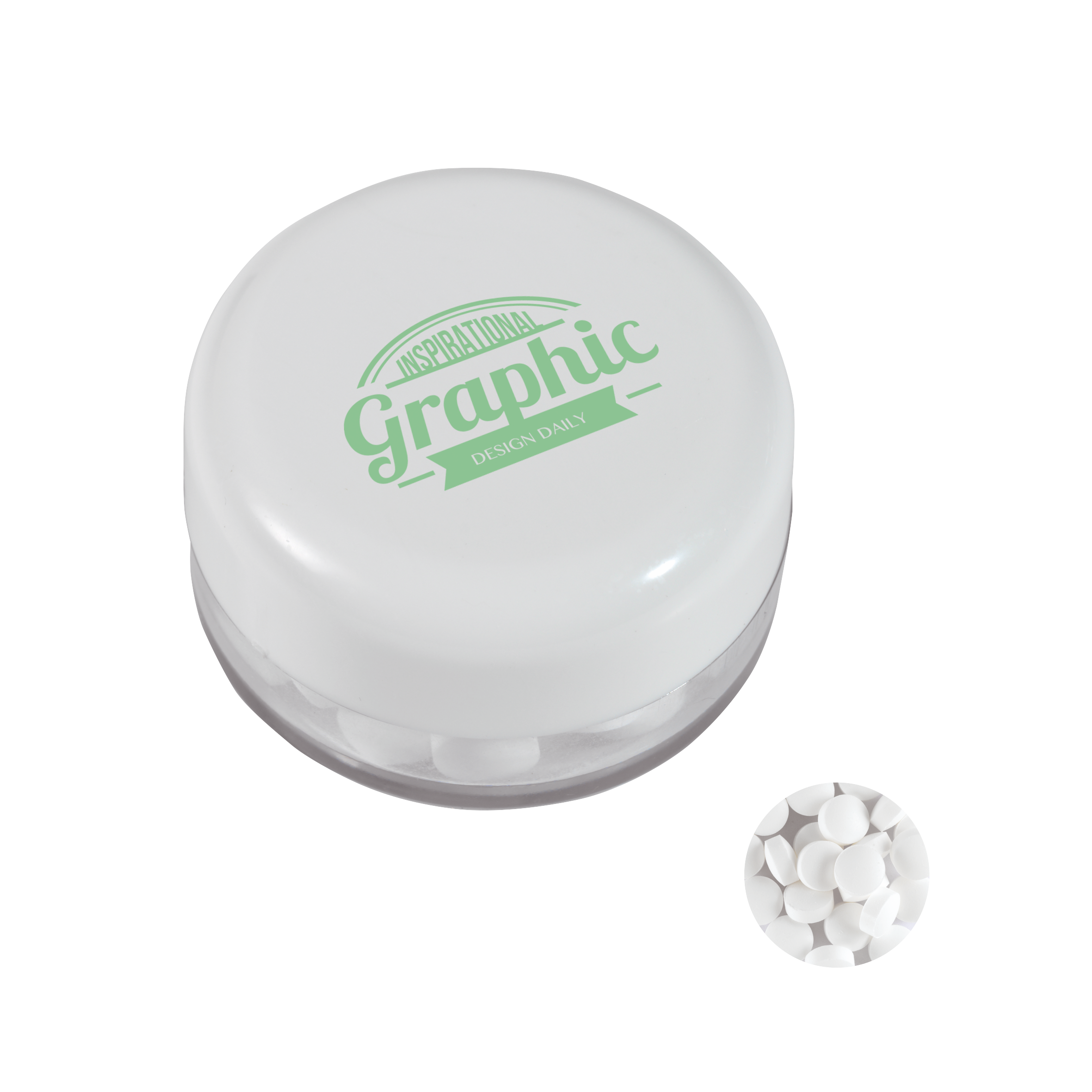 Runde Plastikdose ø 45 x 25 mm mit farbigem Deckel gefüllt mit ca.12 gr. extra strong Minties `Triangle` TAMPONDRUCK