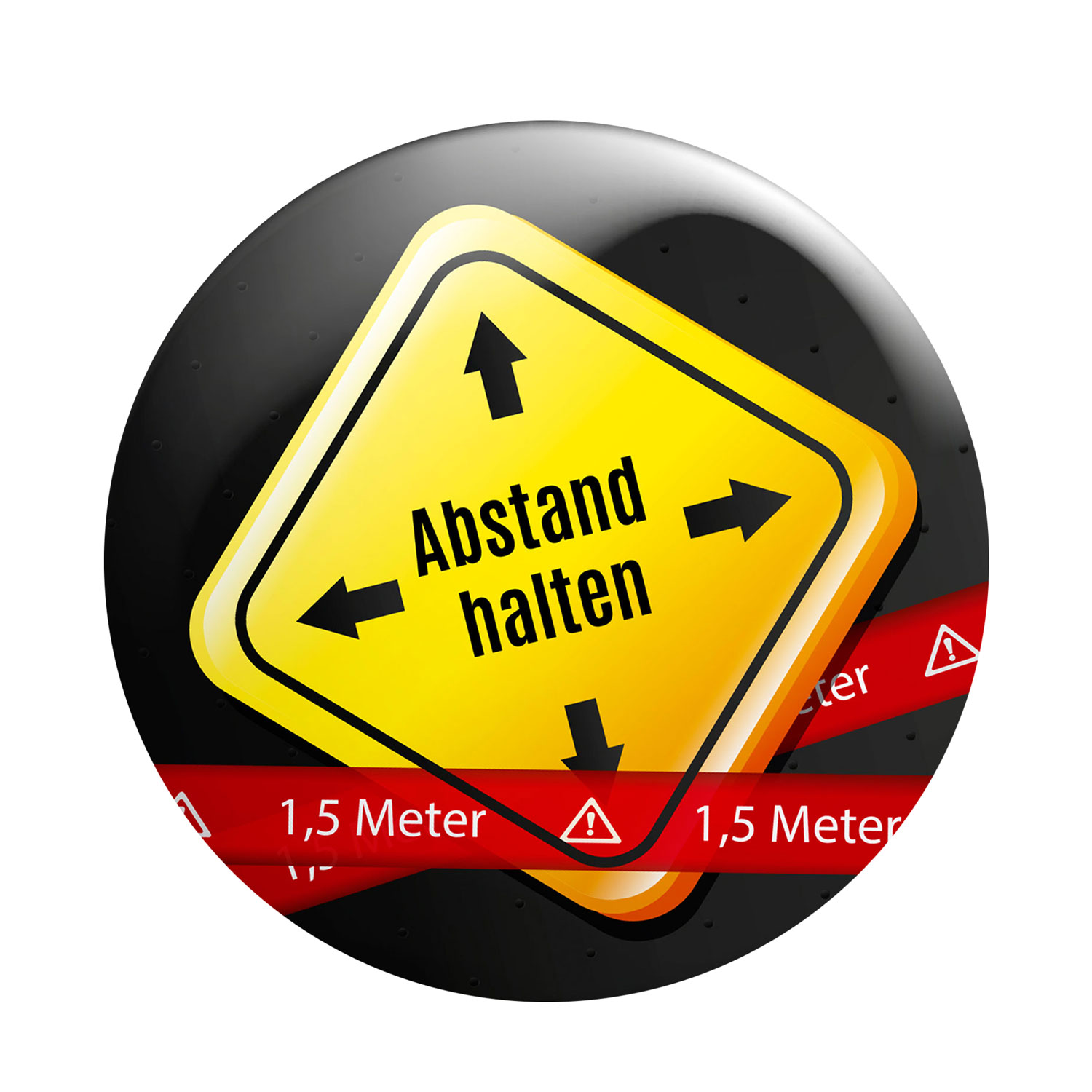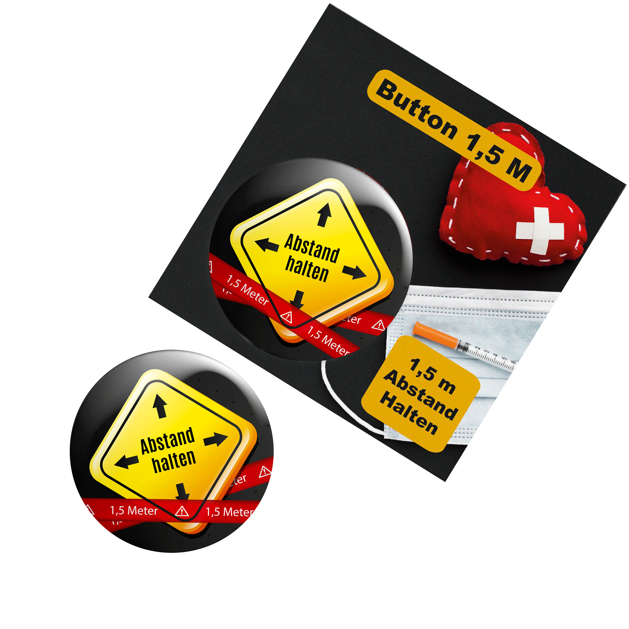 Runder Button Ø 56 mmm, aus Metall mit Nadel-Mechanik. Inklusive Standardmotiv "Abstand halten 1,5 Meter". Alternativ kann der Button auf einer bedruckten Karte geliefert werden. Die Karte wird individuell nach 4c-Euroskala 1-seitig bedruckt.