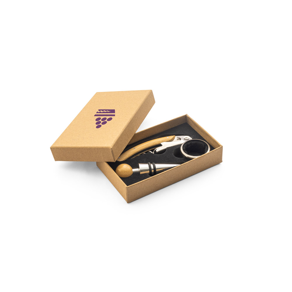 Weinset aus Bambus und Edelstahl. Enthält: 1 Korkenzieher, 1 Stöpsel und 1 Metallring. Lieferung in einer Geschenkbox aus Kraftpapier. Da dieses Produkt aus natürlichen Materialien hergestellt wird, können Produktfarbe und Aufdruck von Produkt zu Produkt variieren. 161 x 100 x 27 mm