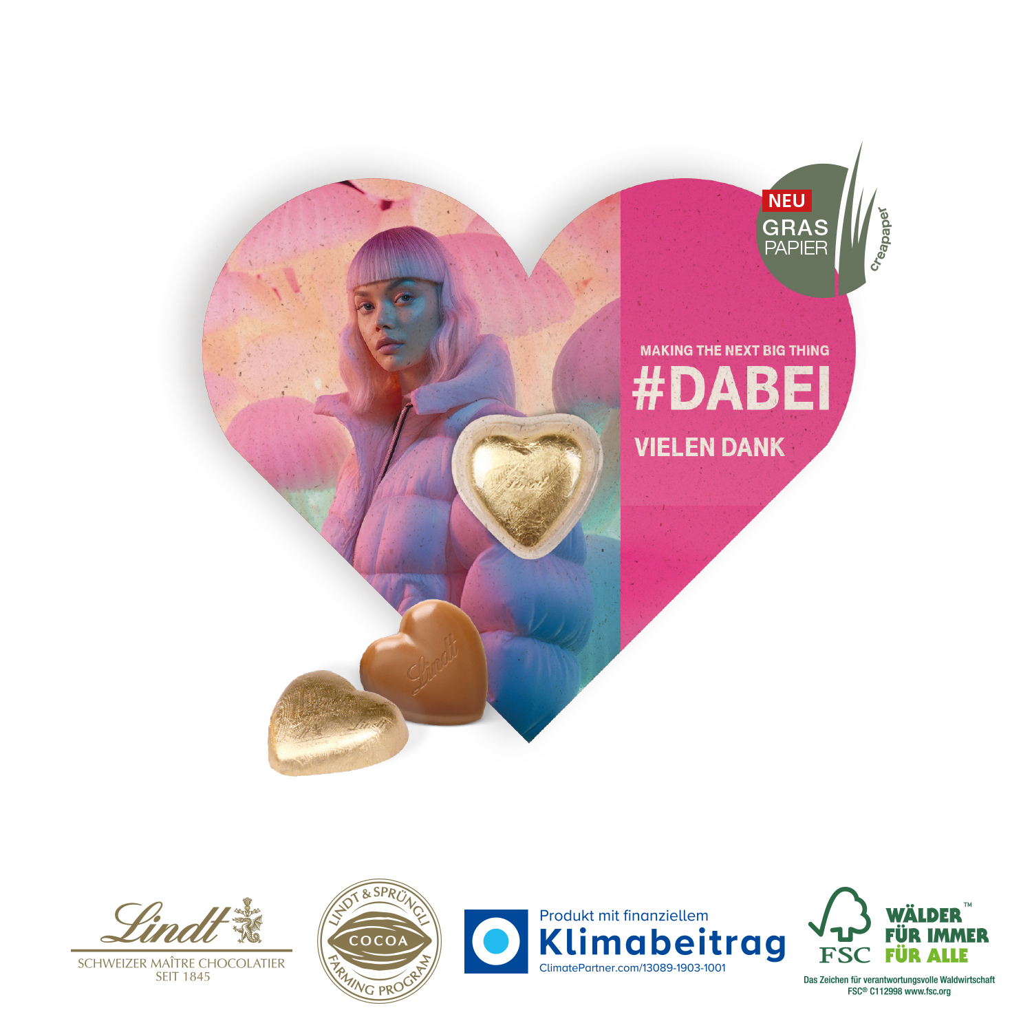 Kreativ, individuell und vielseitig! Ihre individuelle Werbebotschaft, kombiniert mit einem zartschmelzenden Lindt Schokoherz. Eine süßer Gruß mit Genussmoment! Sie wählen die Form: Ob rund, rechteckig, in Herzform oder als Anhänger, damit wird Ihre Werbeaktion zum Volltreffer.