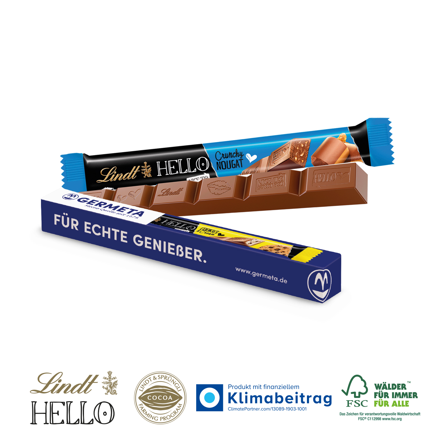 1 Schokoladen-Stick von Lindt "HELLO". Geschmacksrichtungen Strawberry Cheesecake, Crunchy Nougat (ca. 39 g).