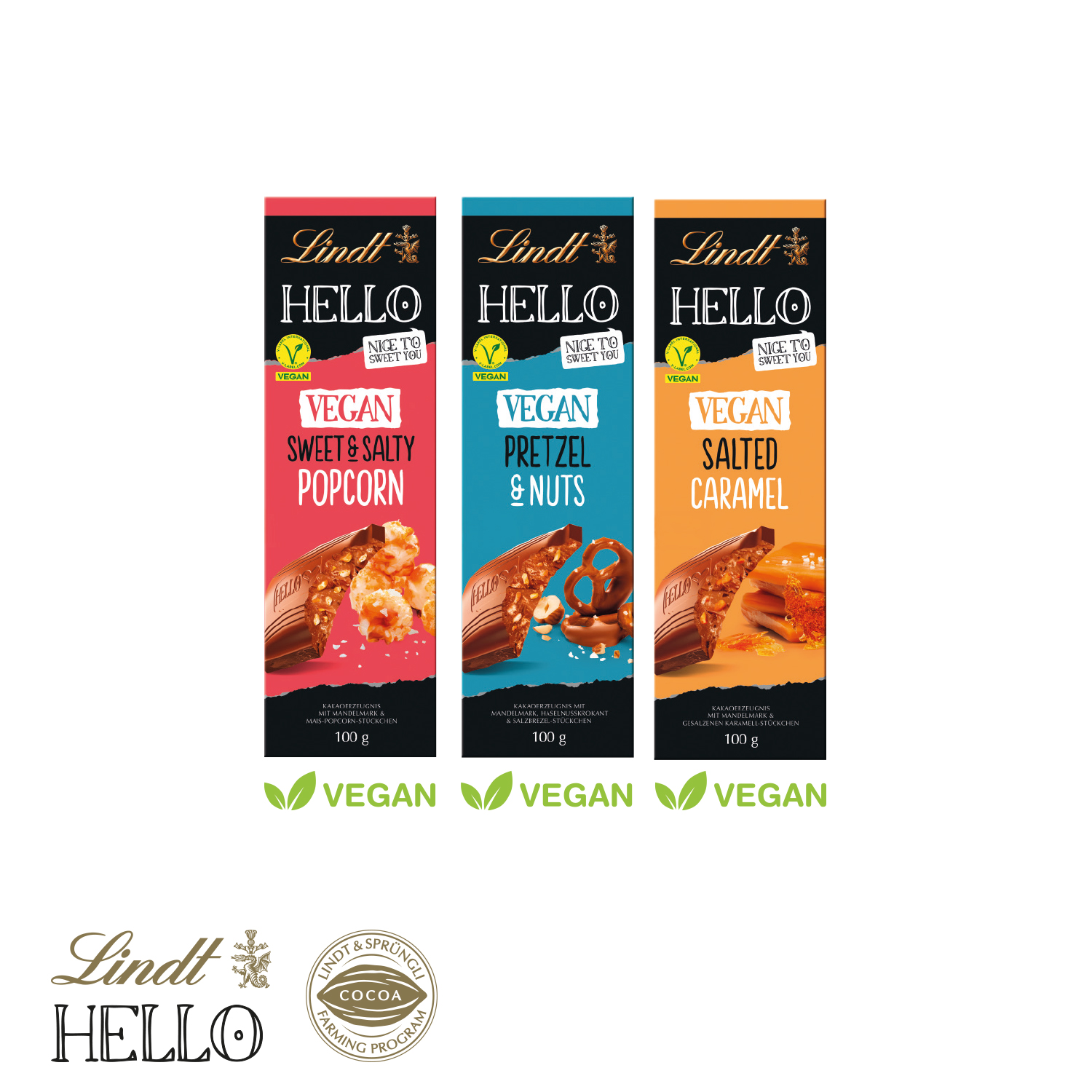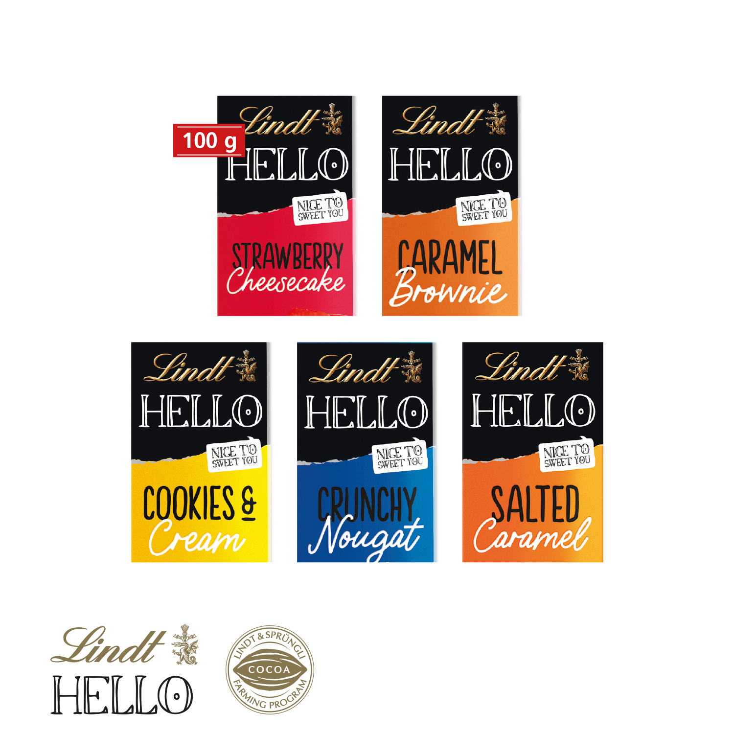 1 Schokoladentafel von Lindt "HELLO" (100 g). Geschmacksrichtungen Strawberry Cheesecake, Crunchy Nougat, Salted Caramel