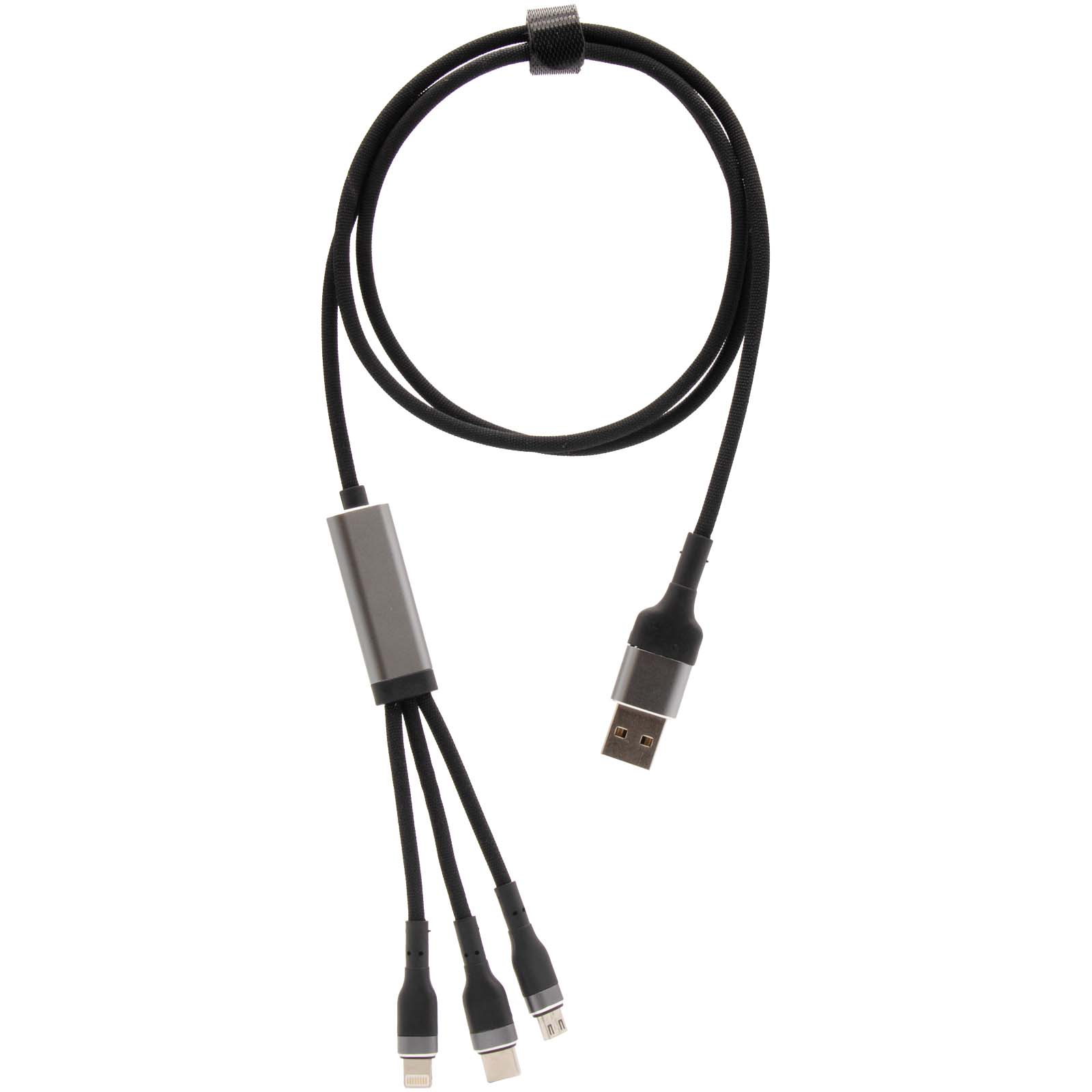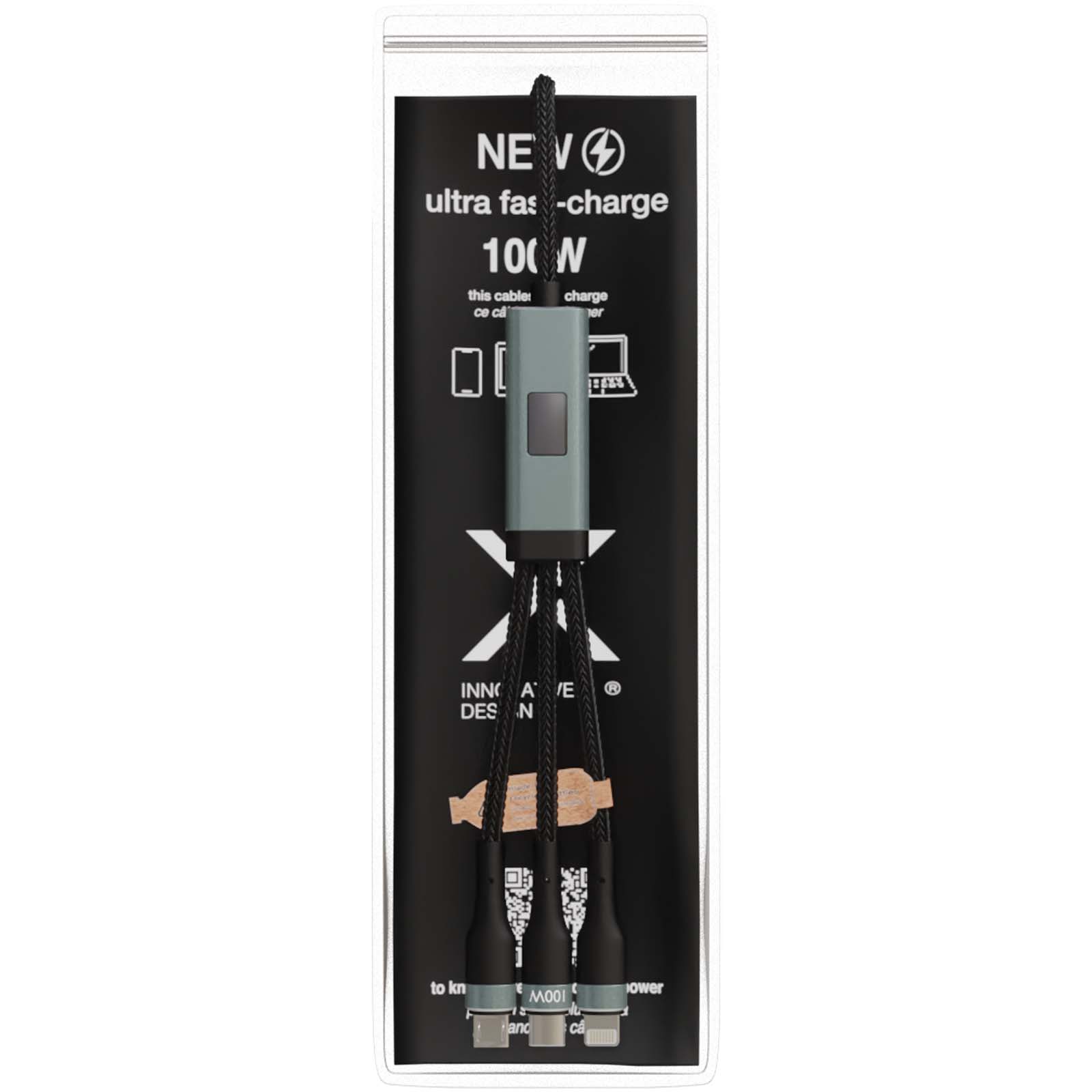 Ultraschnelles 5-in-1 Ladekabel mit 100W aus rPET zum Aufladen von Smartphones, Tablets und Laptops. Der duale USB-A- und USB-C-Eingang macht das Kabel 100 % kompatibel mit den neuesten Computermodellen. Output: Typ-C, Micro USB und Lightning. Geliefert mit einer wiederverwertbaren Tasche aus TPU und einer Einlage aus recyceltem Papier. Länge des Kabels: 1 Meter.