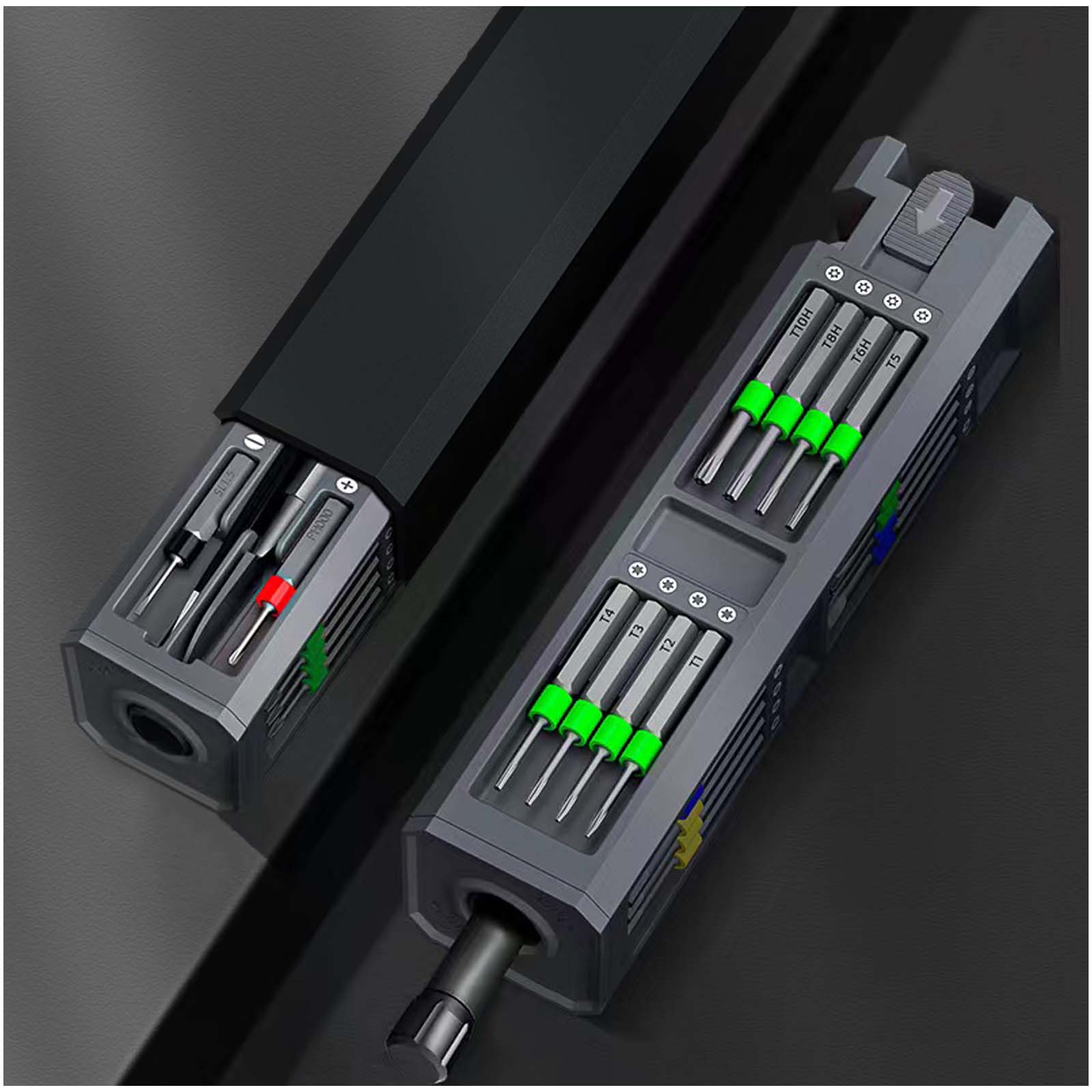 30-teiliger Präzisionsschraubendreher-Satz mit 28 Bits und zwei Zubehörteilen. Das Gehäuse aus eloxiertem Aluminium (15 x 3,6 x 3,6 cm) kann mit einem eingravierten Logo personalisiert werden. Das kompakte Gehäuse macht es einfach, alles an einem Ort aufzubewahren. Der Handschraubendreher eignet sich perfekt für die Reparatur von Kleingeräten und ist dank seiner Form leicht zu handhaben. Er verfügt über eine Vielzahl von Bits, die ihn universell für viele Arten von Heimwerkerarbeiten einsetzbar machen. Jeder Bit-Typ ist mit einer anderen Farbe gekennzeichnet, damit er leicht zu identifizieren ist. Die Bits werden magnetisch im Schraubendreher gehalten. Das Set enthält auch eine Pinzette zum Aufnehmen kleinerer Gegenstände und ein Brecheisen zum Anheben und Öffnen von Verpackungen. Verpackt in einer Geschenkbox (17 x 55 x 43,5 cm) mit Magnetverschluss. Inklusive 3 Jahre Garantie.