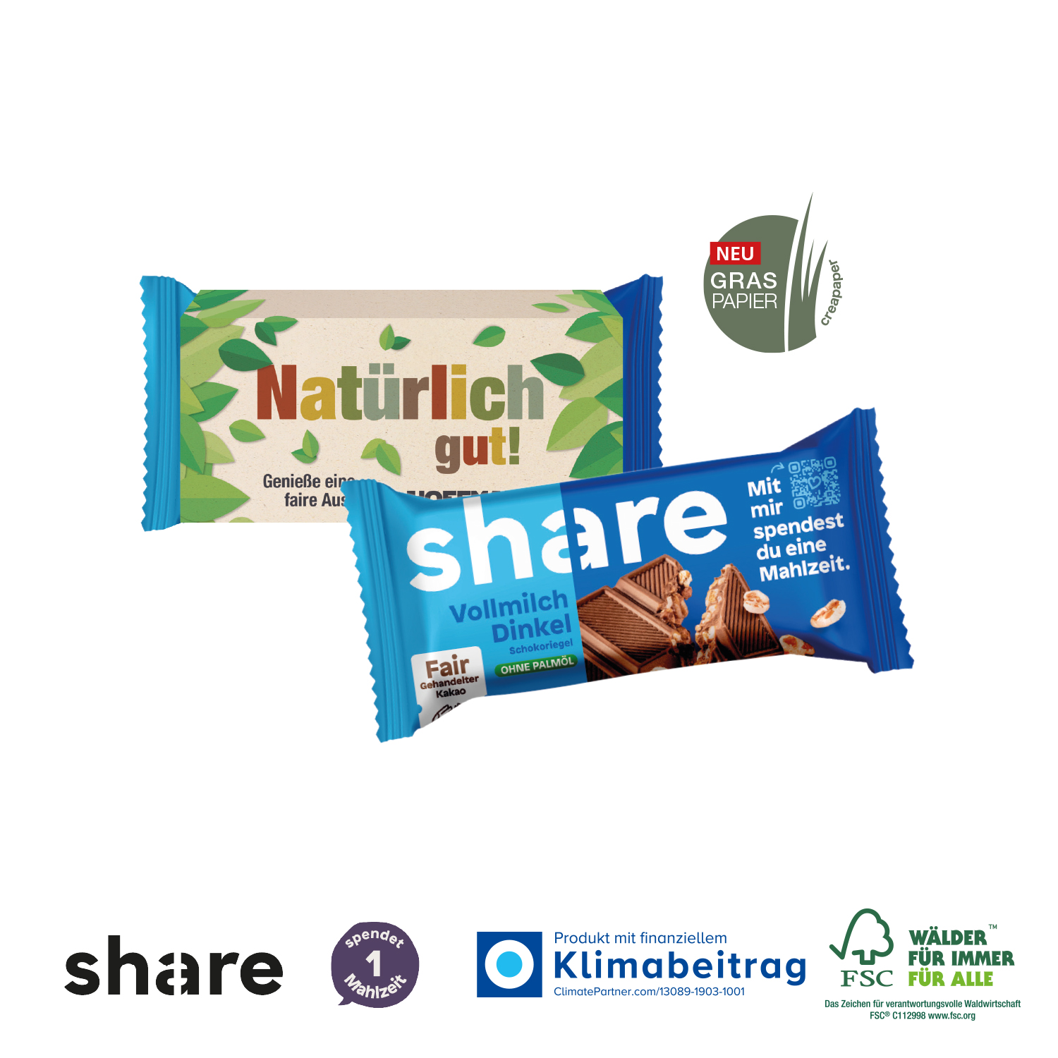 Genießen und dabei Gutes tun! Fairdammt lecker & sozial: Die neuen Share Schokoriegel aus gepufftem Dinkel sind nicht nur sozial, sondern auch richtig lecker! Hergestellt in Deutschland aus feinster Vollmilchschokolade mit Kakao aus fairem Handel. Die Kombination aus Dinkel und süßer Schokolade ist perfekt als kleiner Snack zwischendurch.